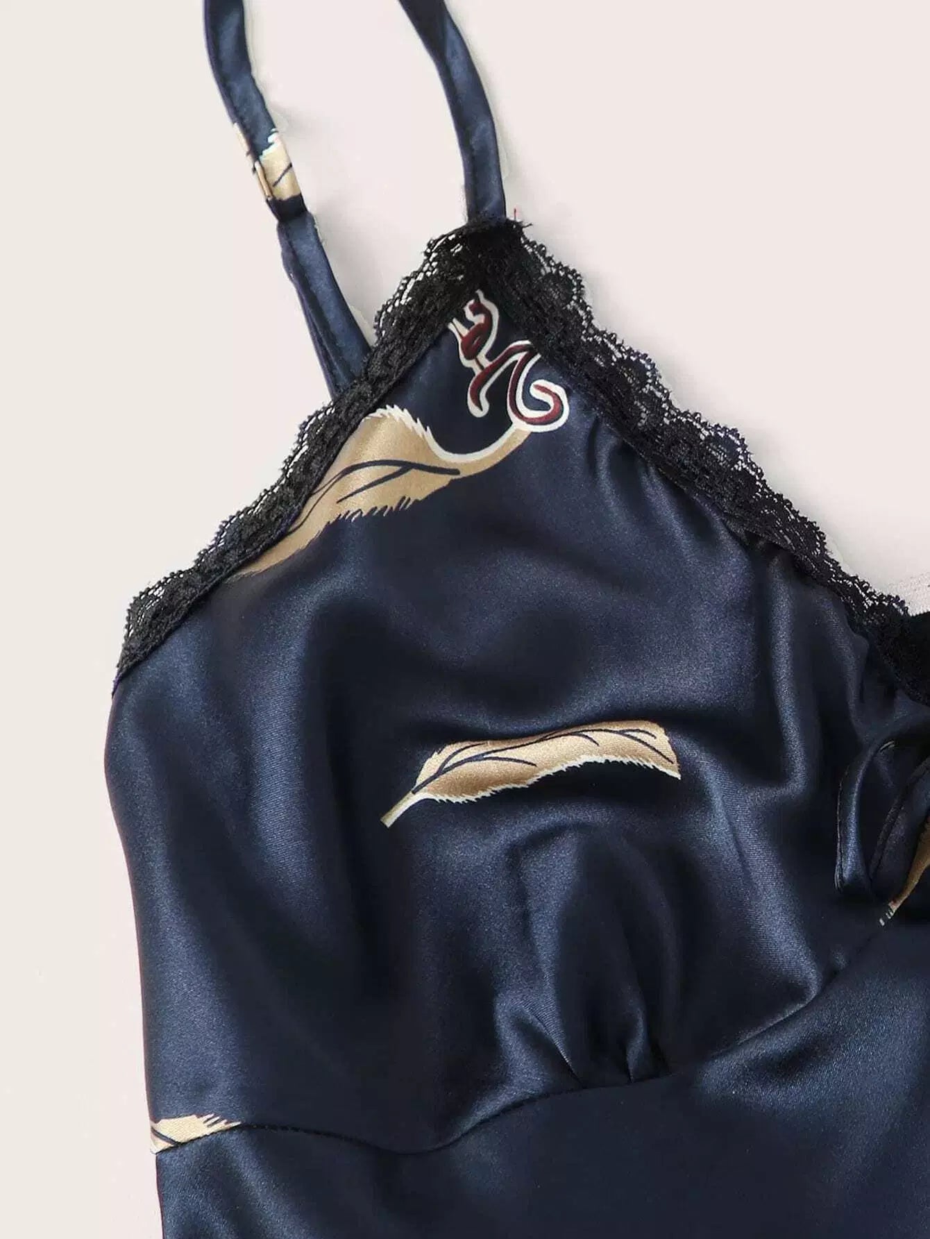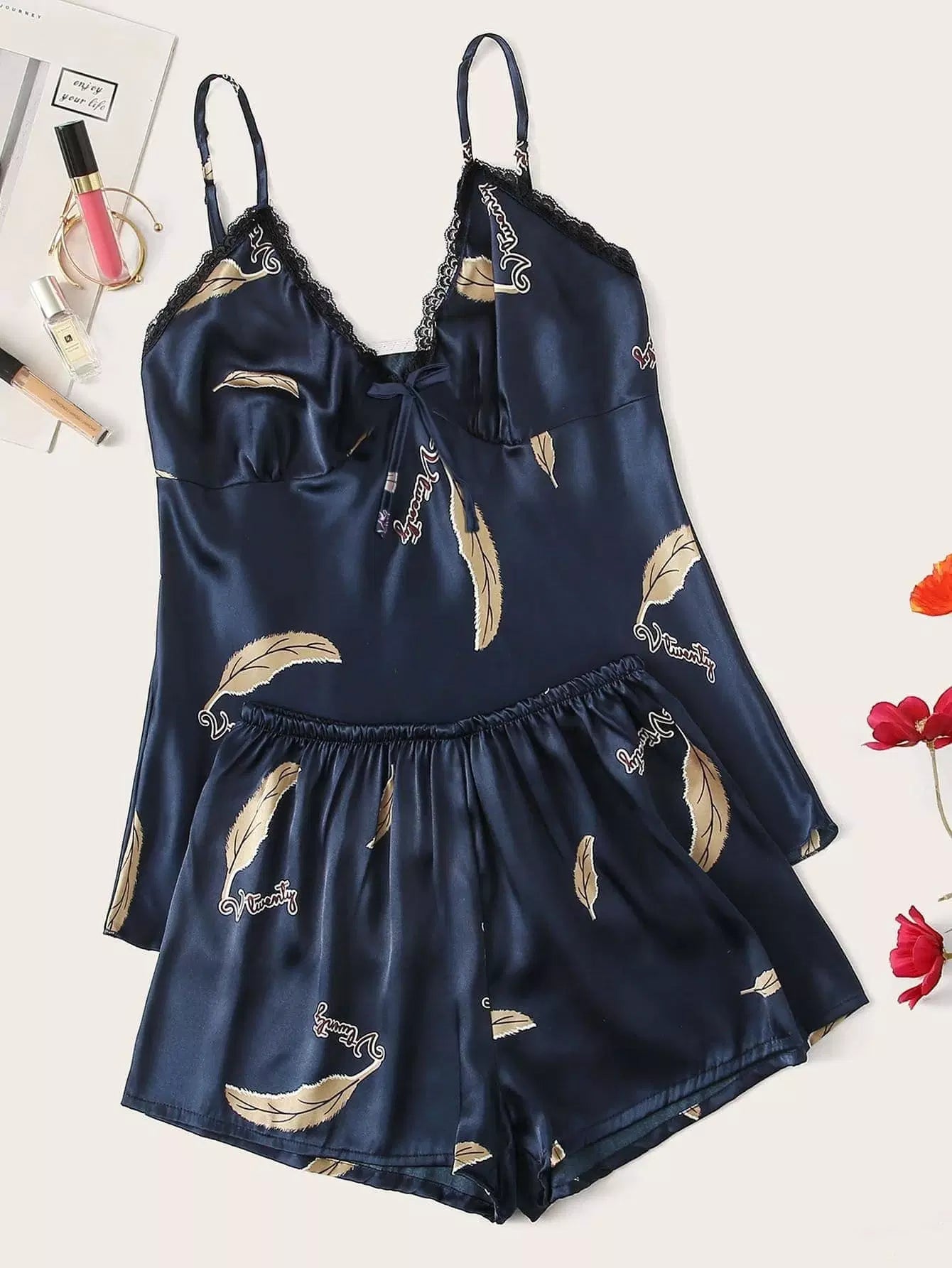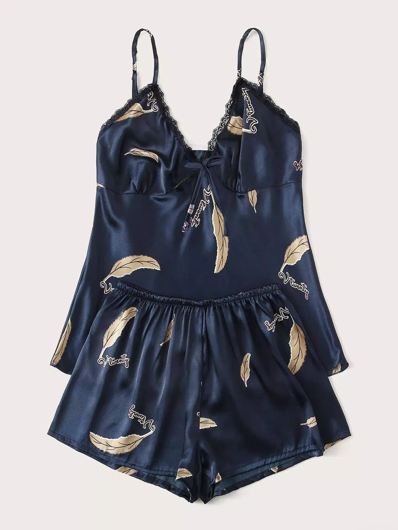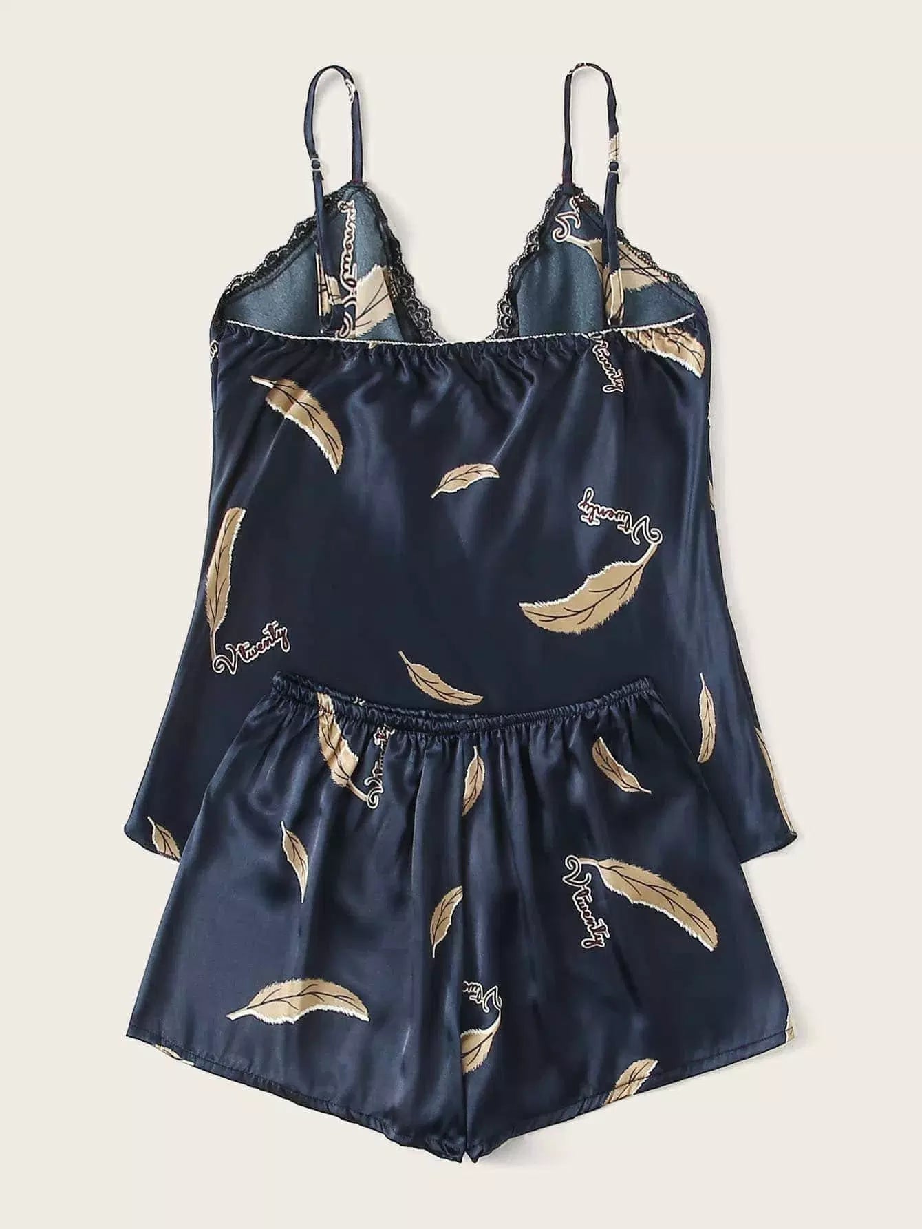 Plus Lace Trim Feather Print Satin Cami PJ Set