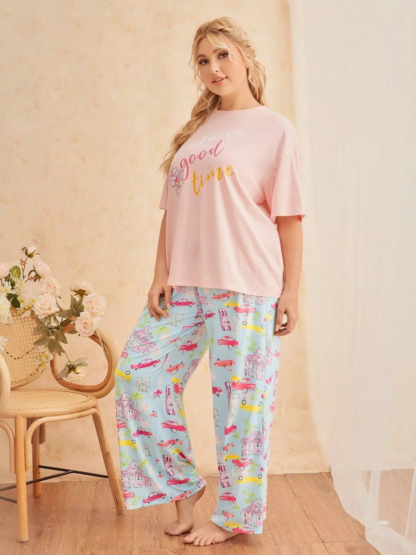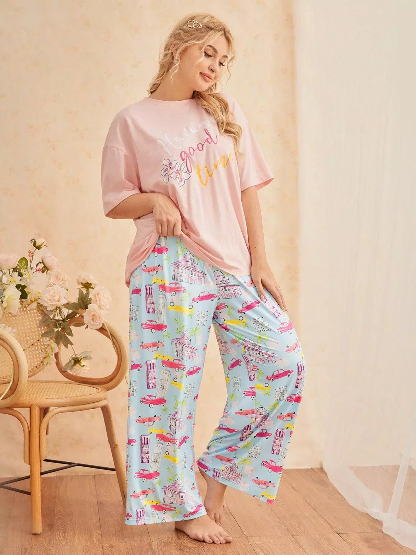 Plus Letter & Floral Print Tee and Pants PJ Set