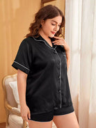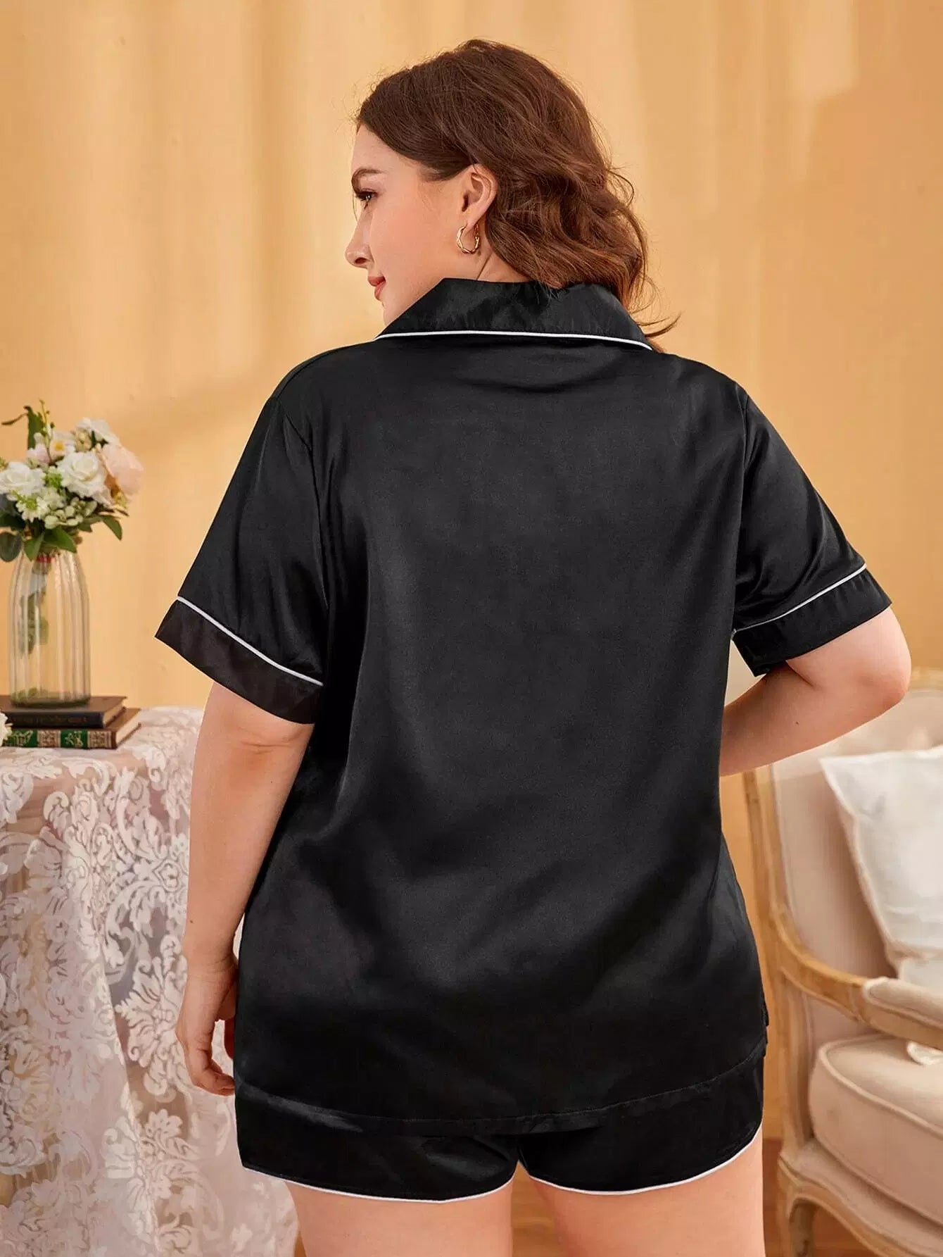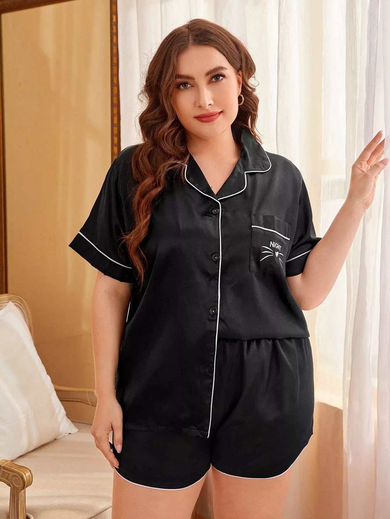 Plus Letter & Heart Embroidery Contrast Binding Pajama Set