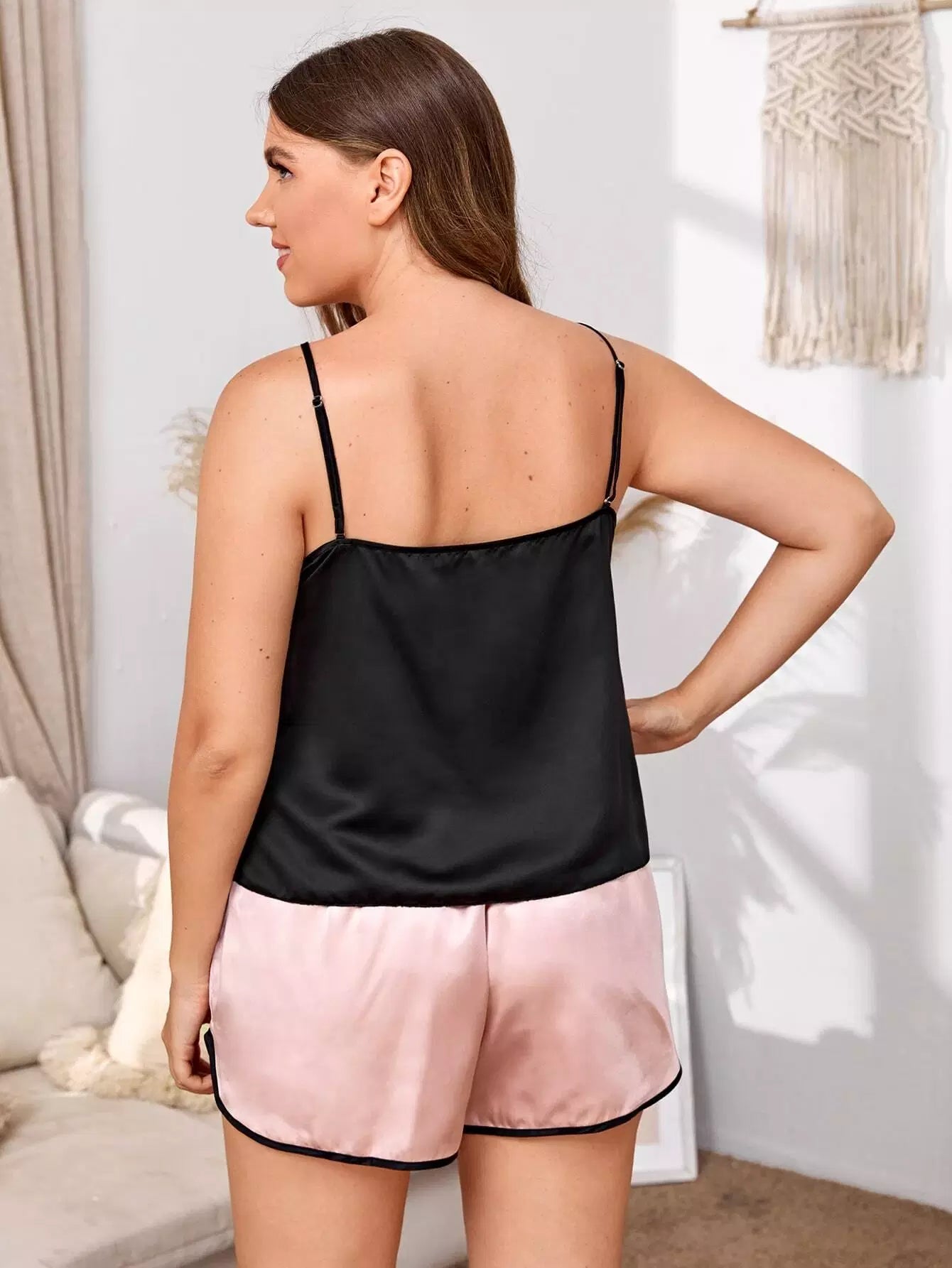 Plus Satin Contrast Lace Knot Detail Cami PJ Set