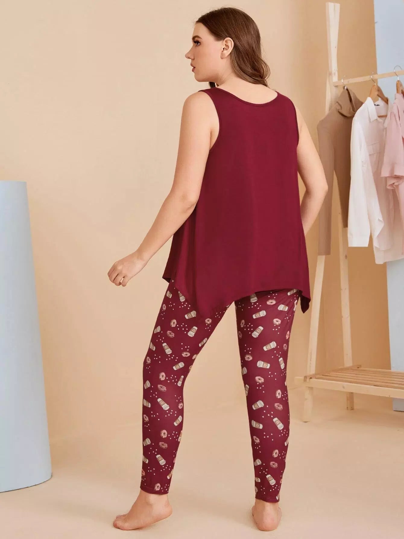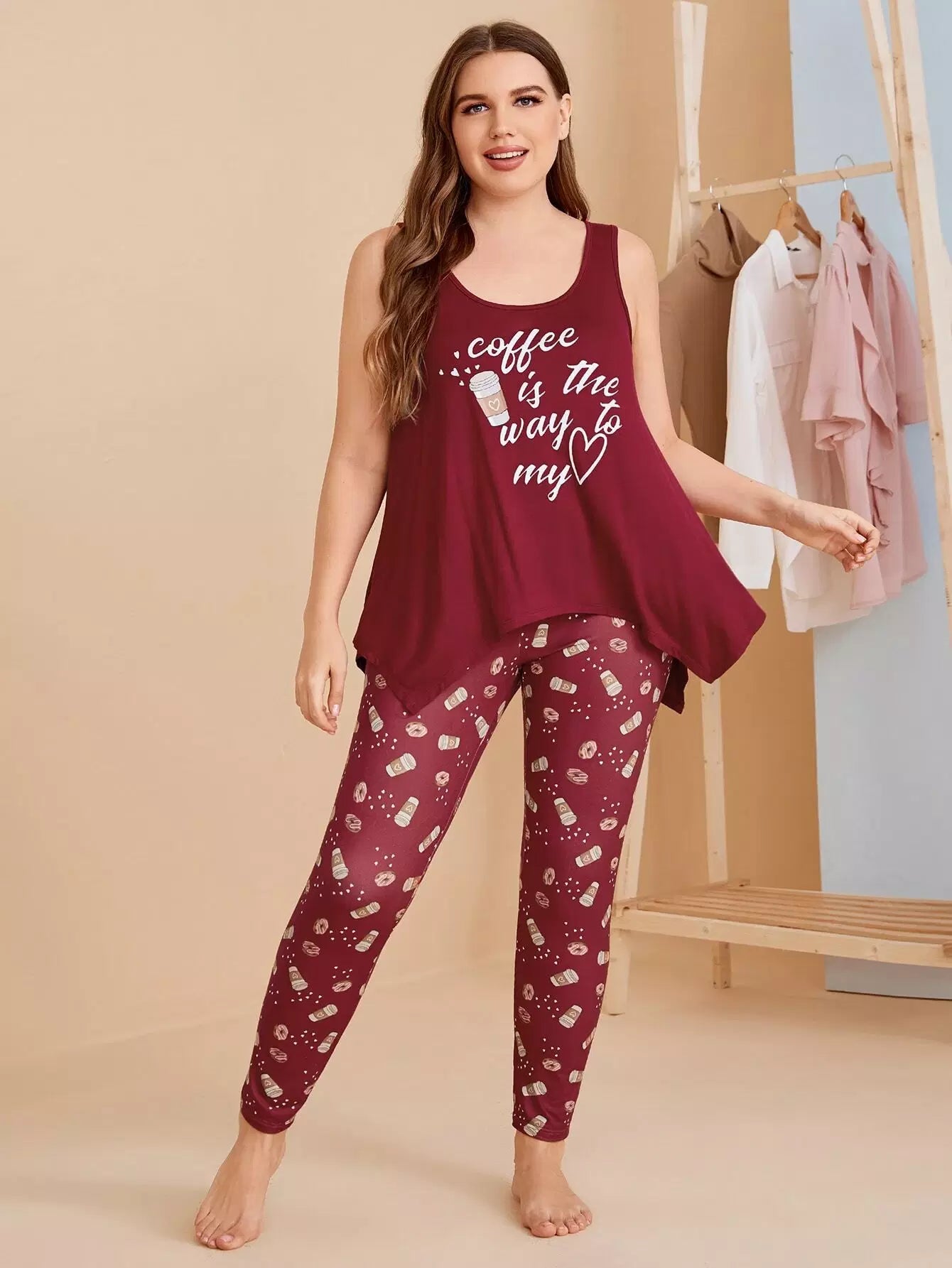 Plus Slogan Graphic Hanky Hem Tank Top & Graphic Print Pants PJ Set