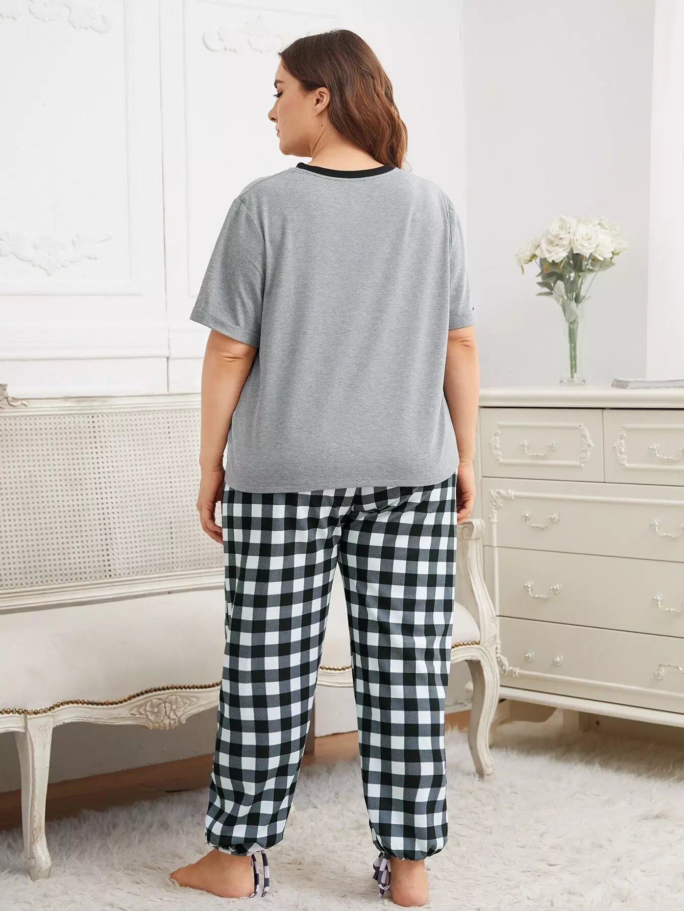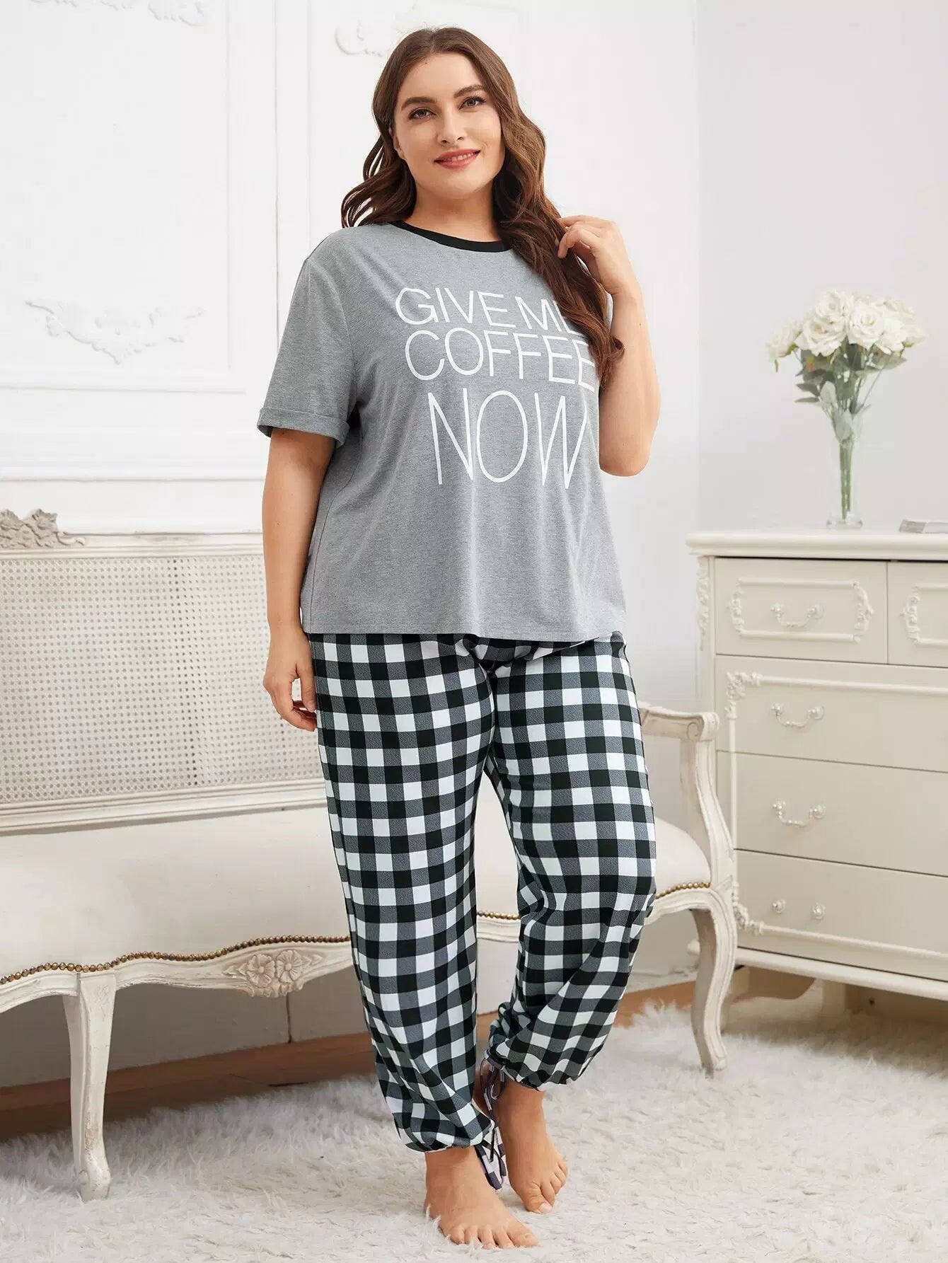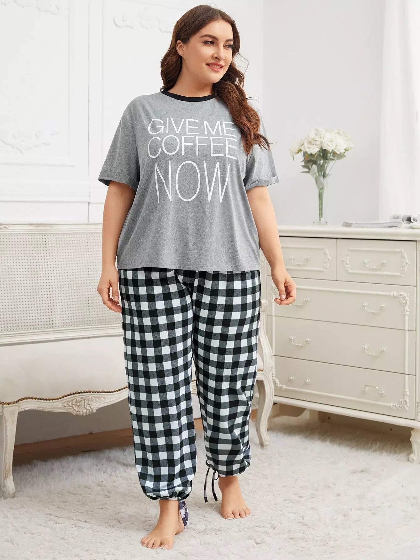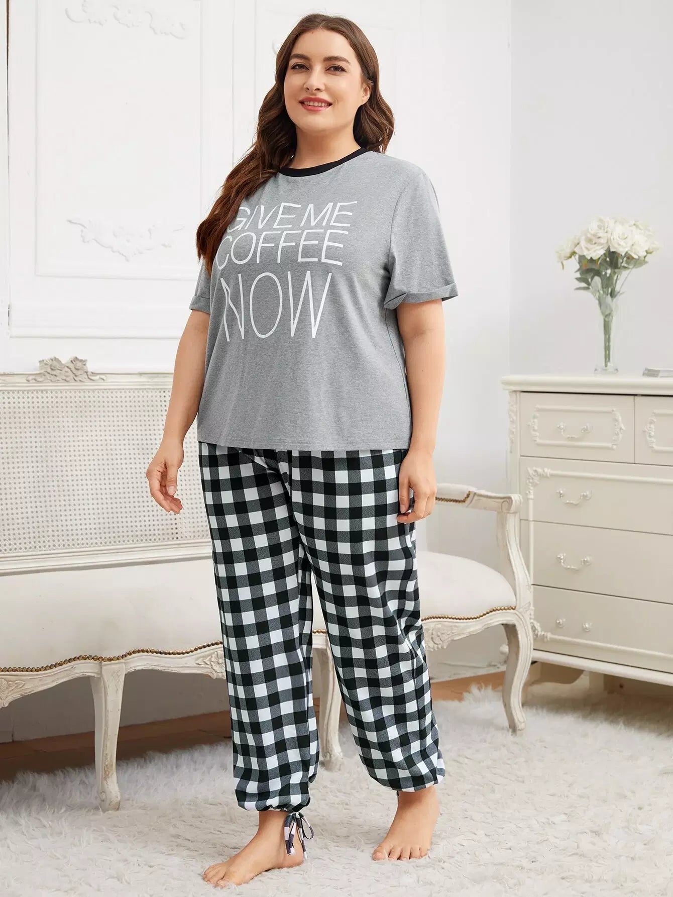 Plus Slogan Graphic Top & Knot Hem Gingham Pants PJ Set