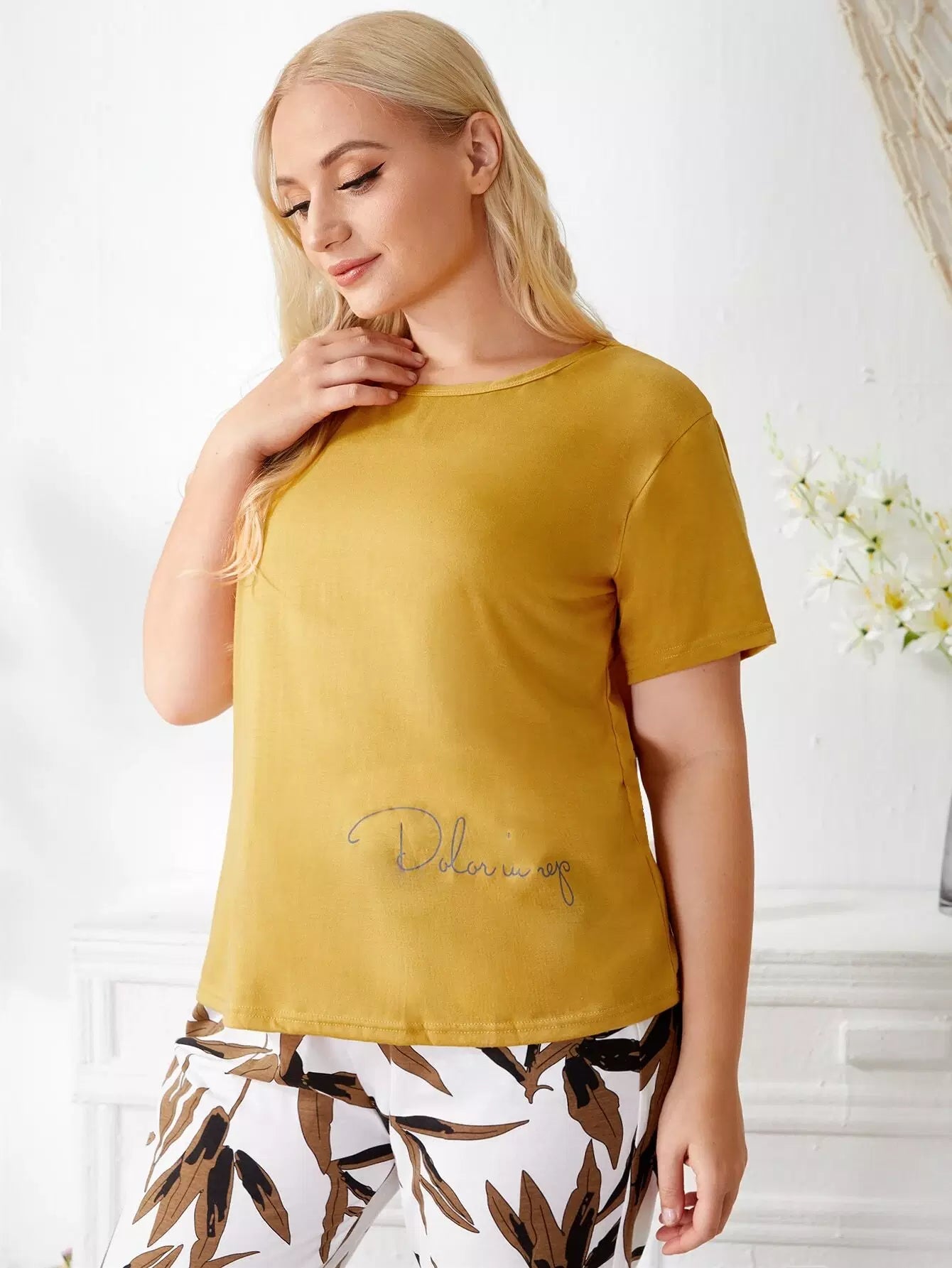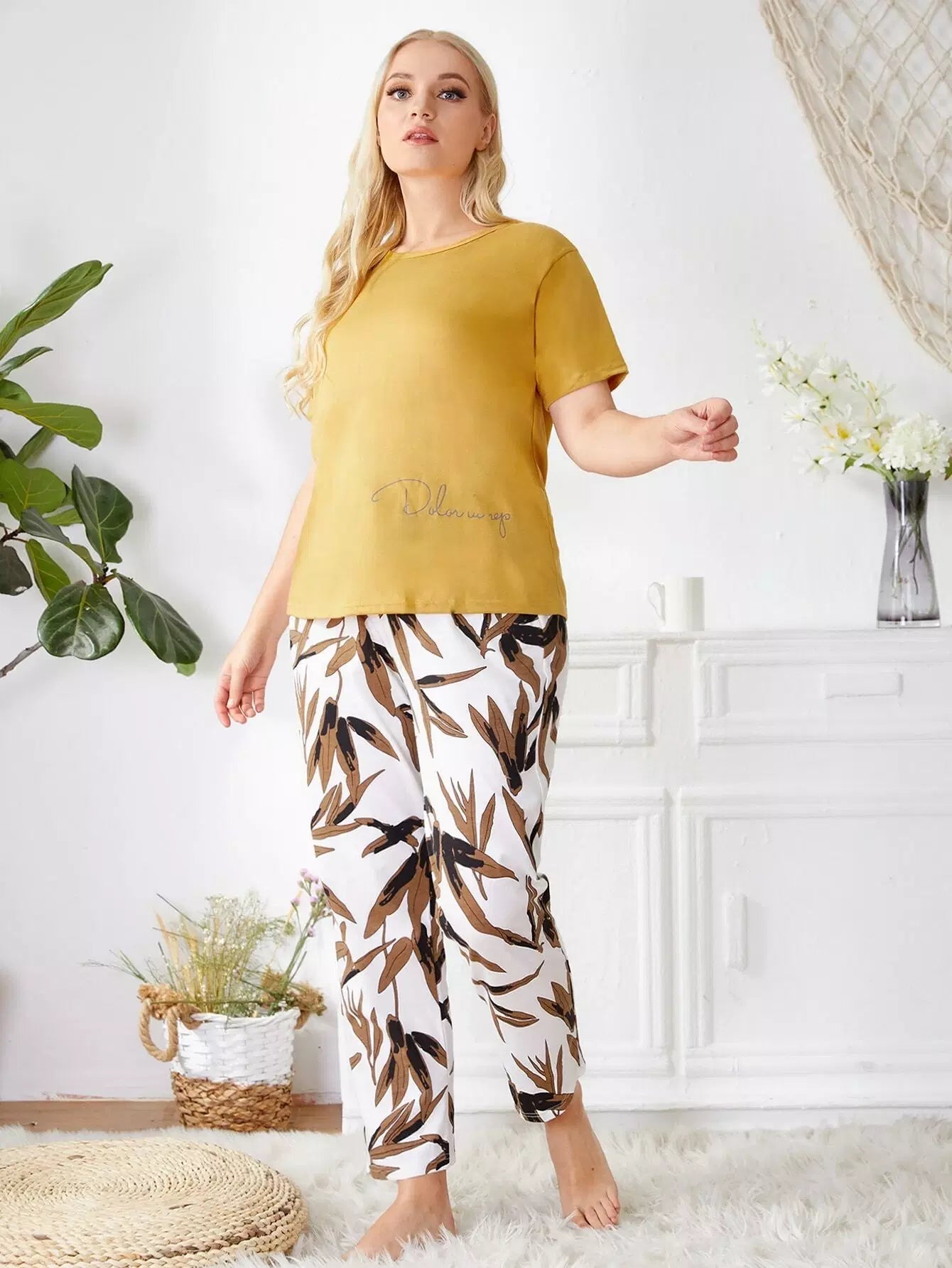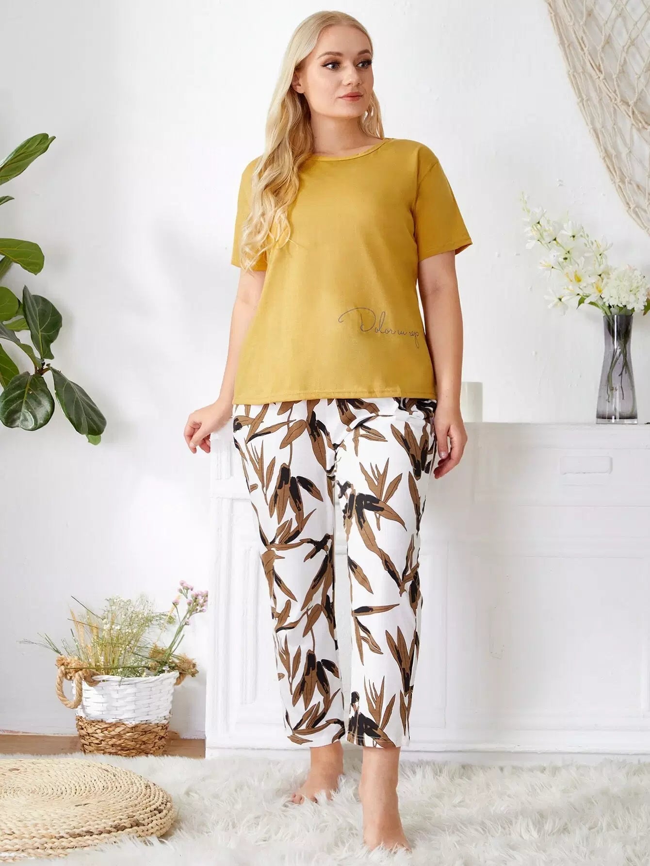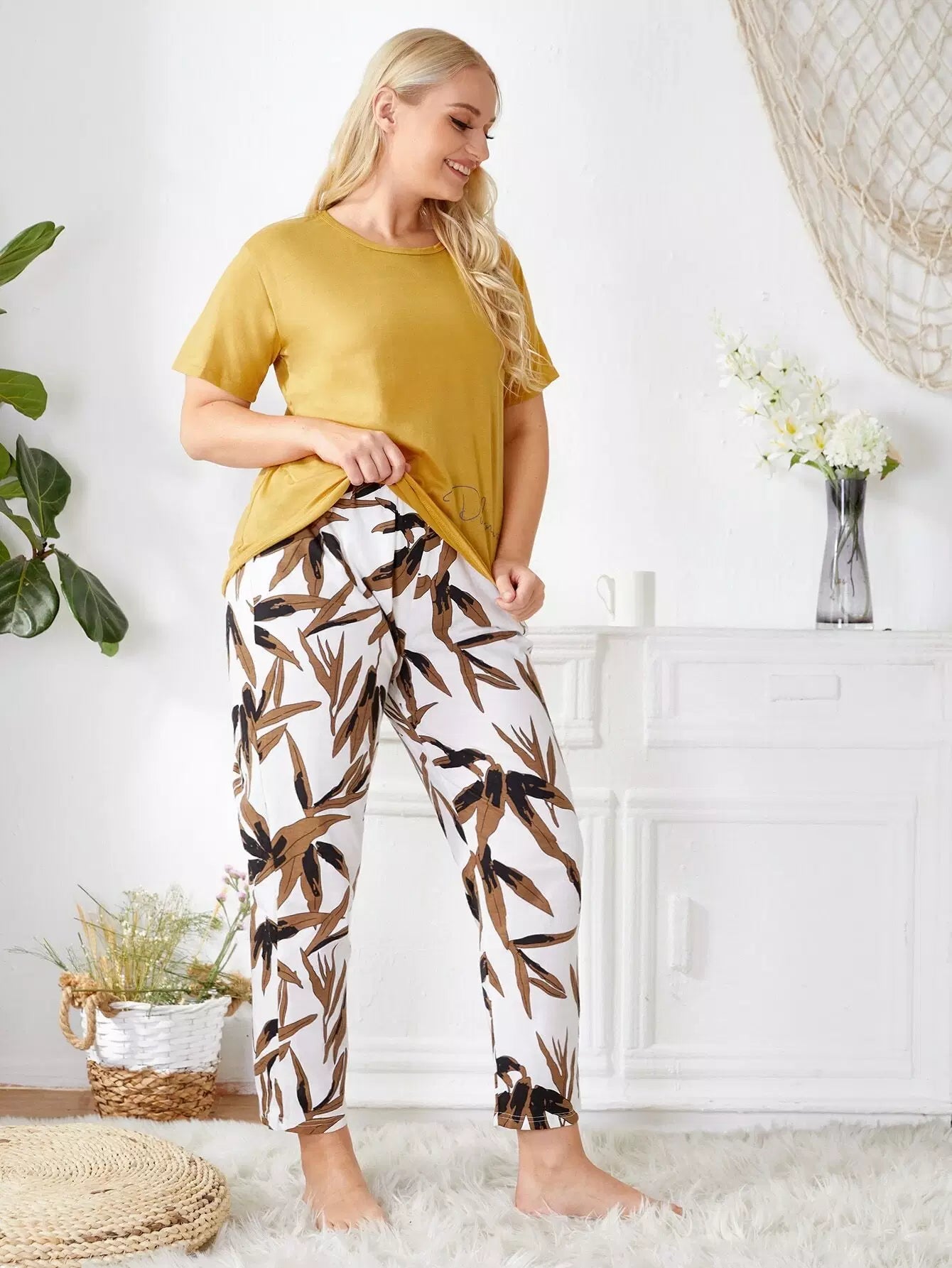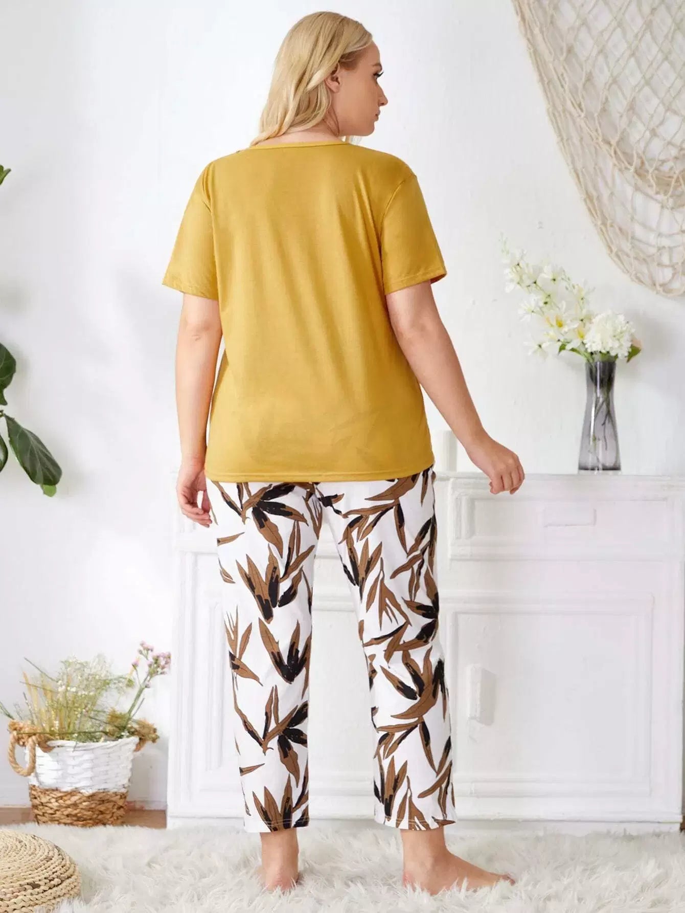 Women - Plus Solid Tee With Plants Pants Pajama Set