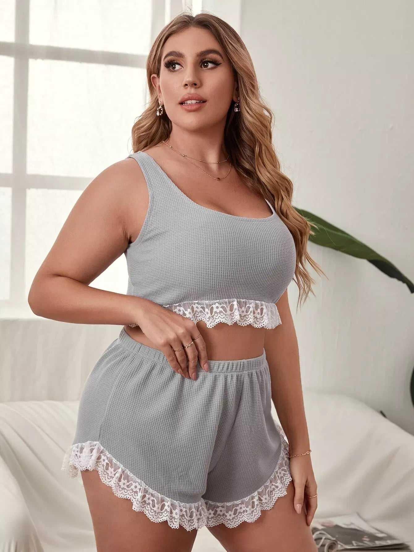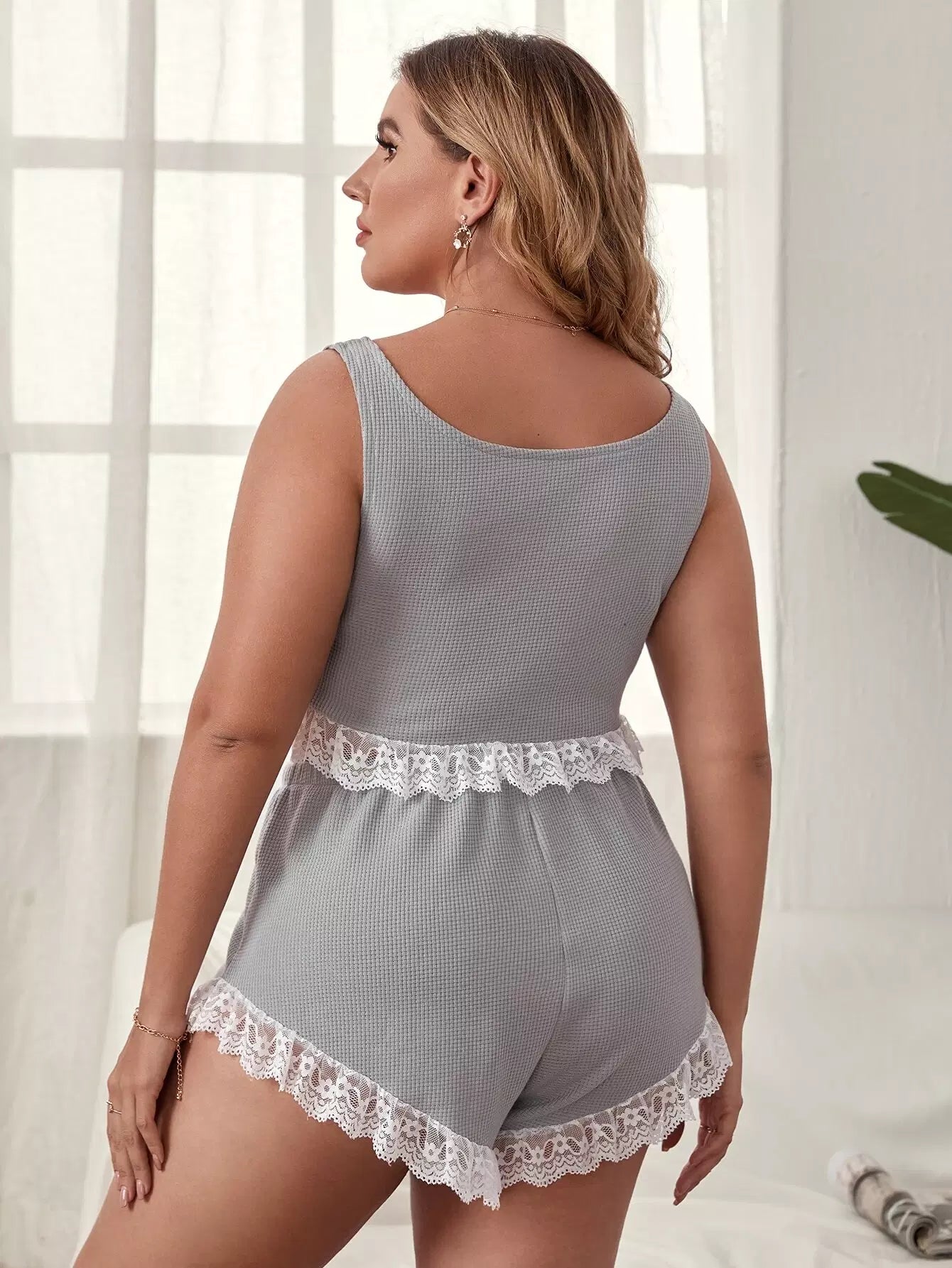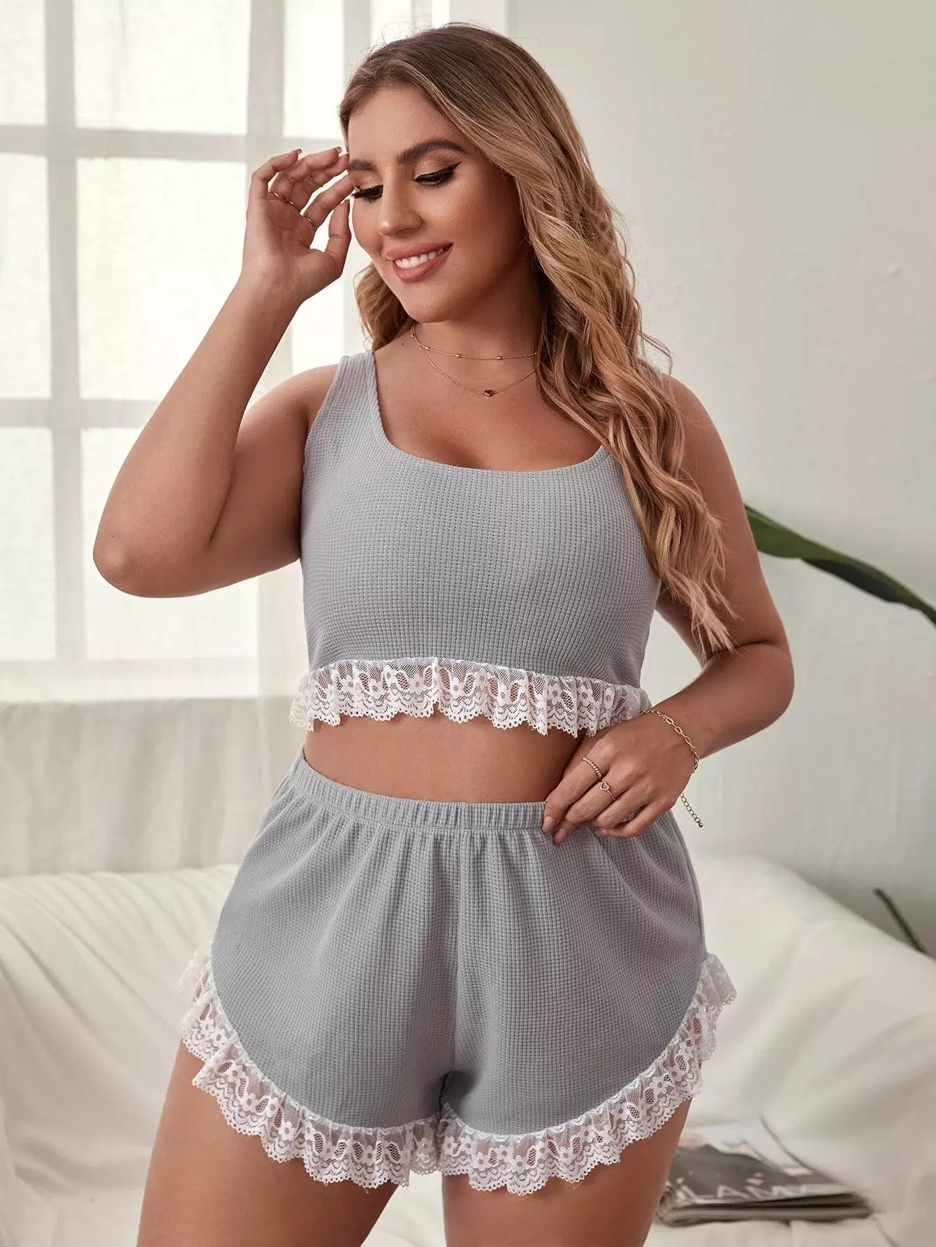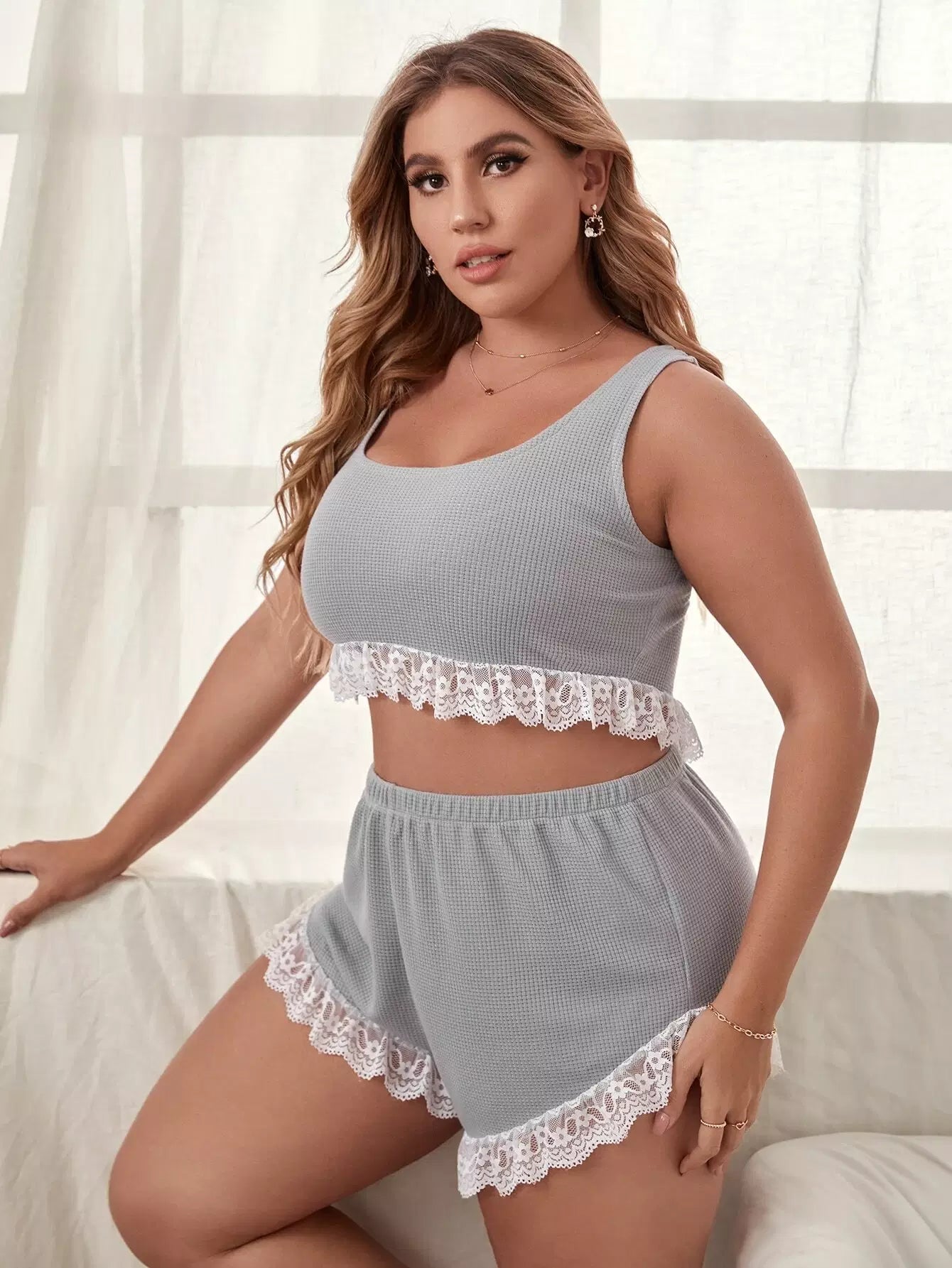 Women - Plus Waffle Knit Contrast Lace Pajama Set