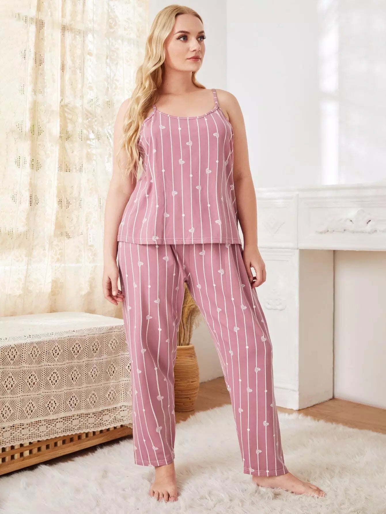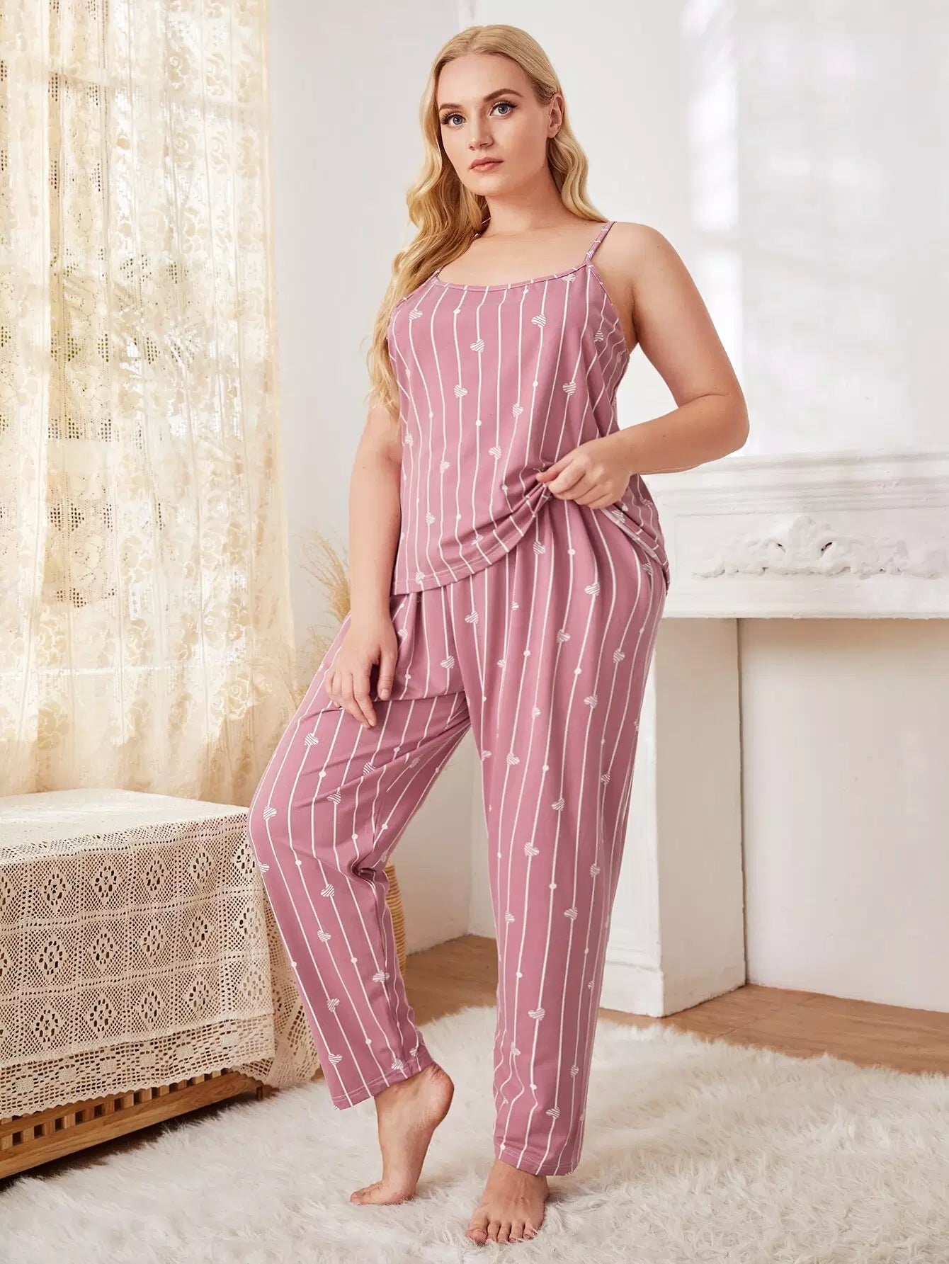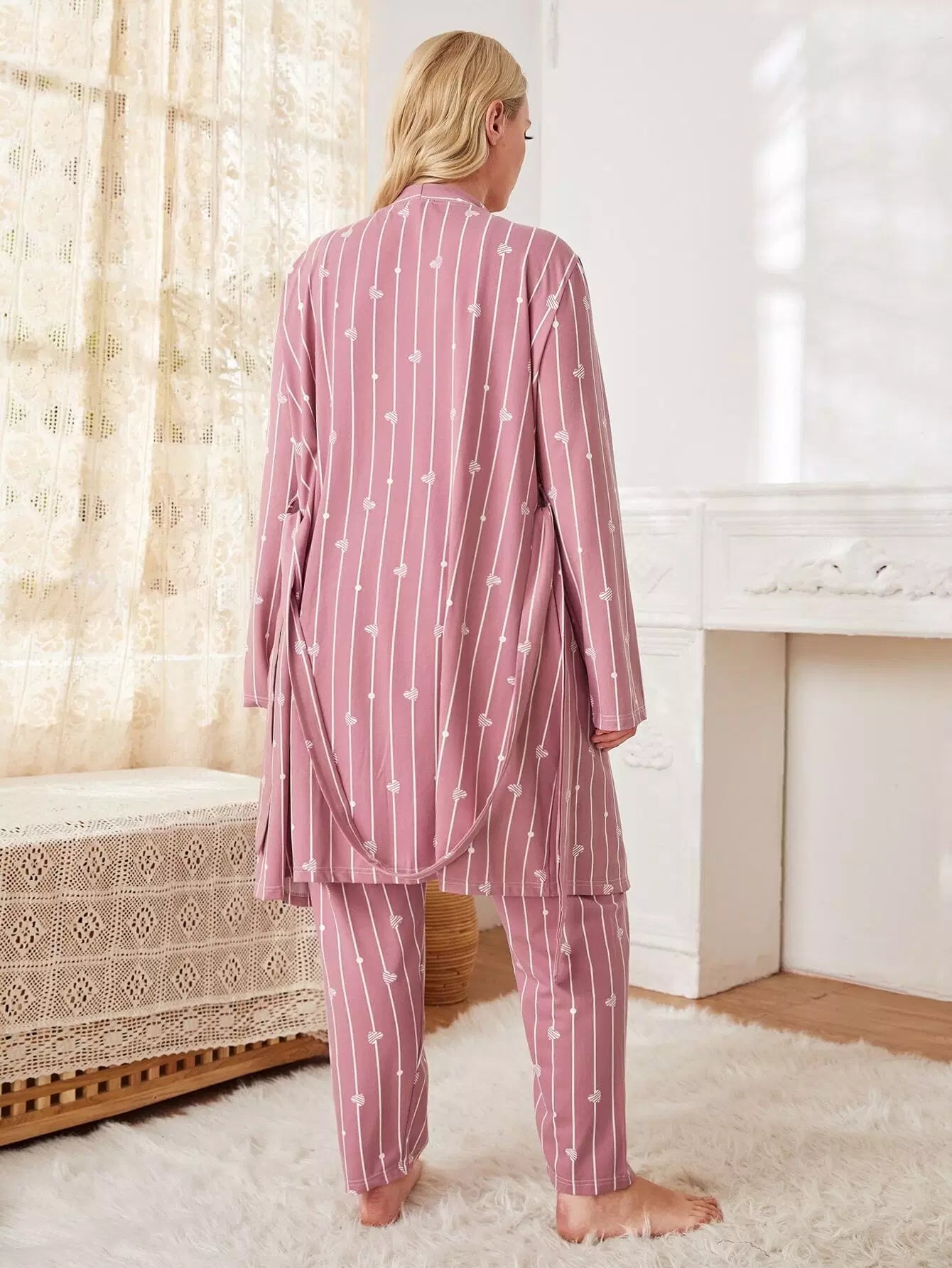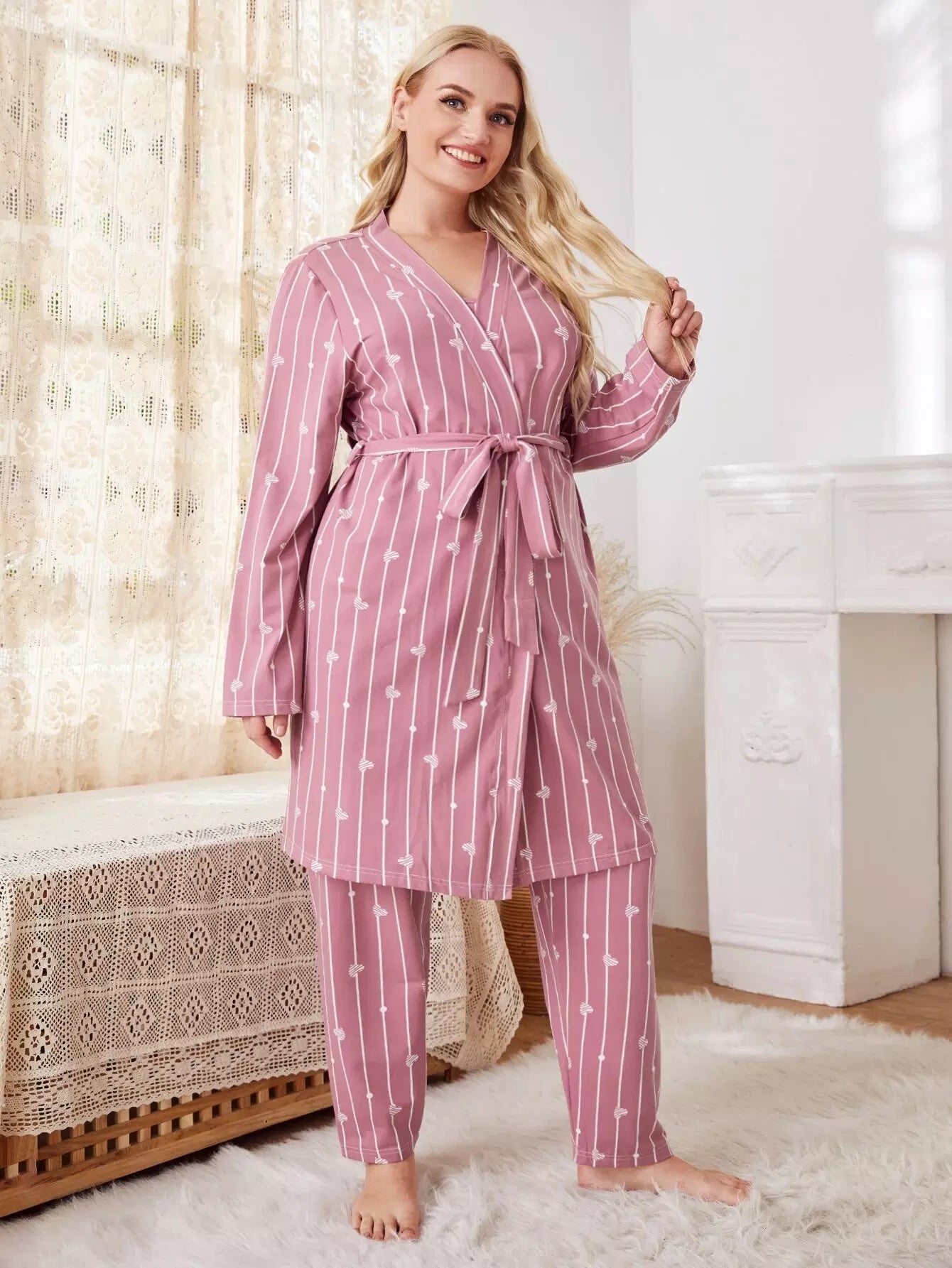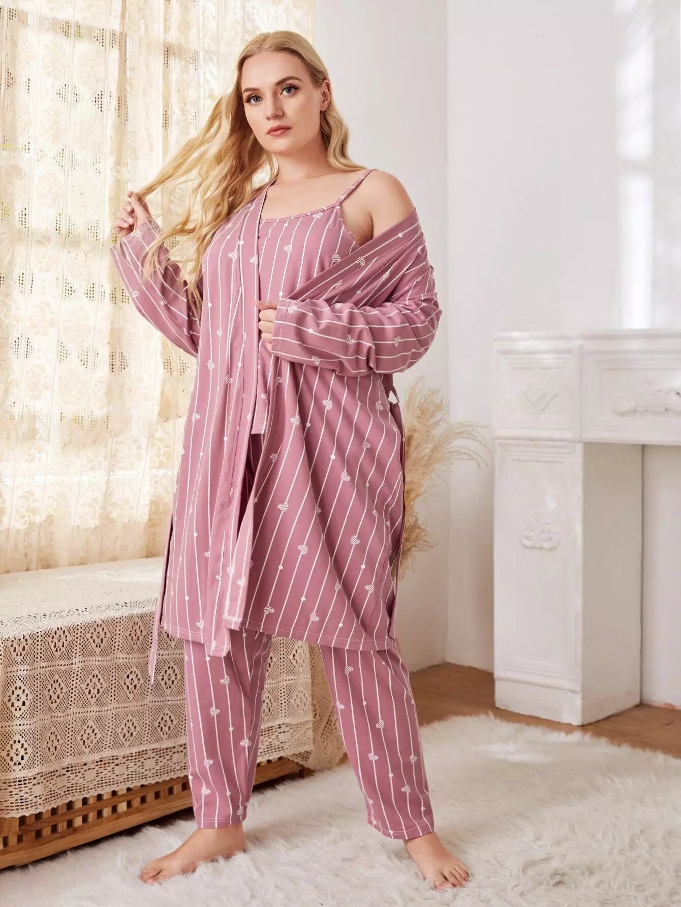 Women - Plus 3pcs Striped Heart Print Belted Robe Set
