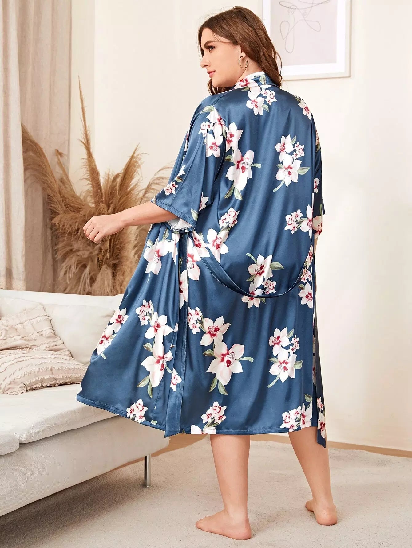 Plus Allover Floral Satin Robe Without Belt