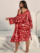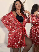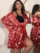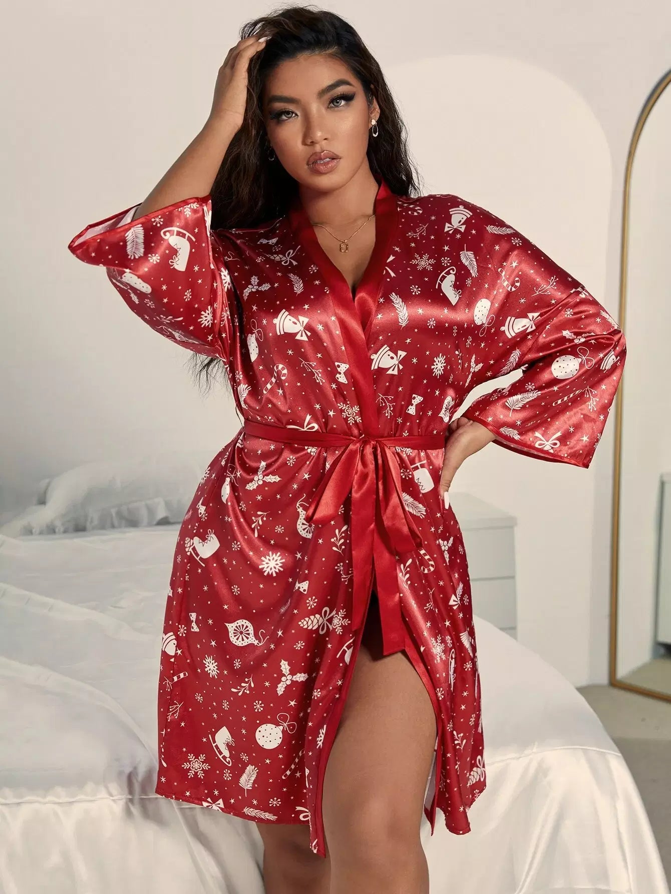 Plus Christmas Print Drop Shoulder Satin Robe Without Lingerie Without Belt