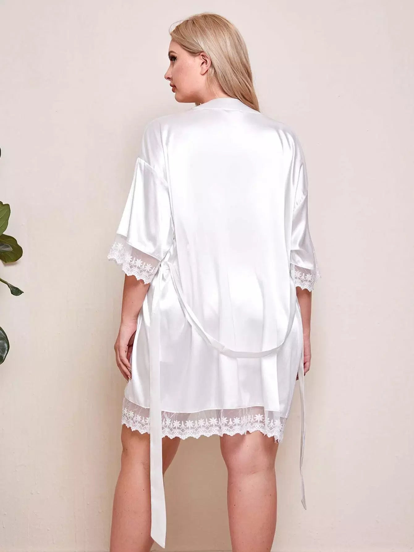 Women - Plus Embroidery Mesh Edge Belted Satin Robe