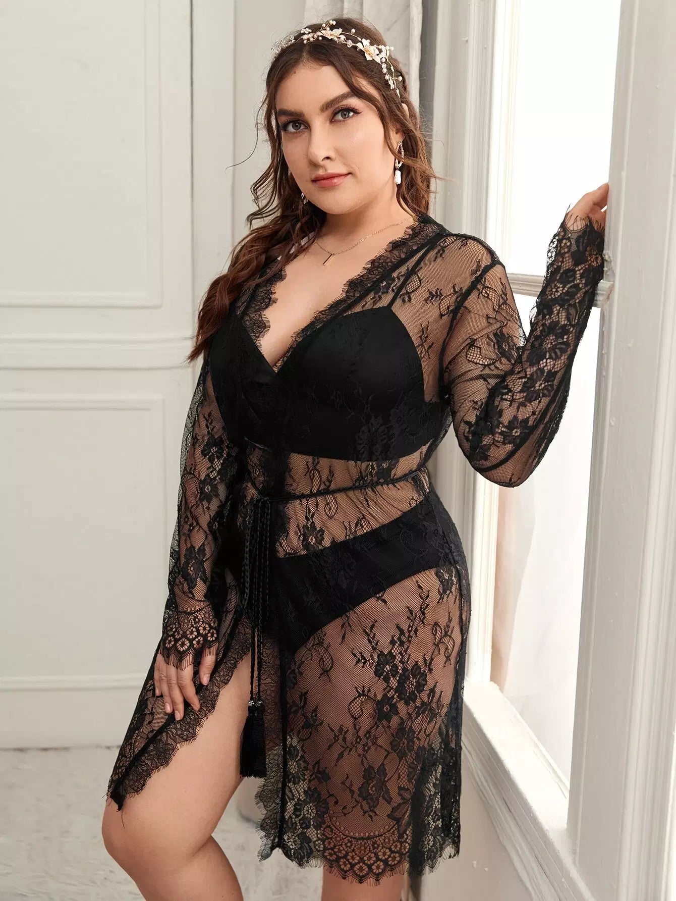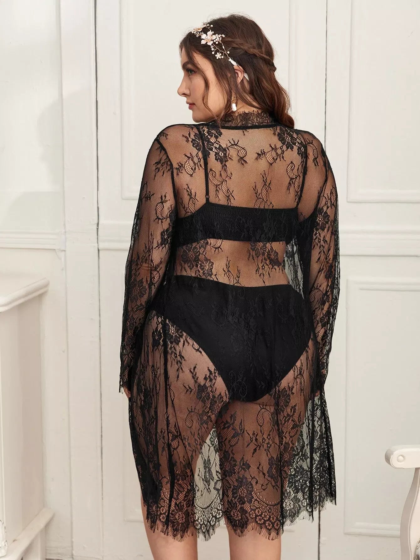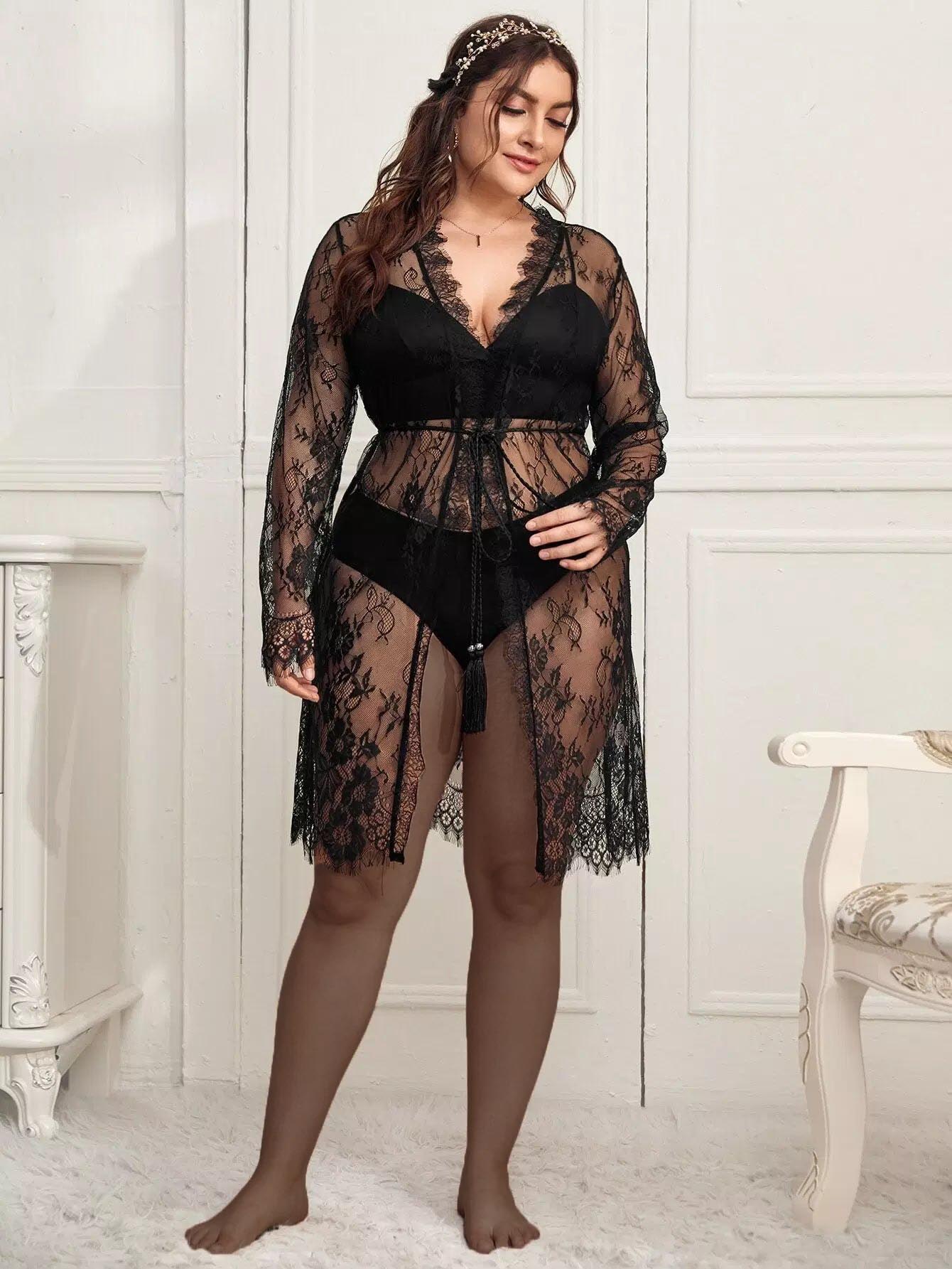 Plus Lace Sheer Robe Without Lingerie Without Belt