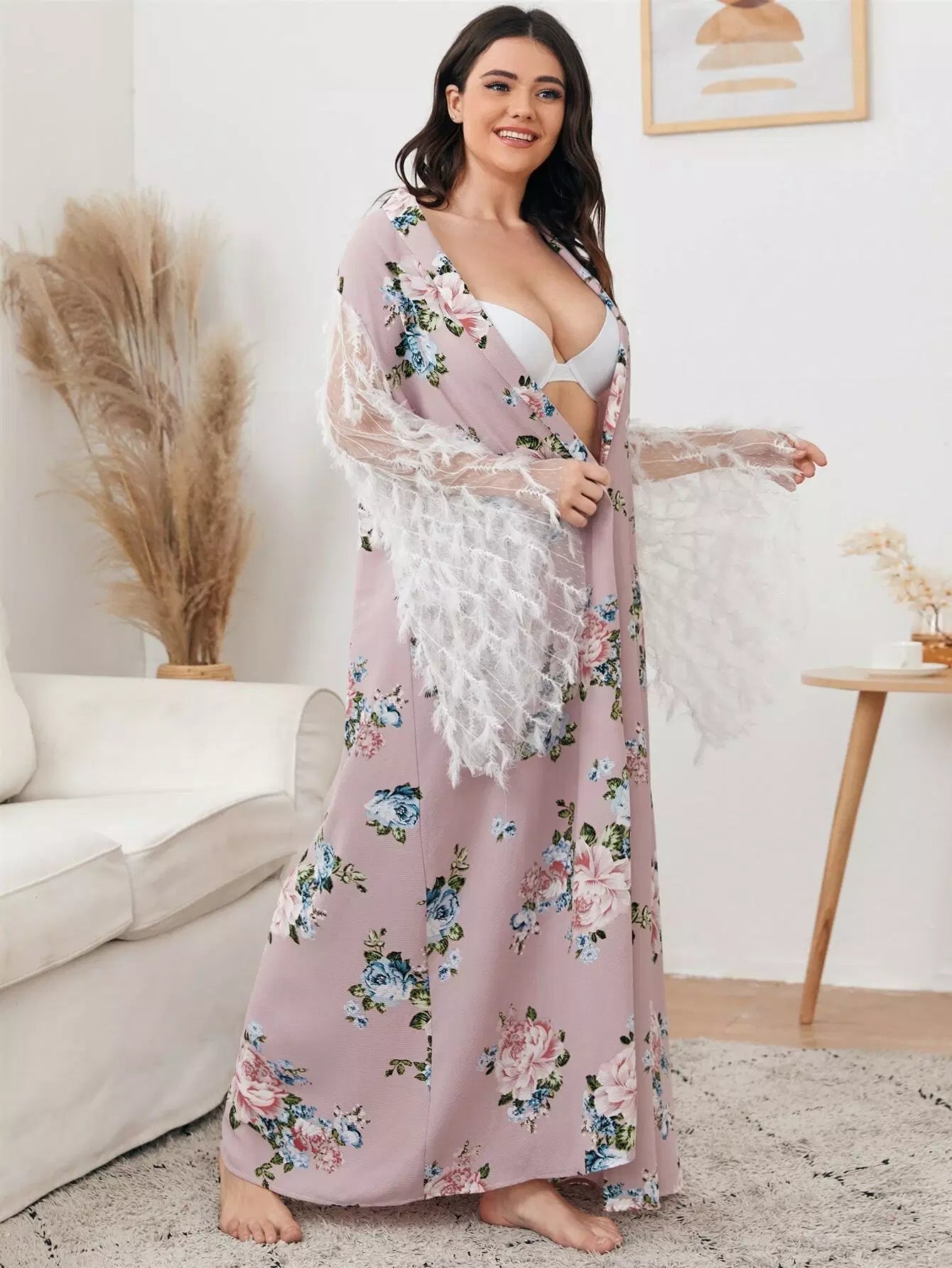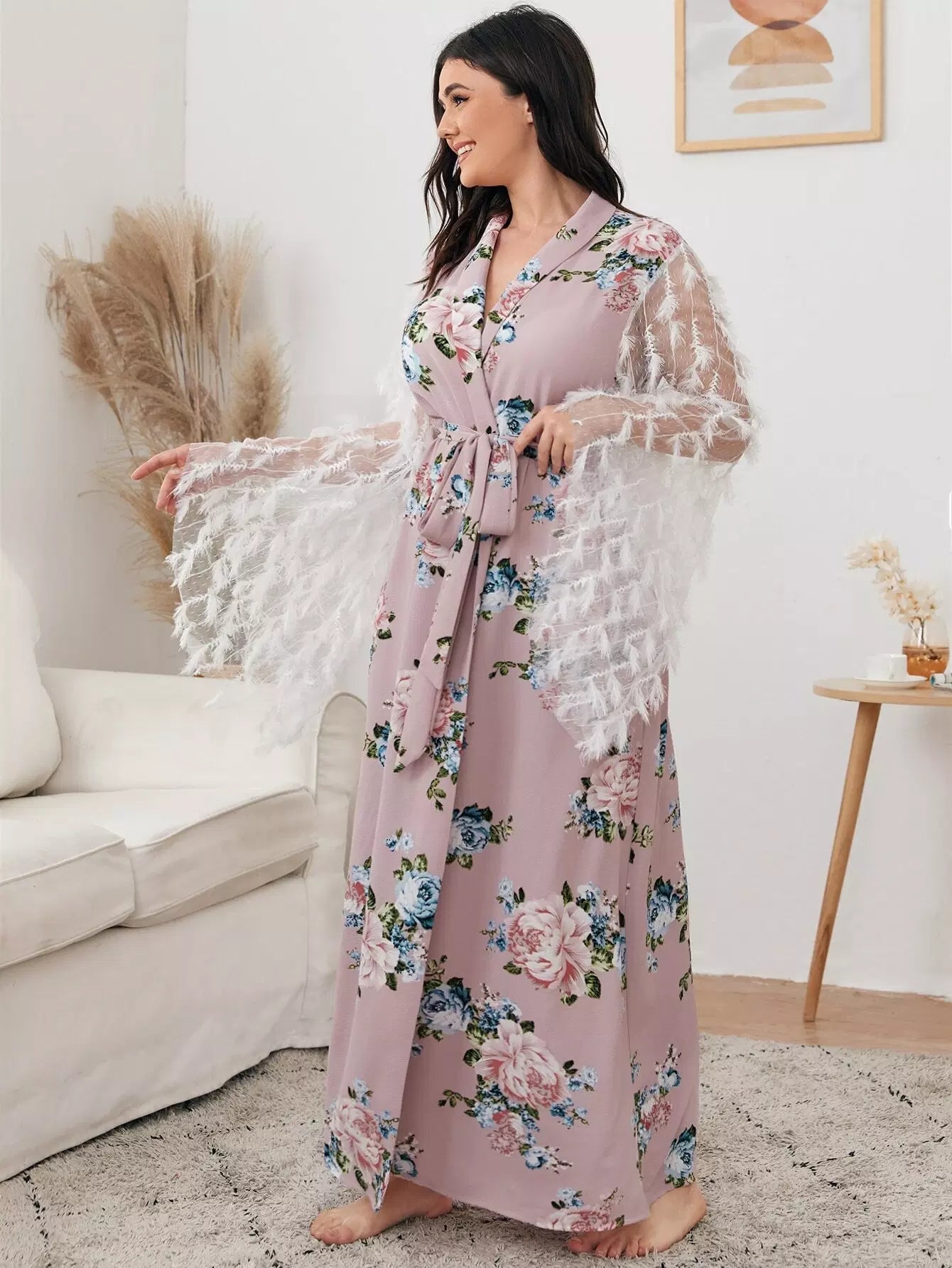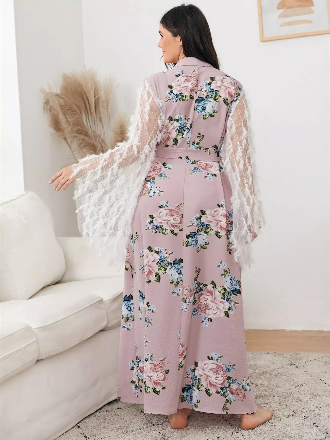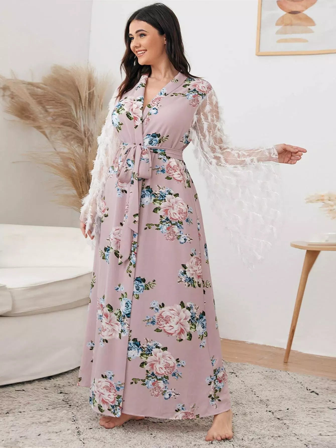 Women - Plus Mesh Bell Sleeve Self Belted Floral Print Robe