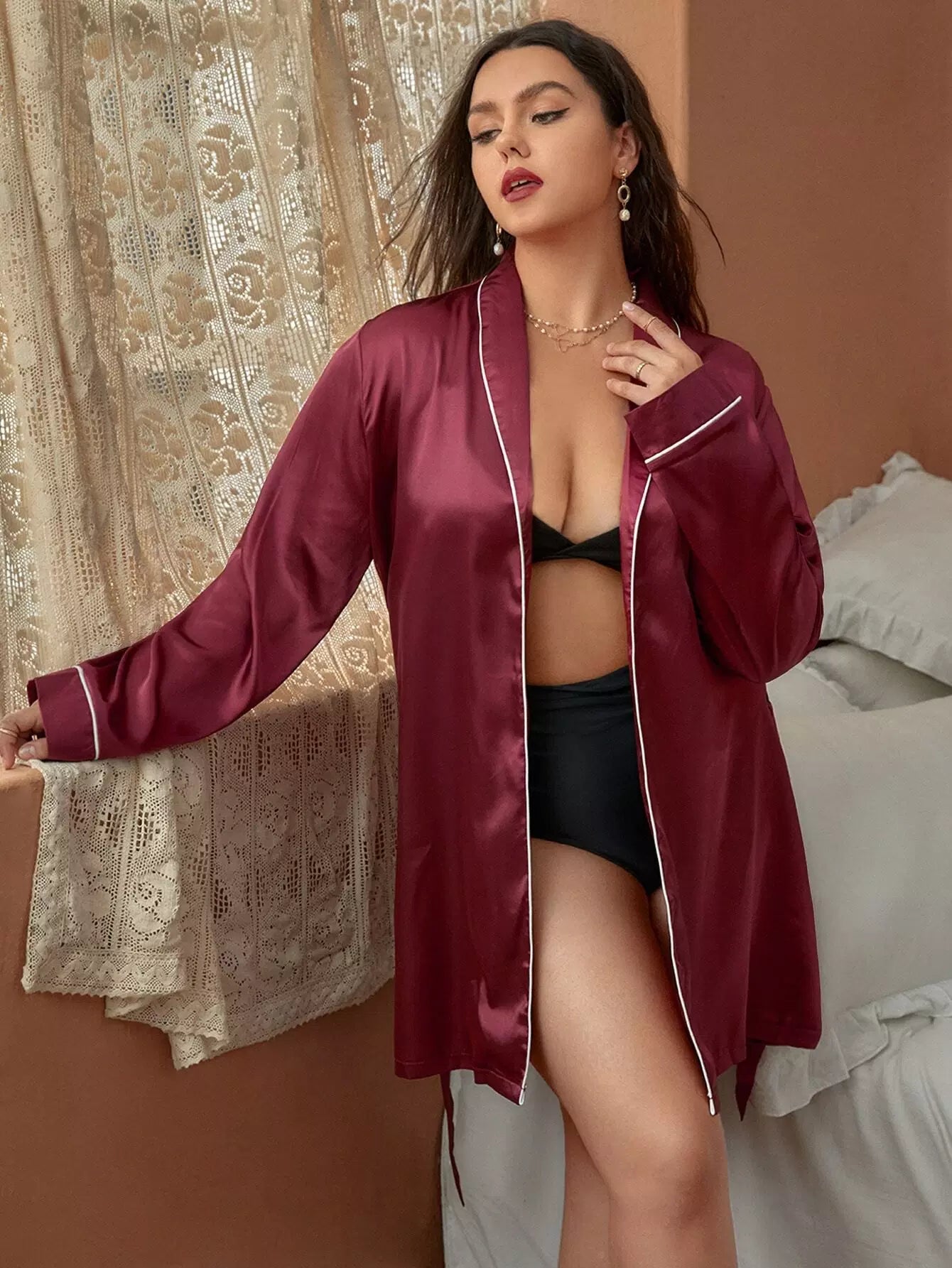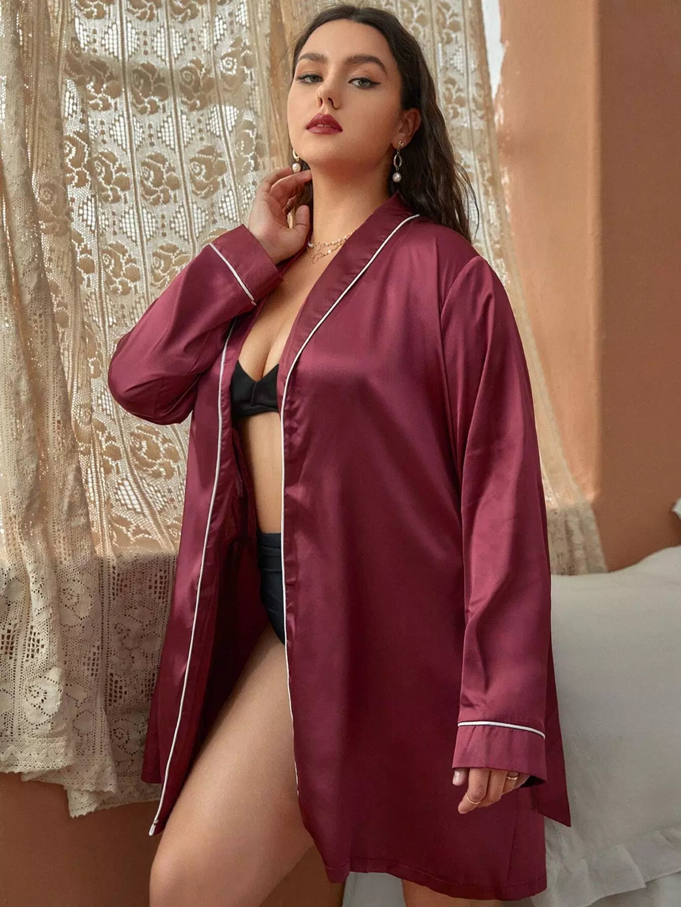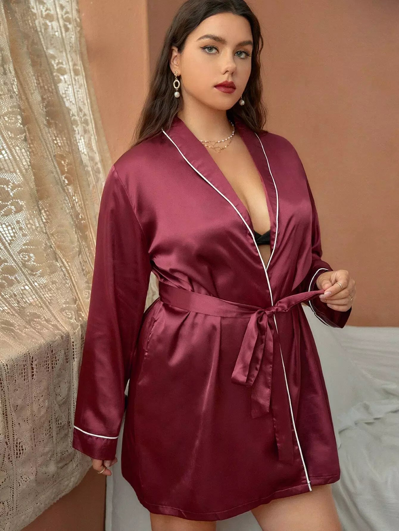 Women - Plus Shawl Collar Contrast Piping Belted Satin Sleep Robe