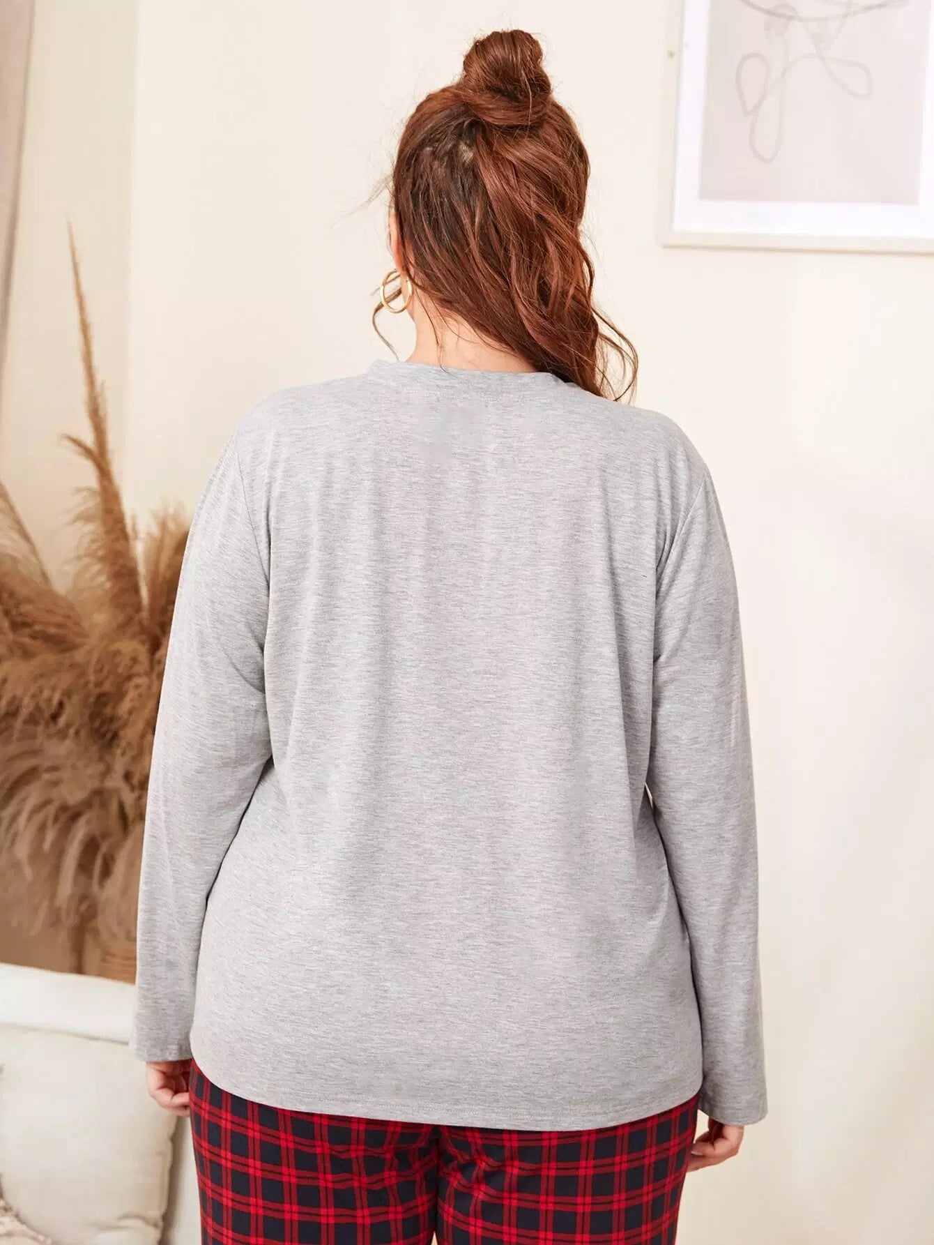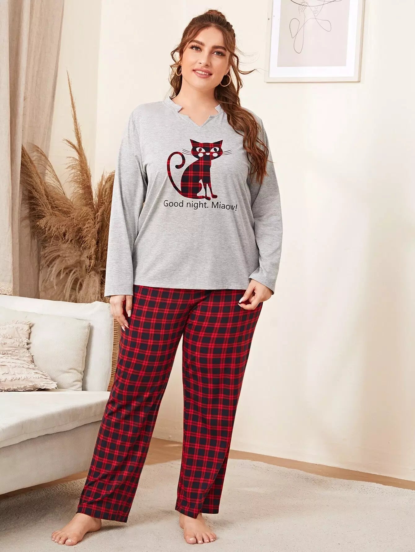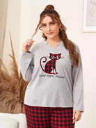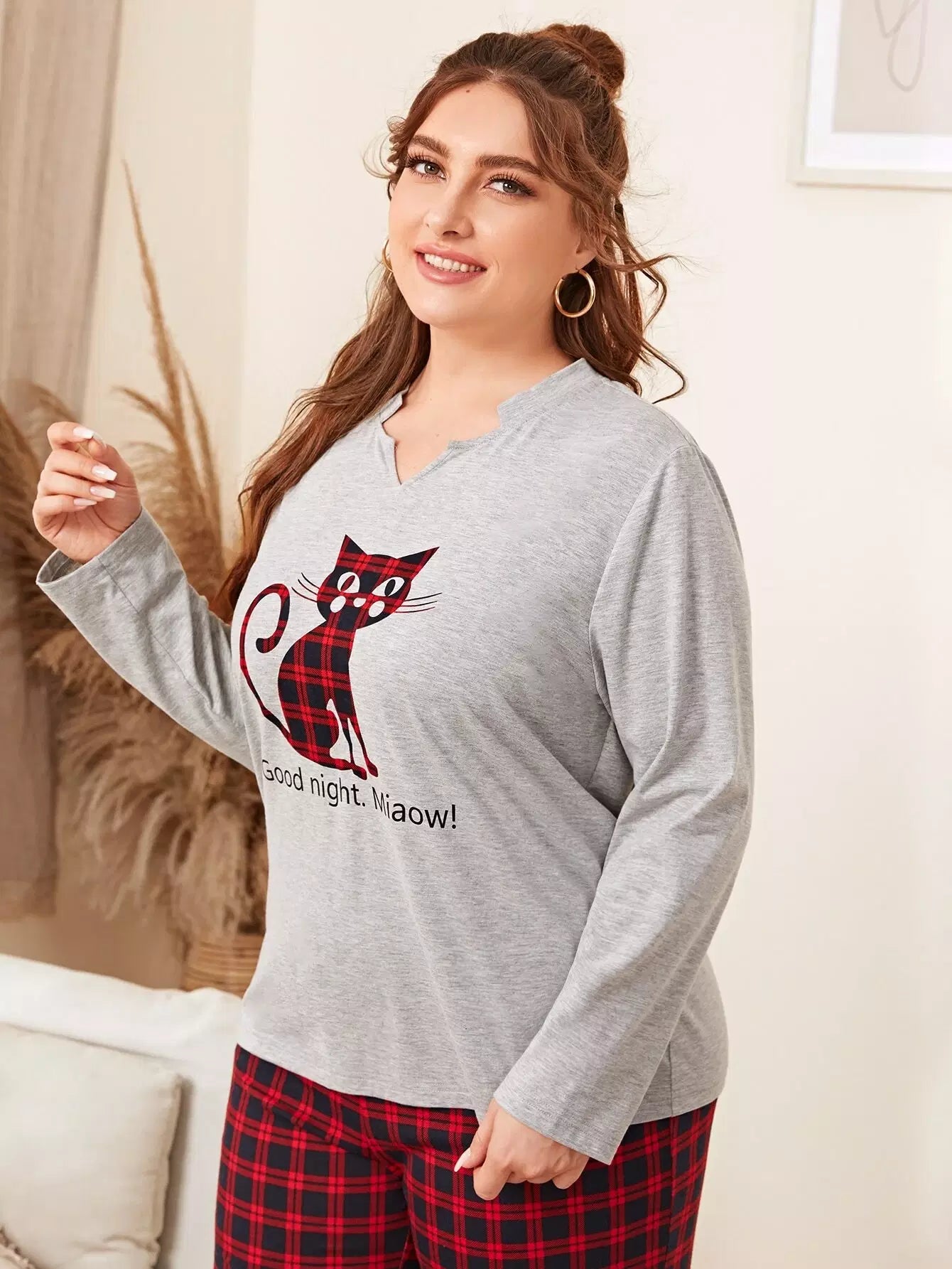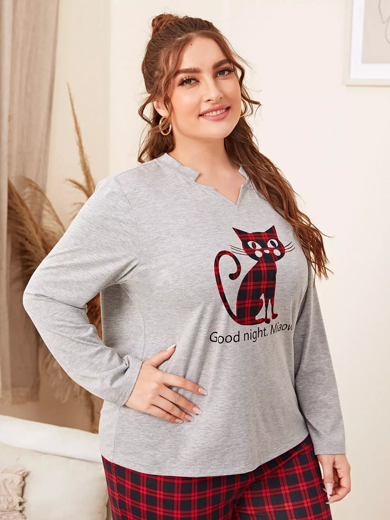 Plus Notched Neck Letter and Cat Print Sleep Top
