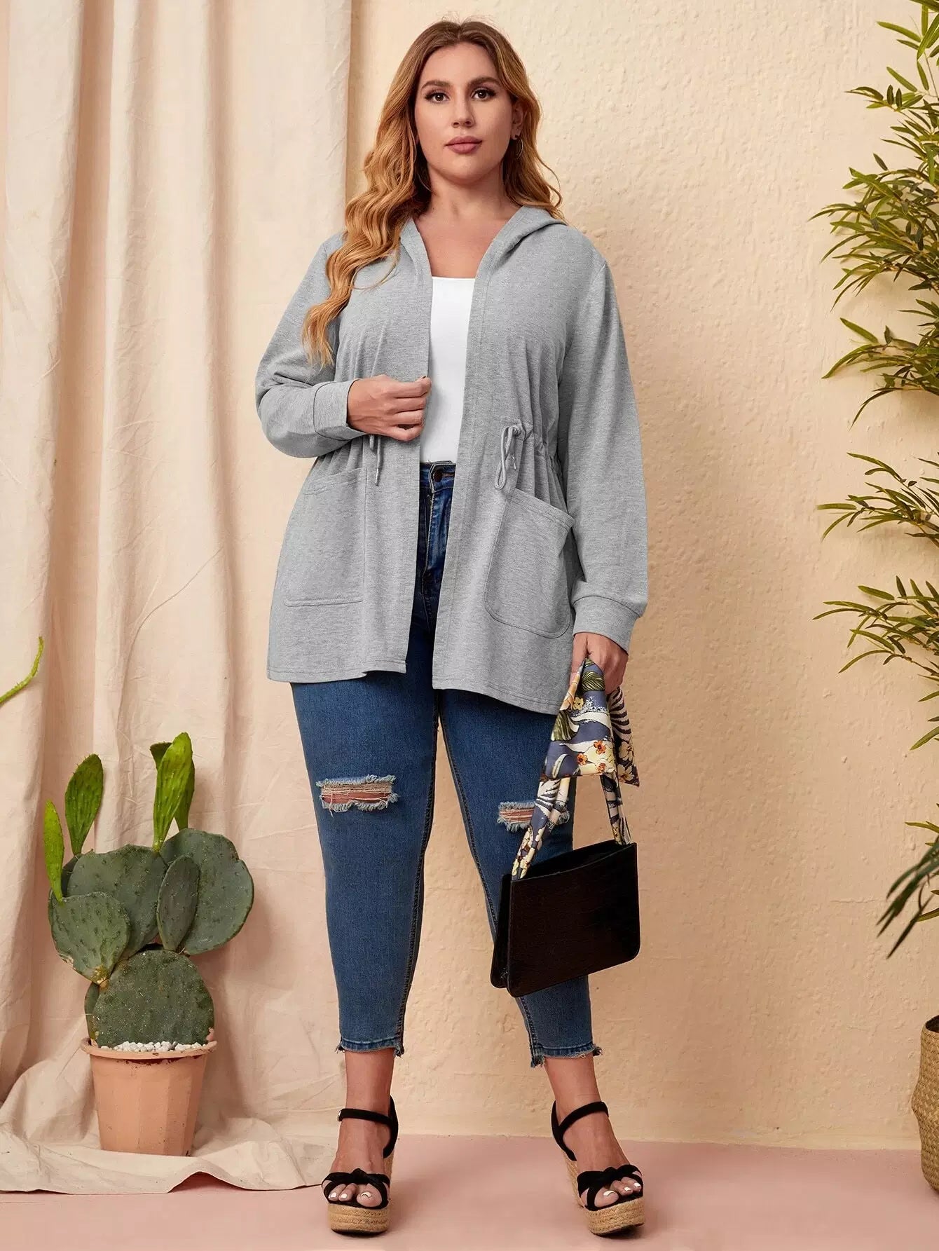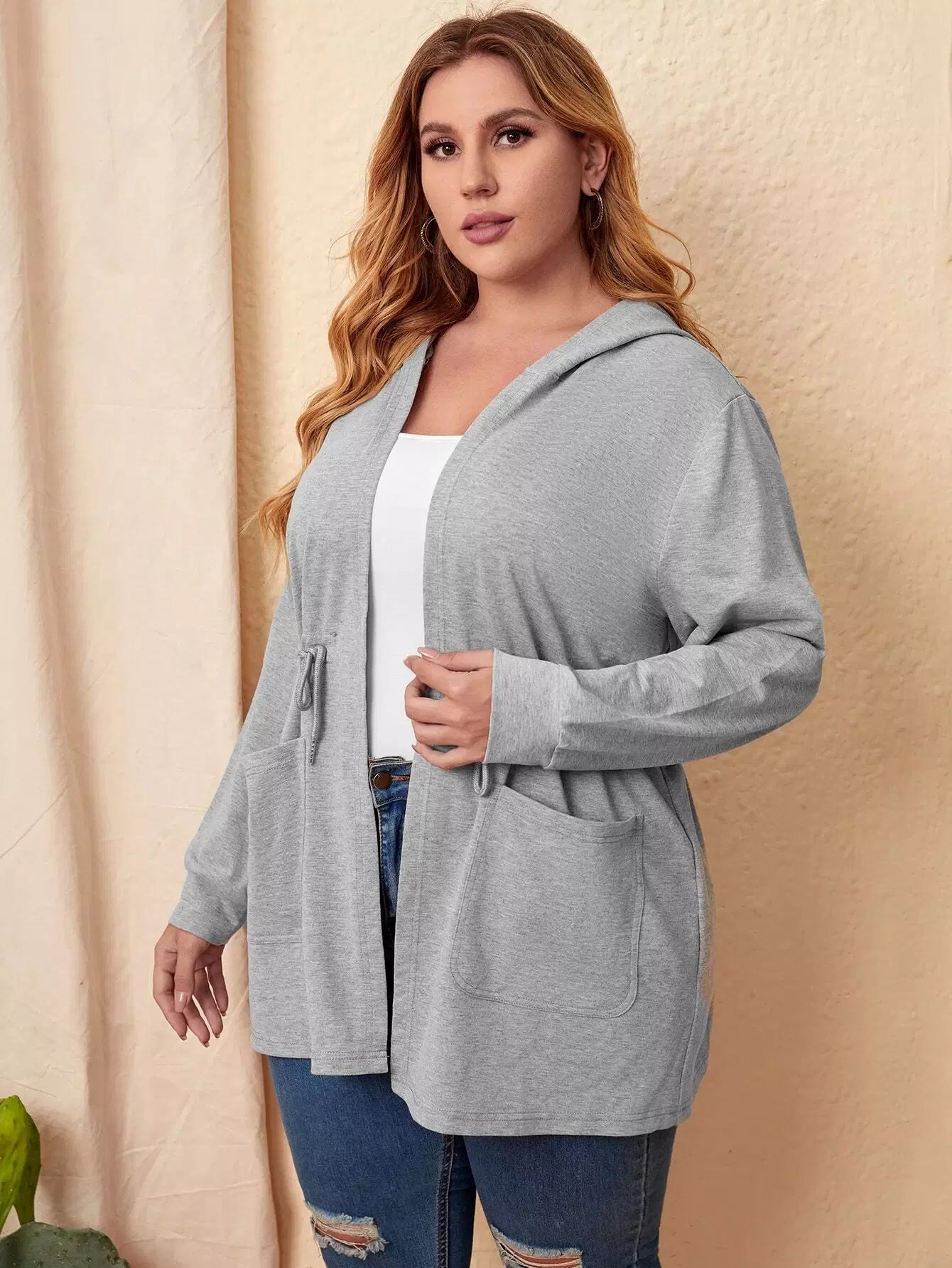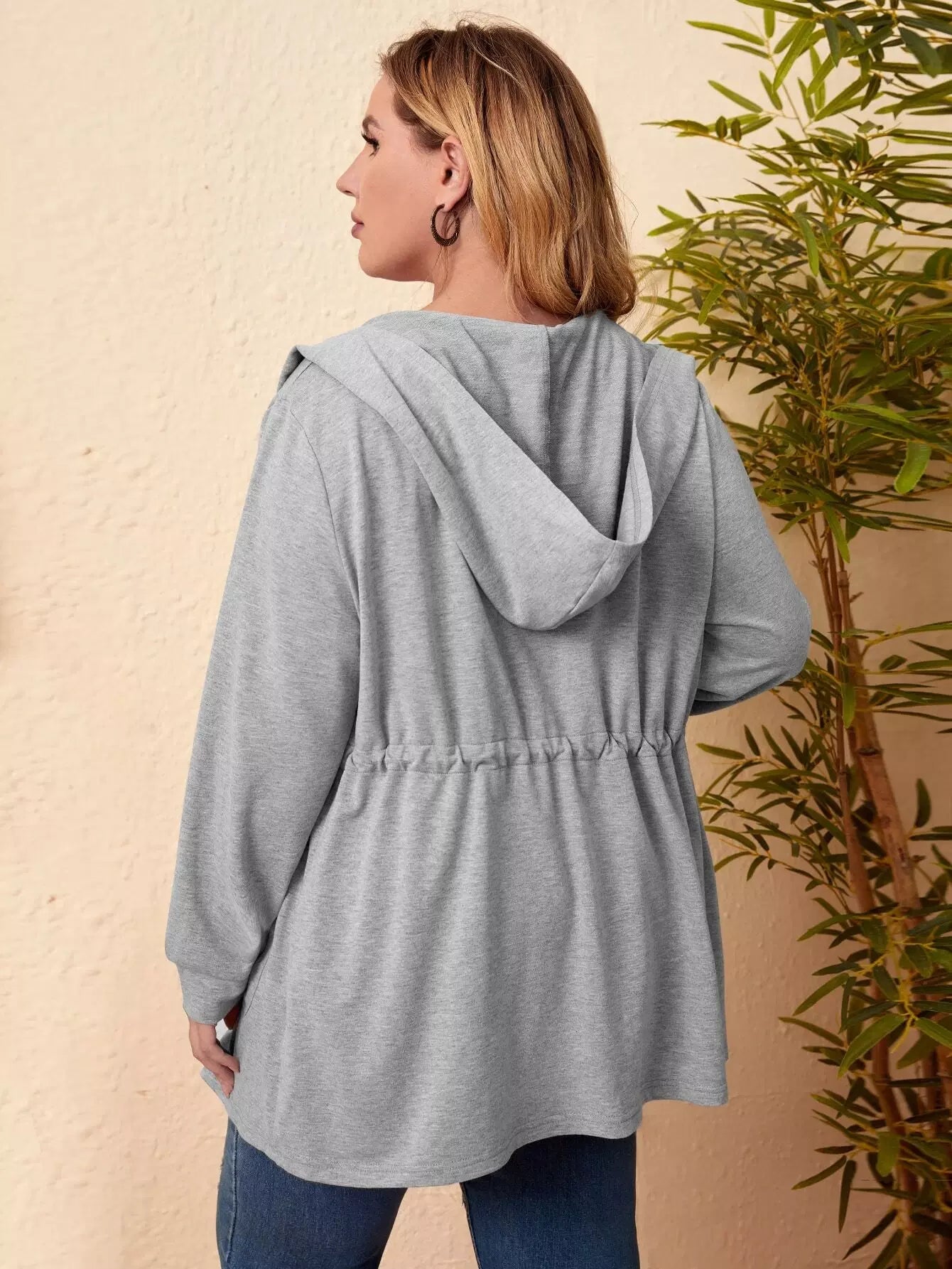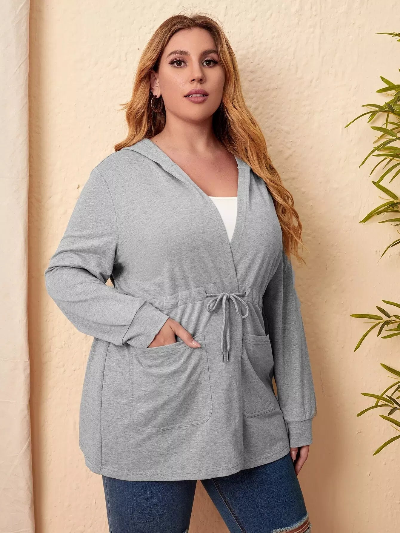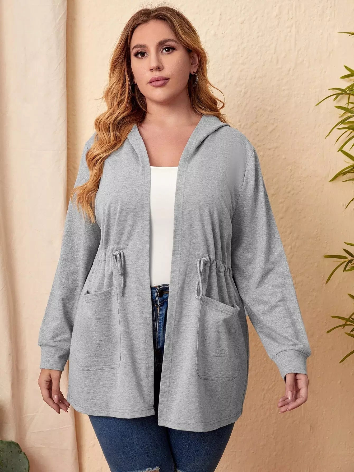 Plus Dual Pocket Drawstring Waist Open Front Hooded Coat