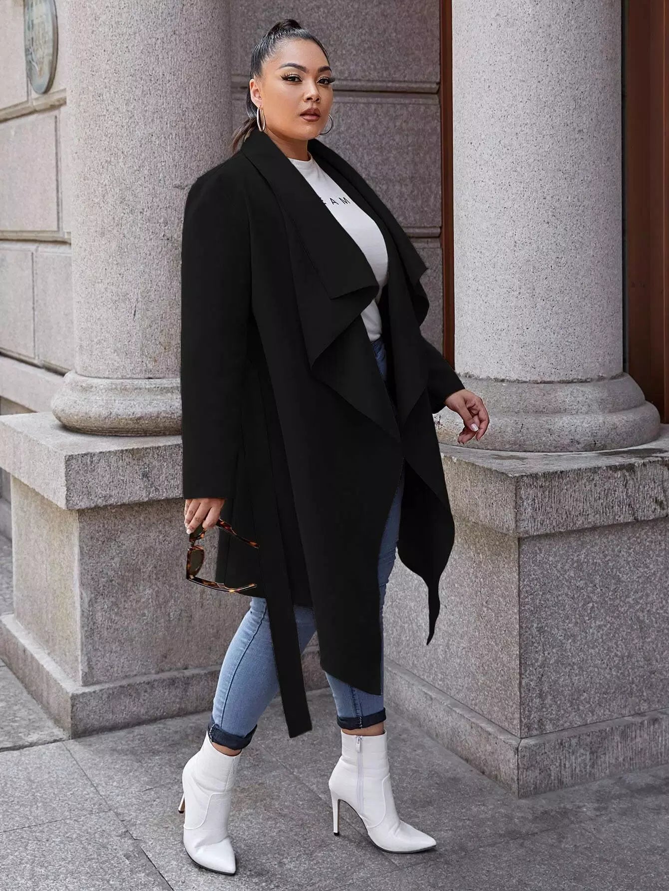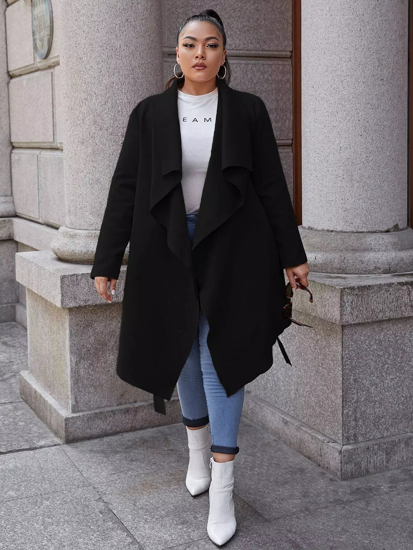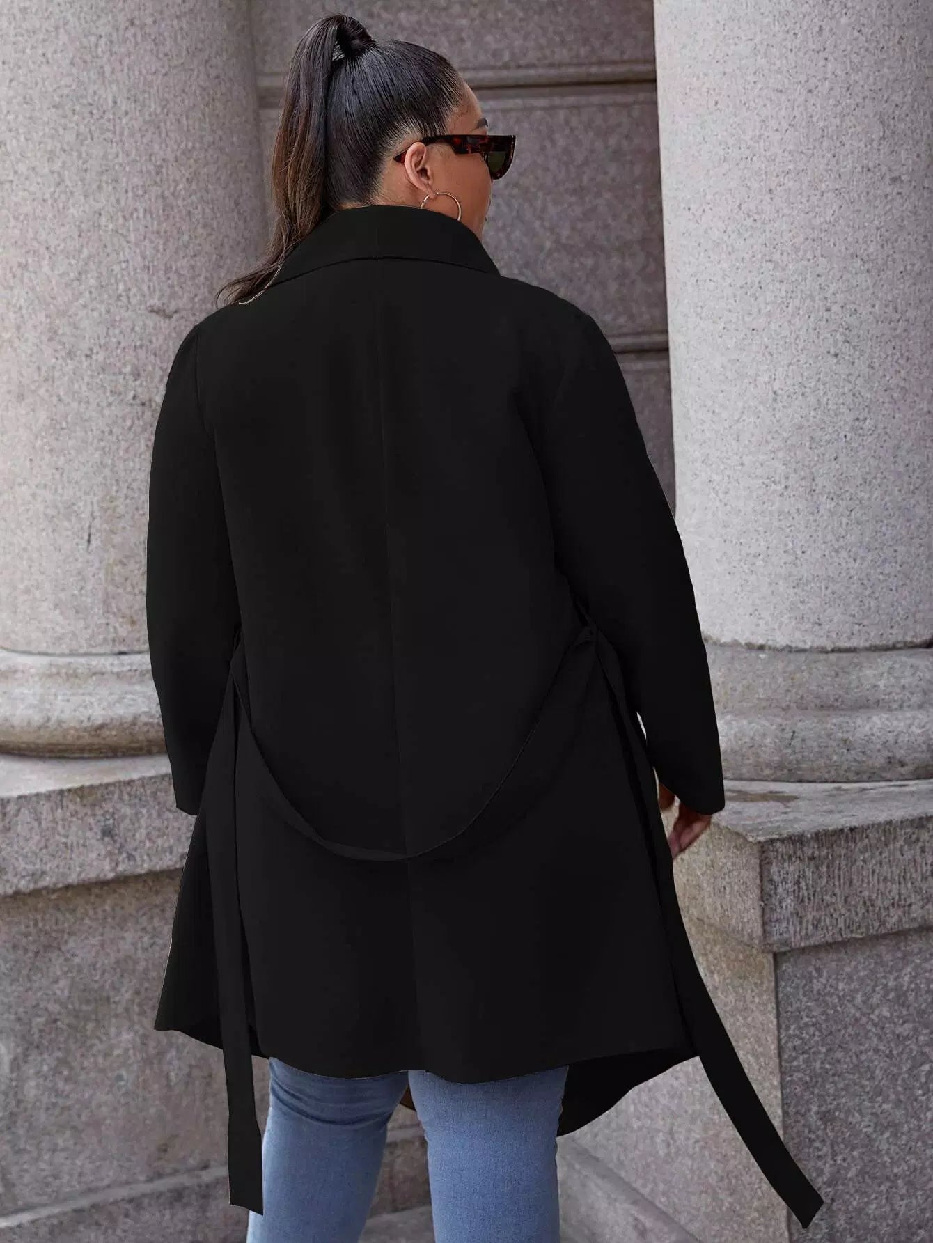 Plus Waterfall Self Tie Asymmetrical Hem Overcoat