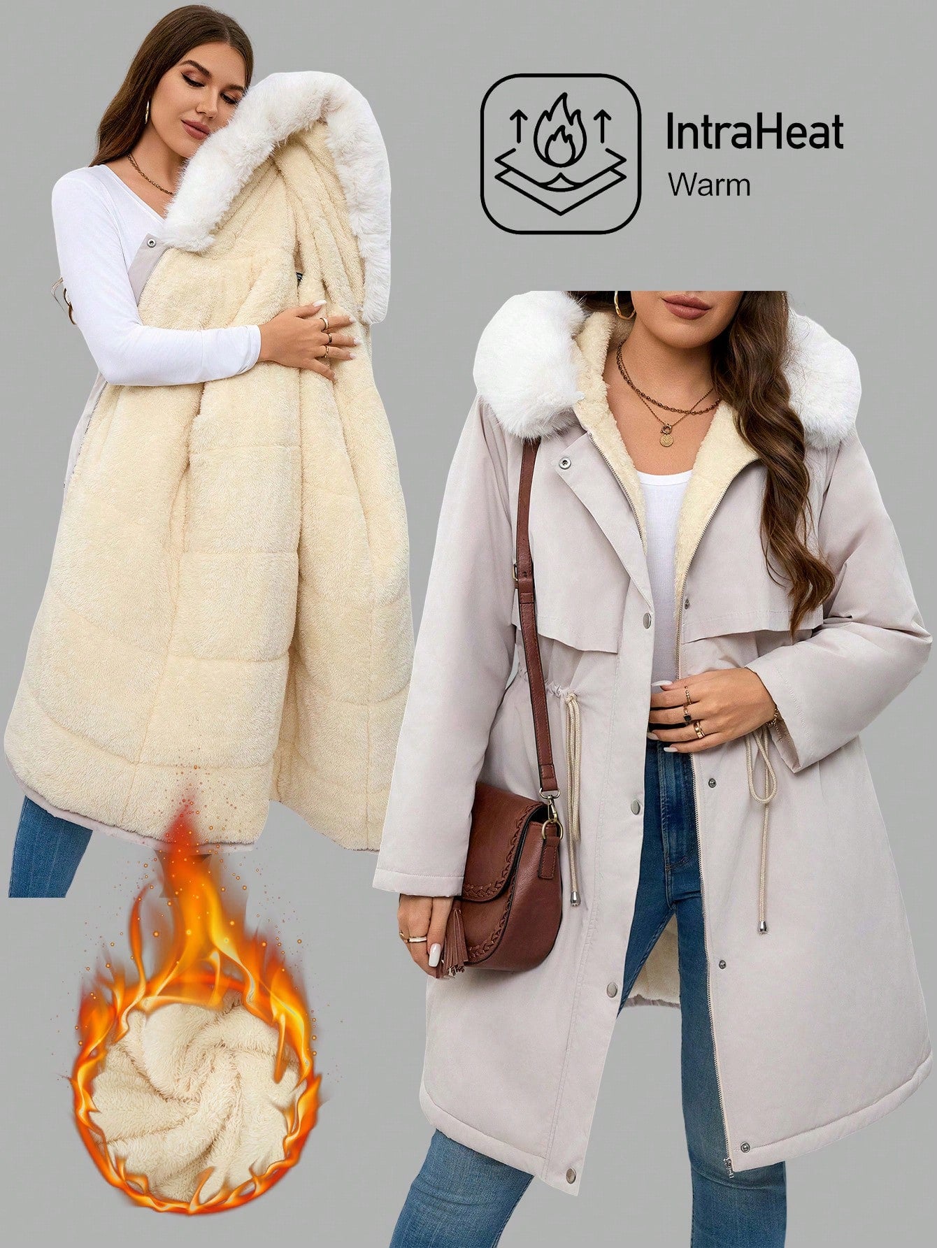 LUNE 1pc Windproof Waterproof Faux Fur Collar Hooded Pocket Parka Coat For Plus Size Women, Padded Plus