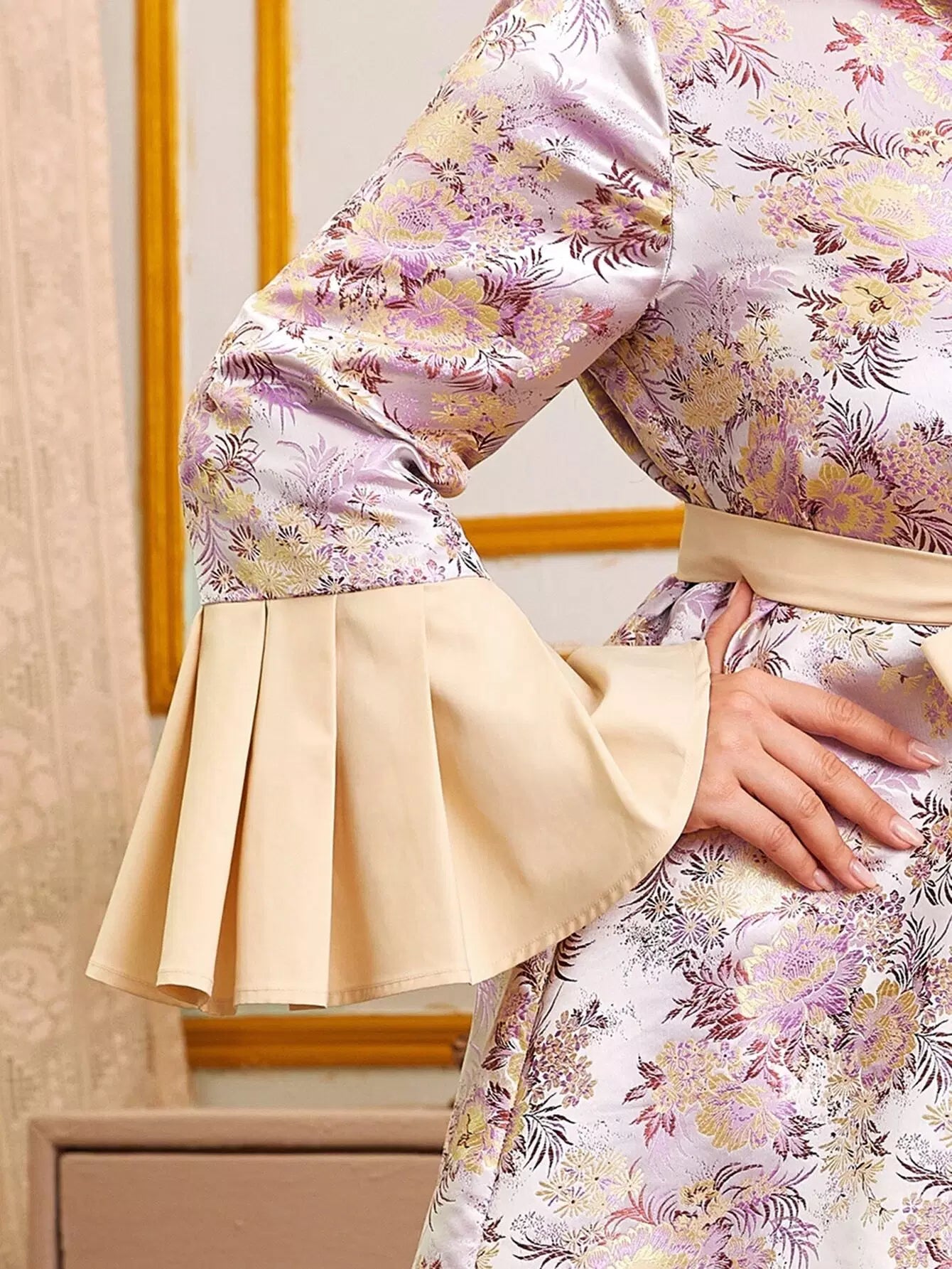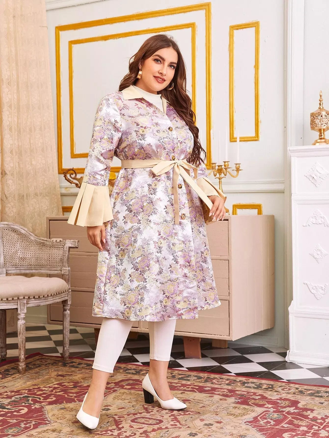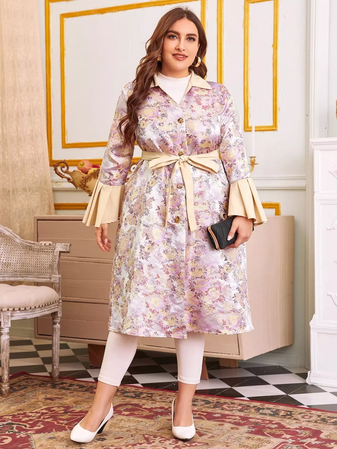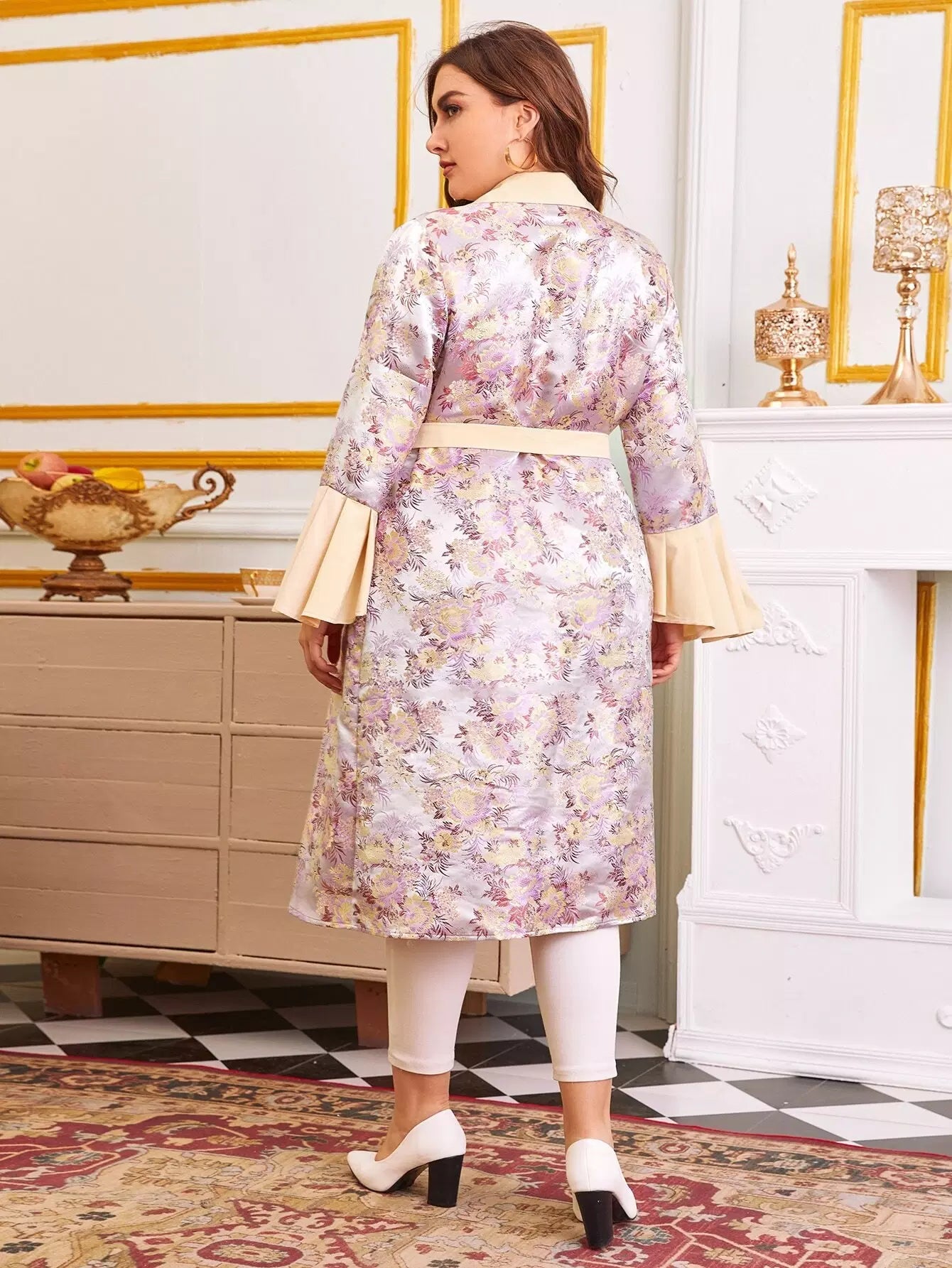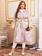 Women - Plus Bell Sleeve Single Breasted Floral Jacquard Satin Belted Coat