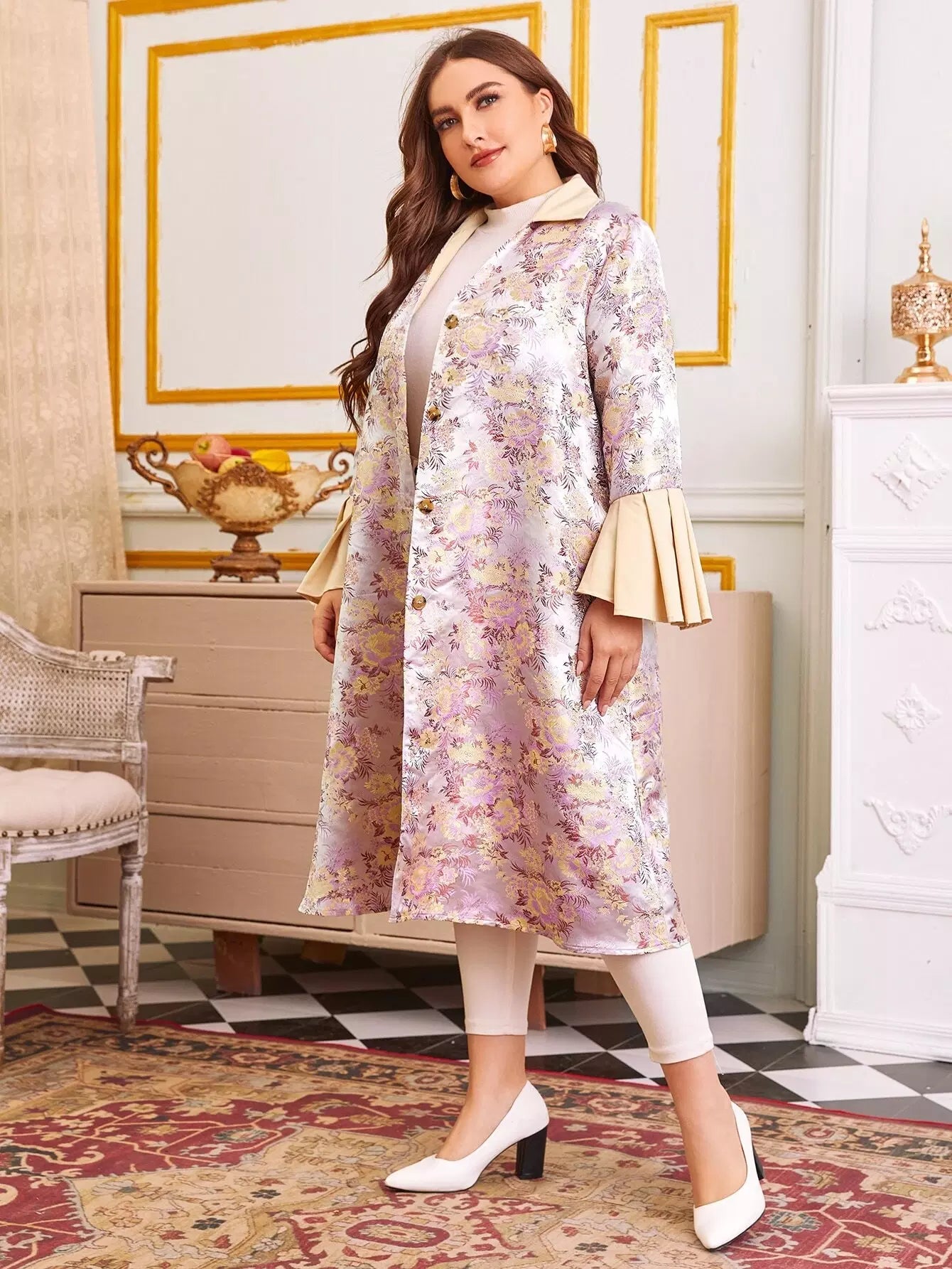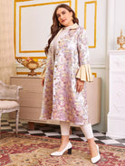 Plus Bell Sleeve Single Breasted Floral Jacquard Satin Coat Without Belt
