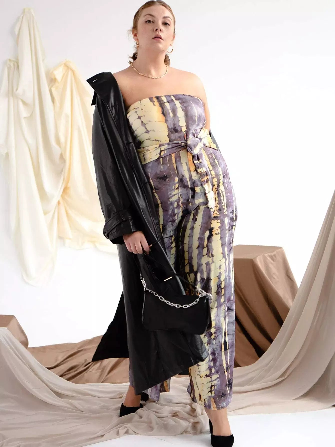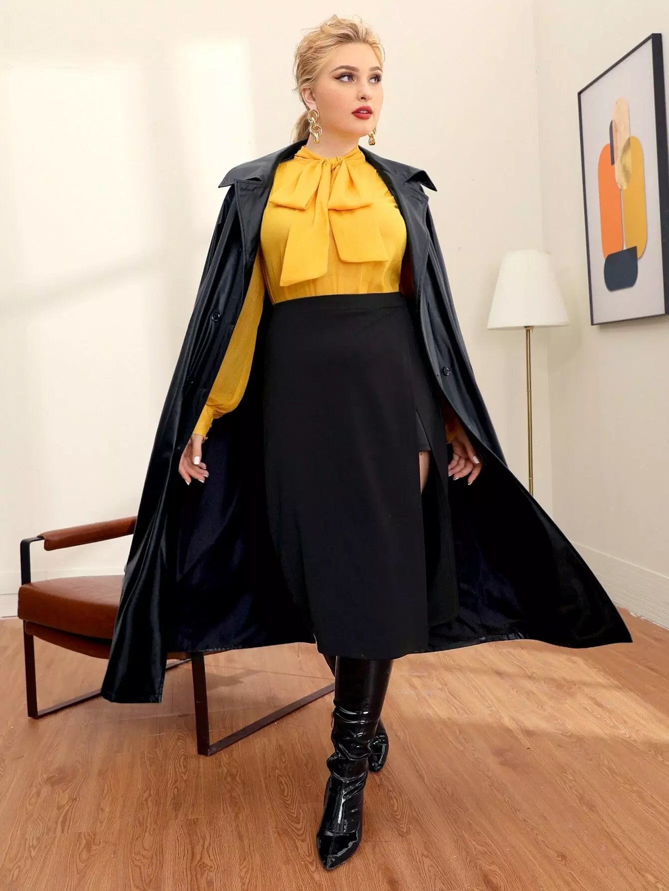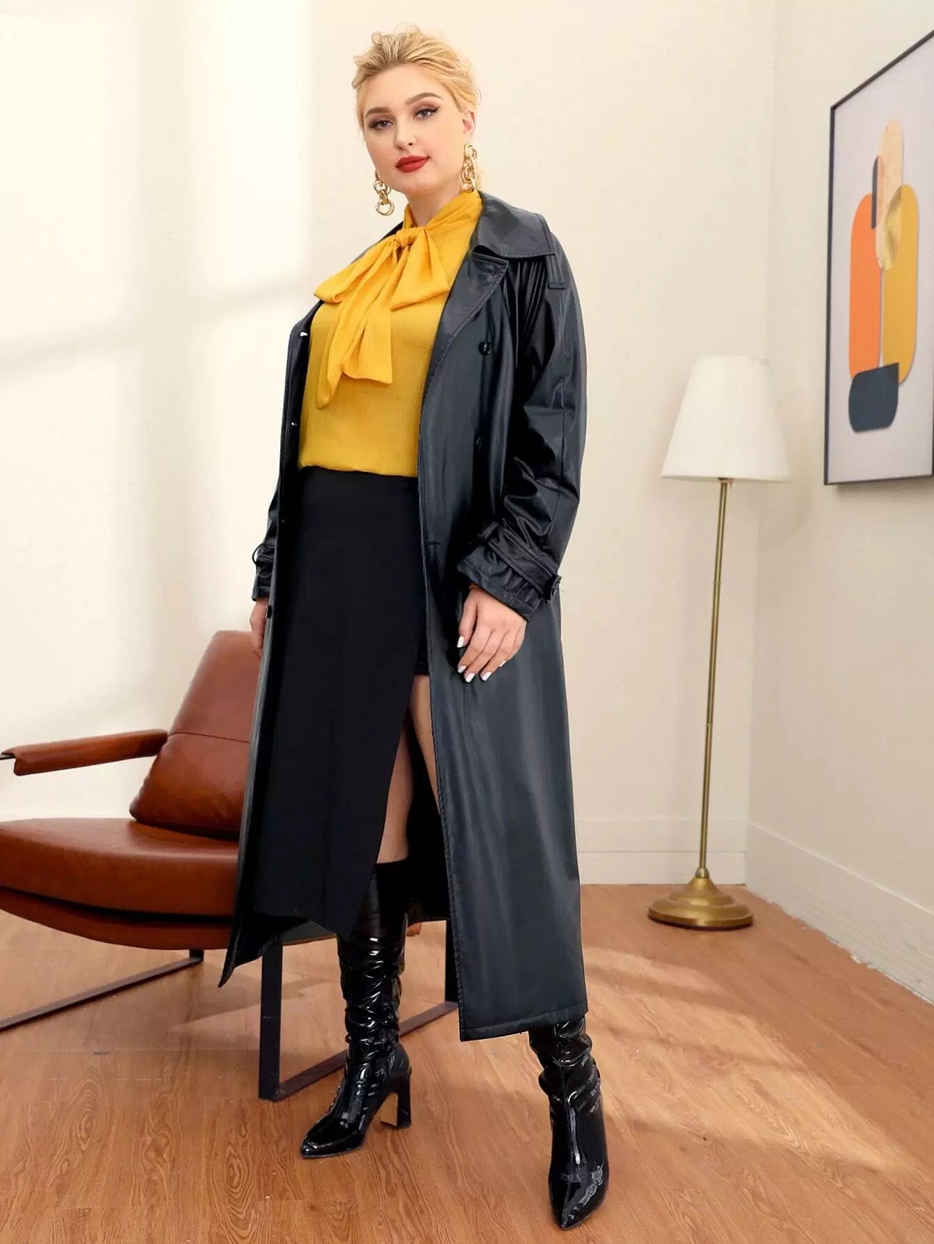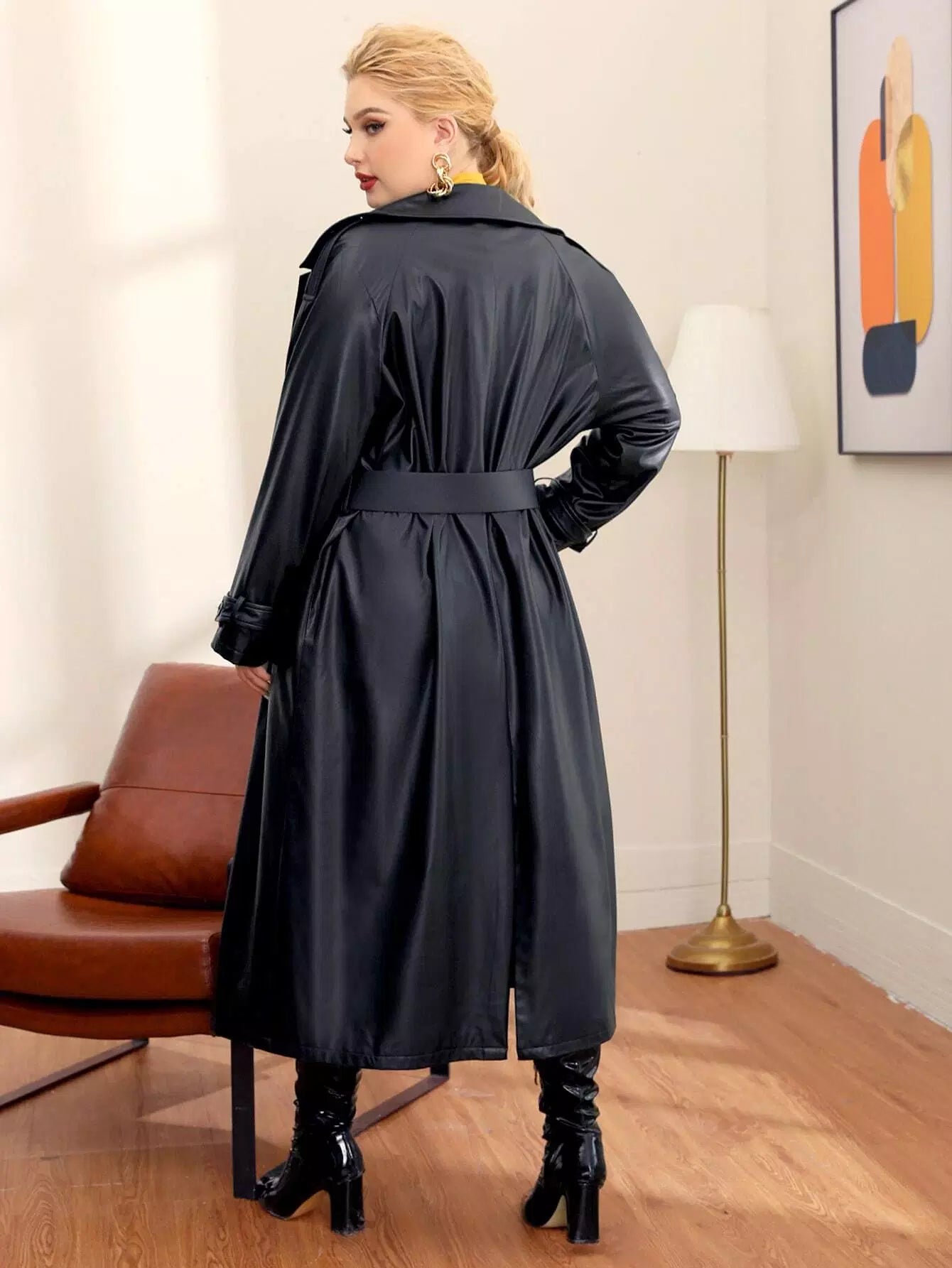 Plus Double Breasted Buckle PU Trench Coat Without Belt