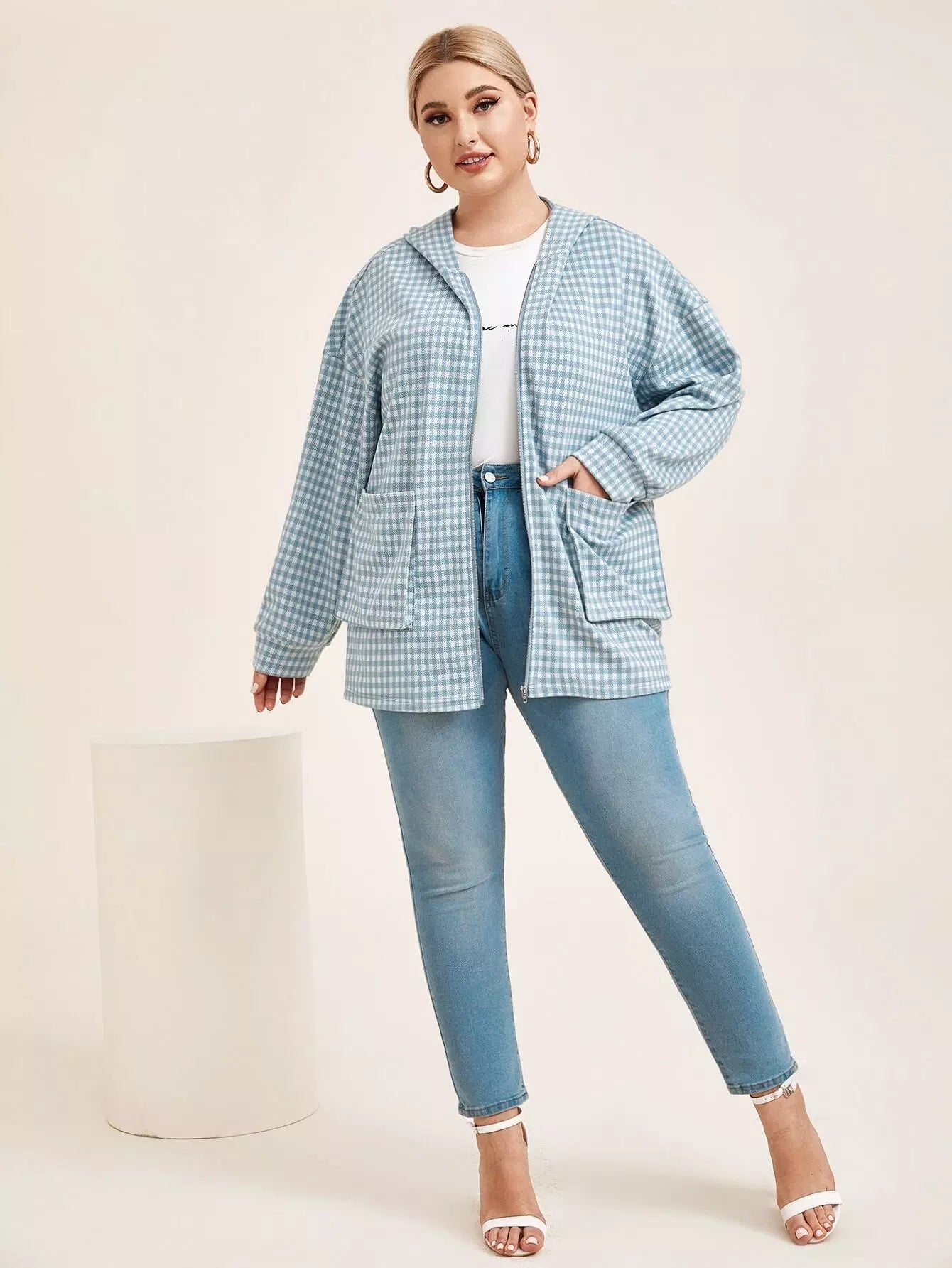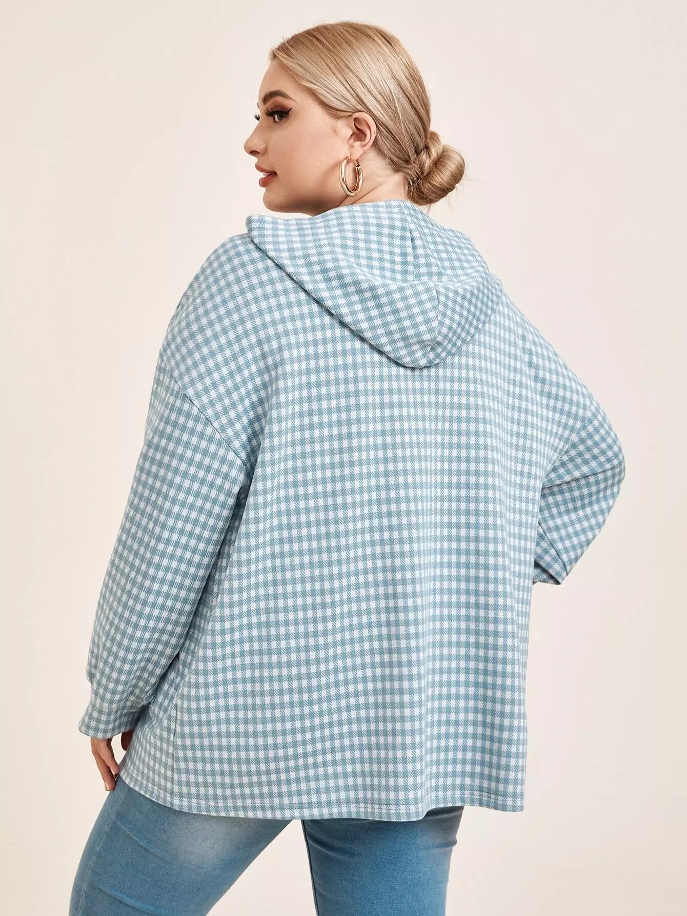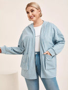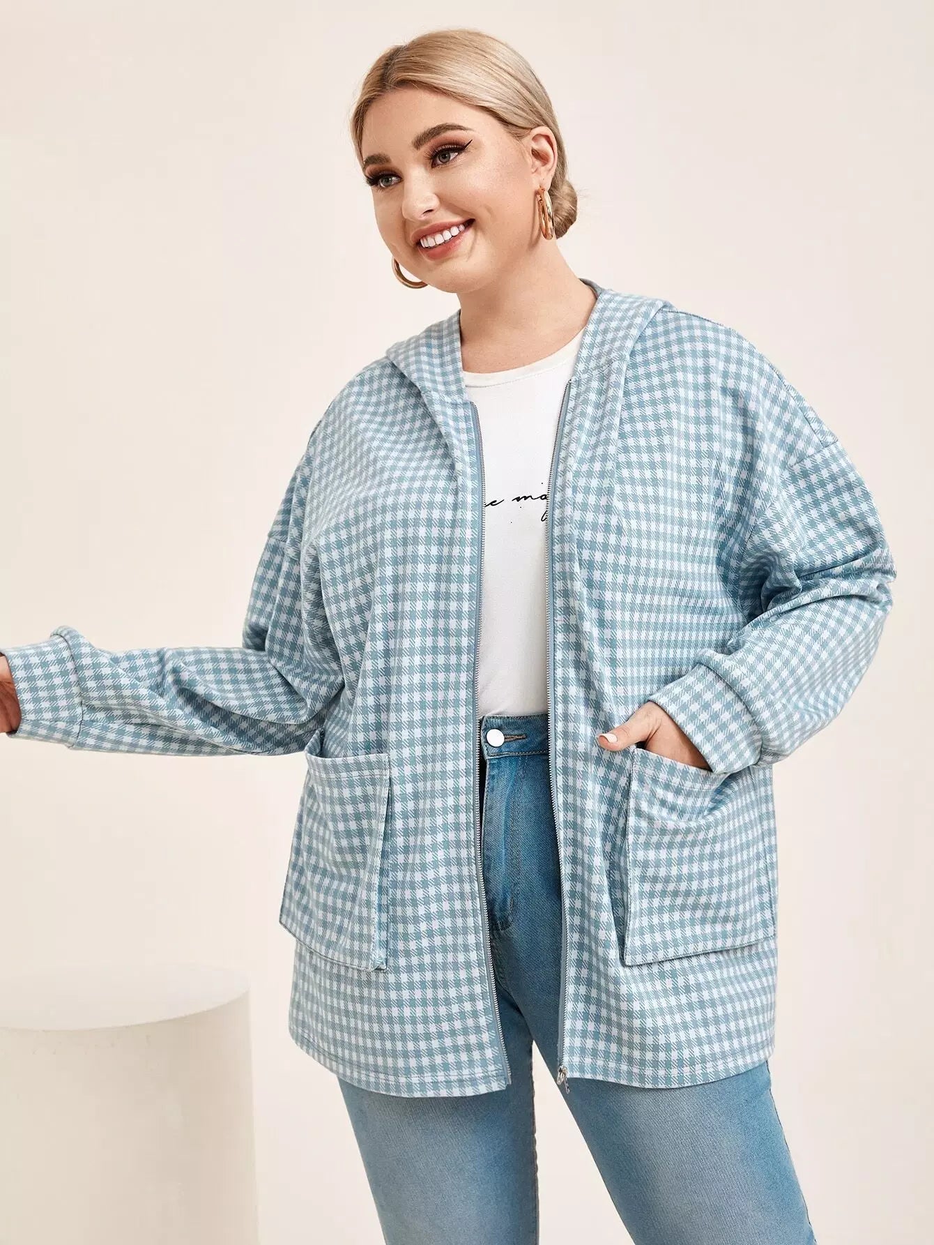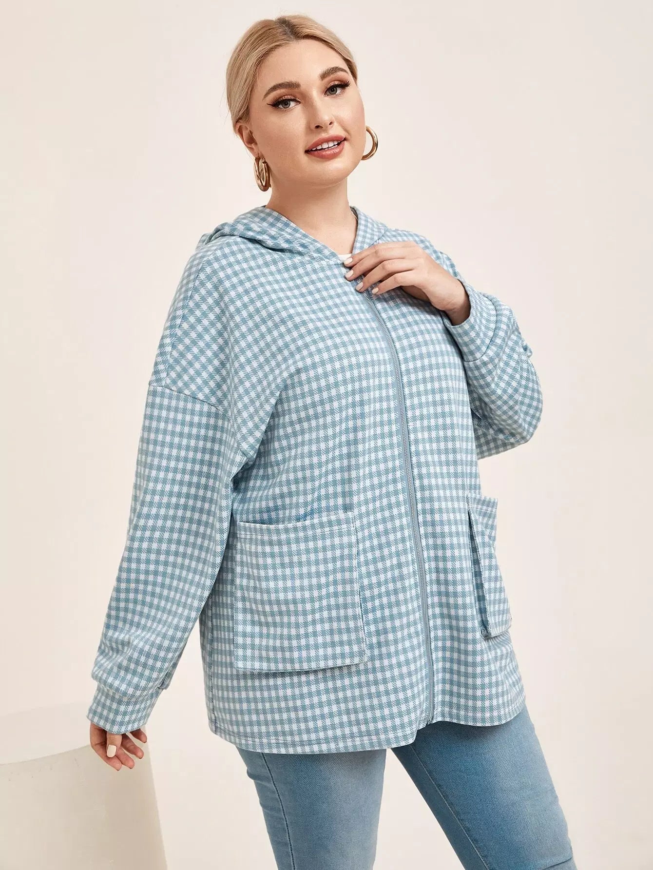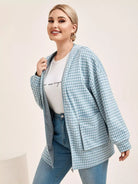 Plus Drop Shoulder Pocket Front Houndstooth Hooded Coat