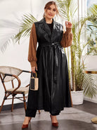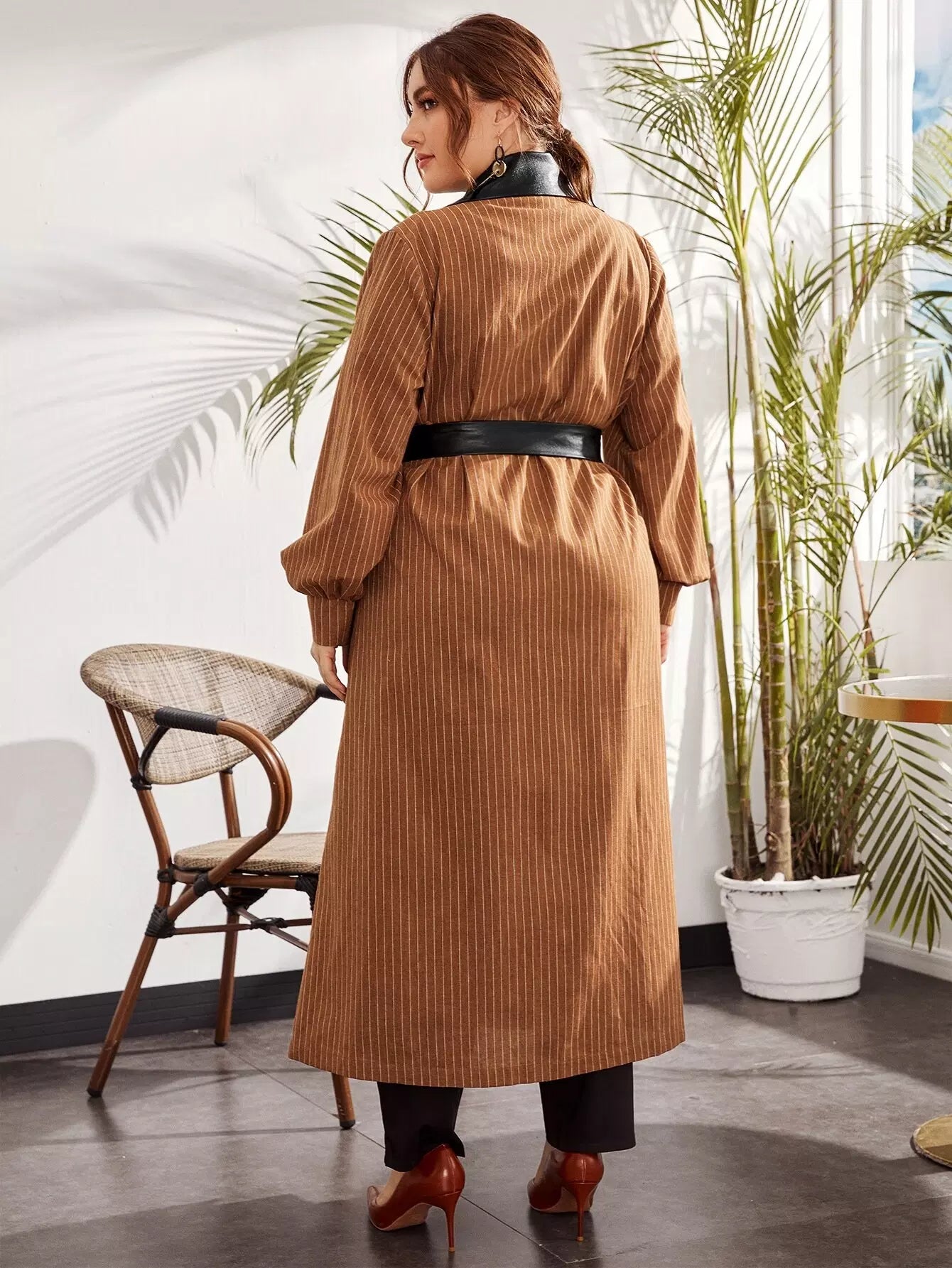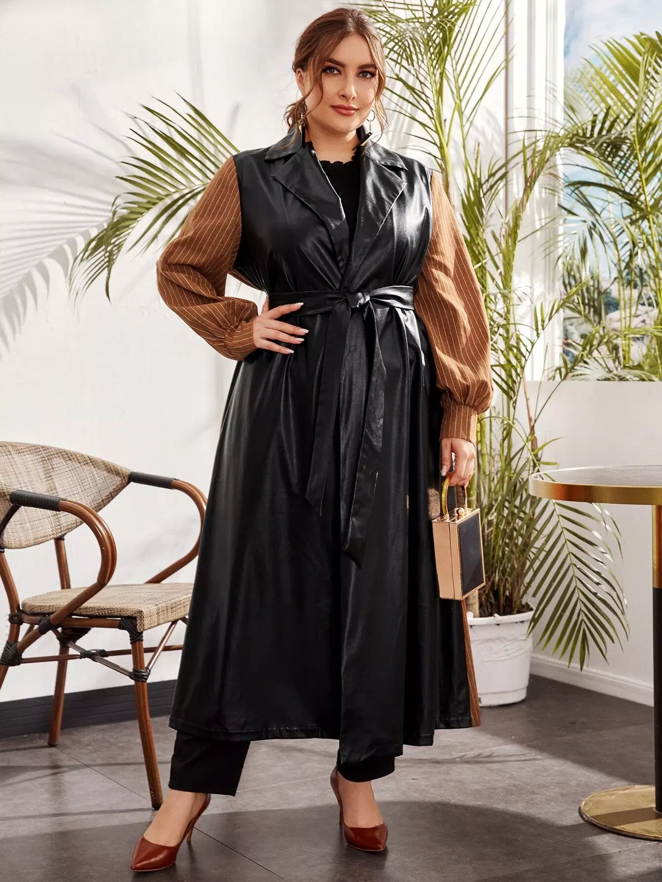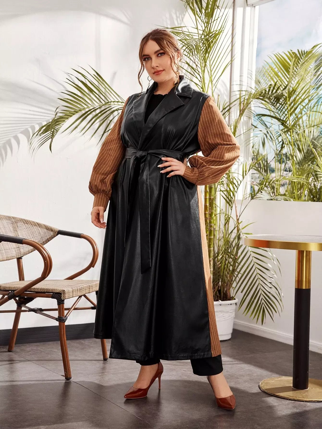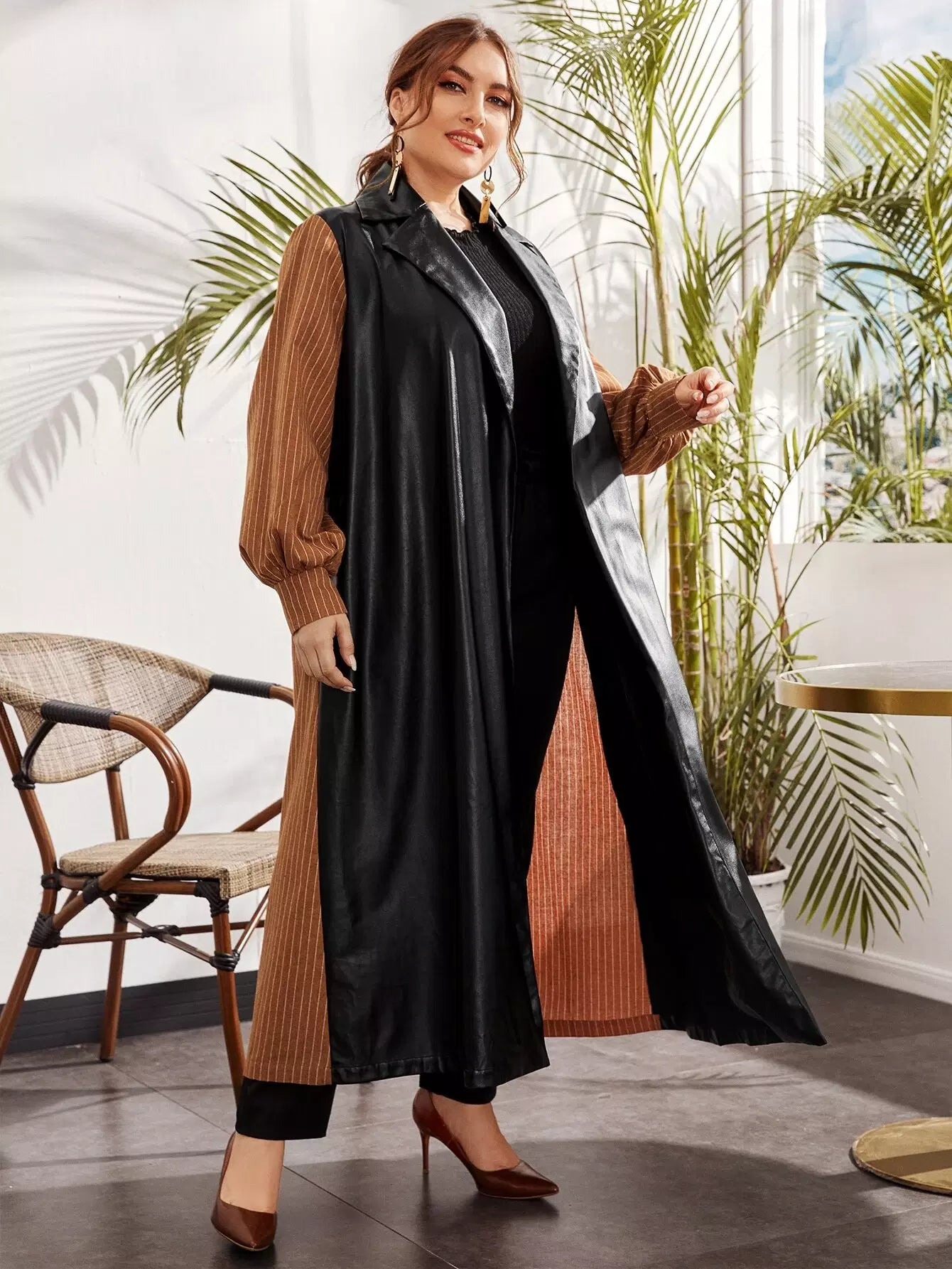 Plus Notch Collar Striped Panel Self Leather Look Coat Without Belt