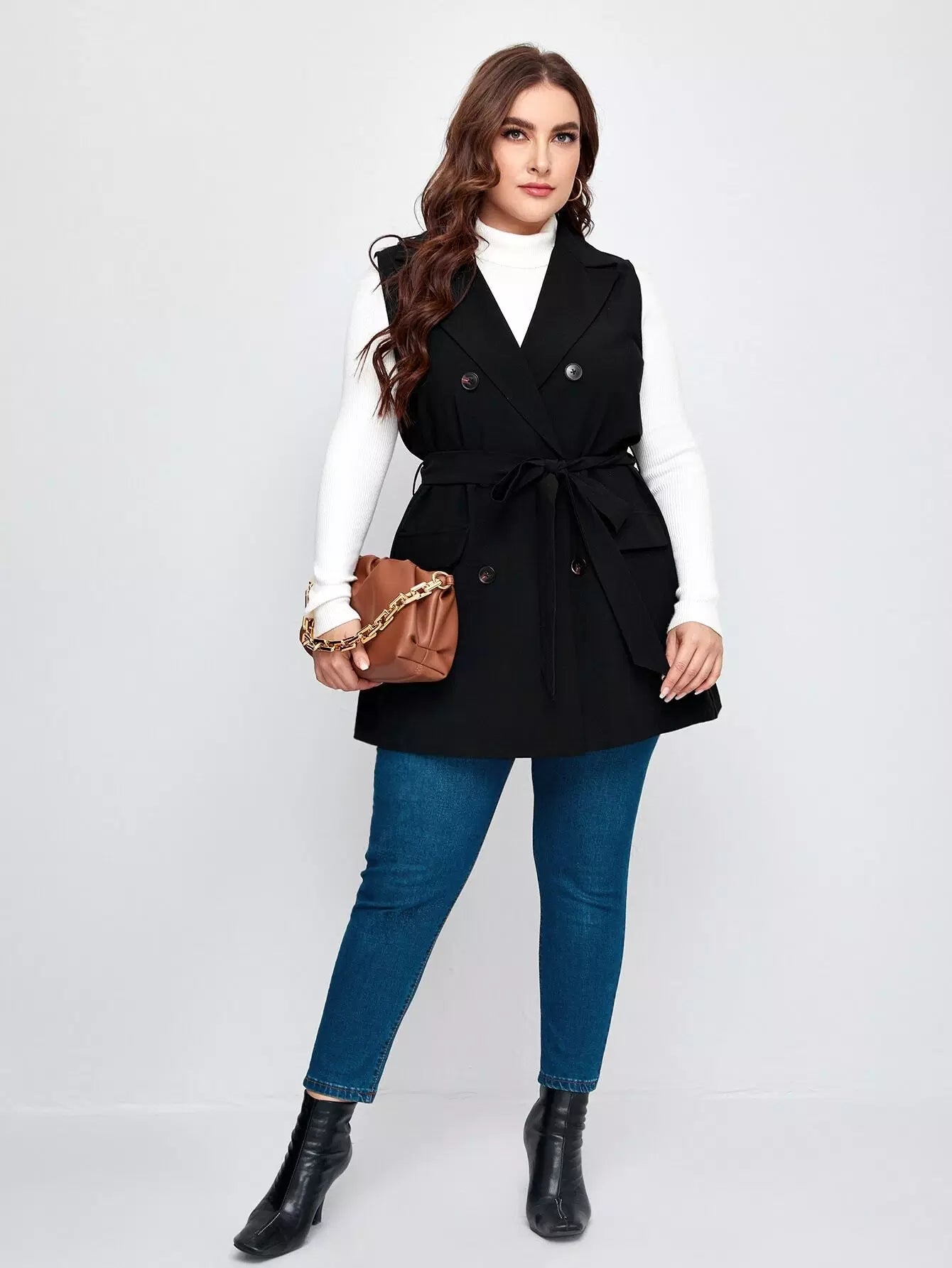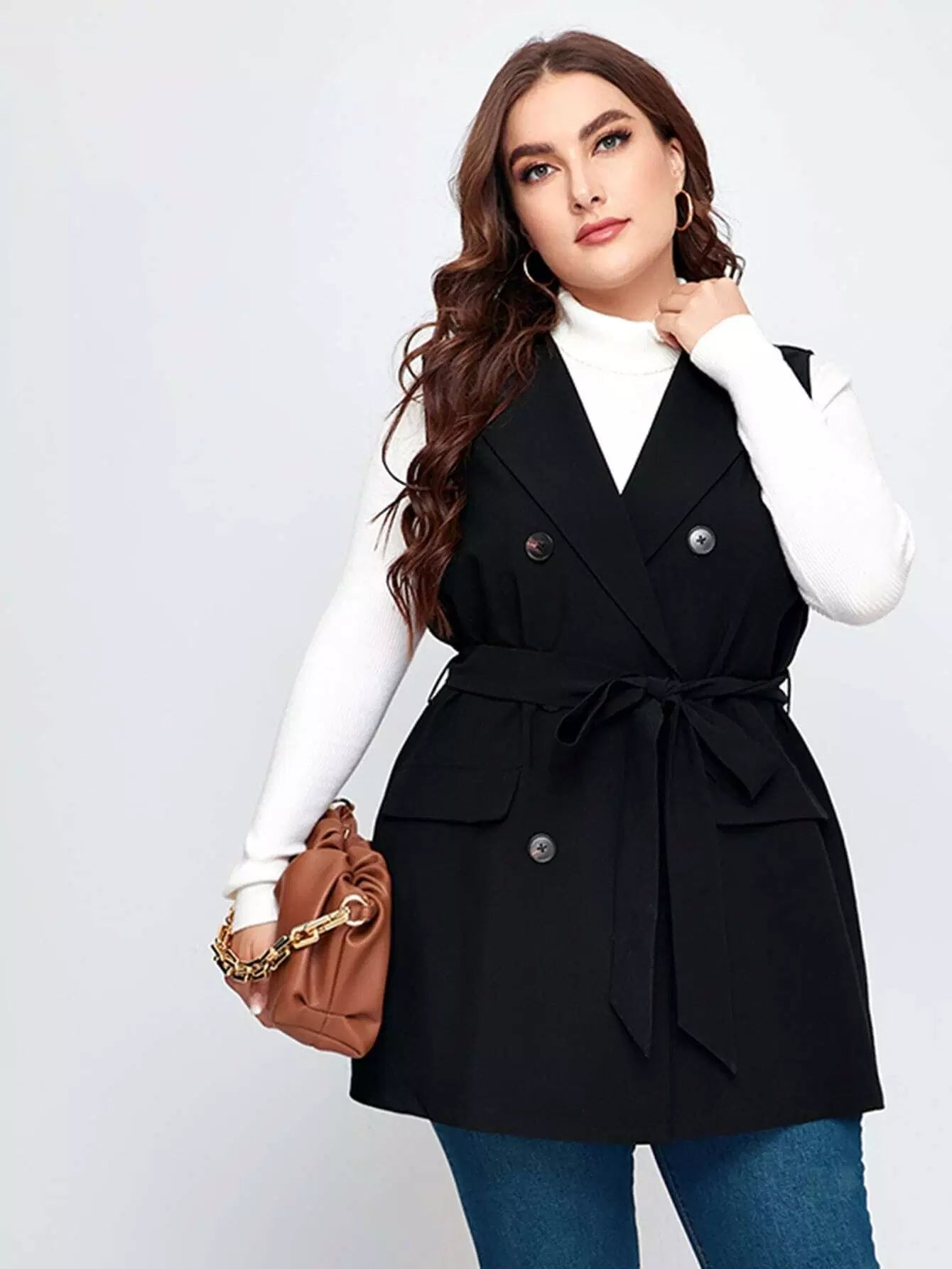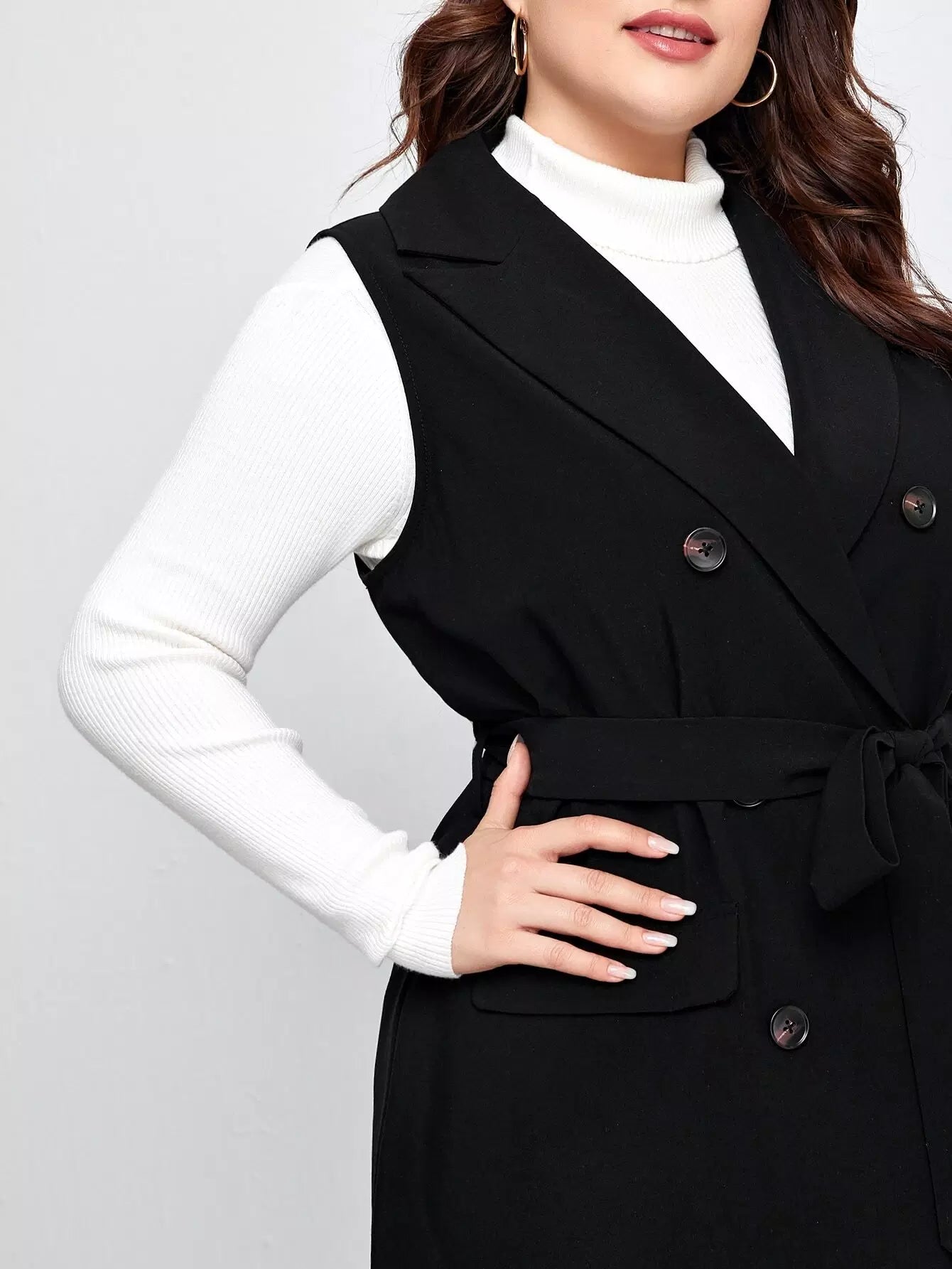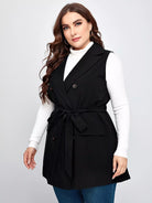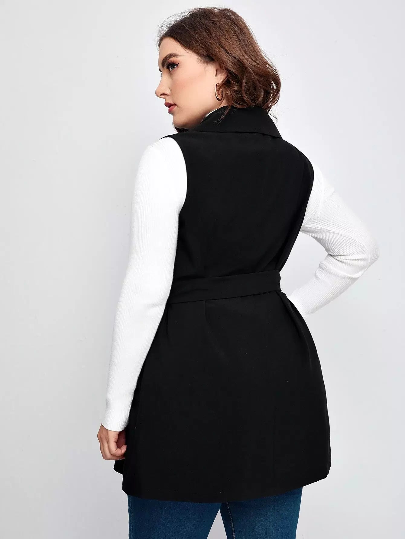 Plus Notched Collar Flap Detail Self Vest Without Belt