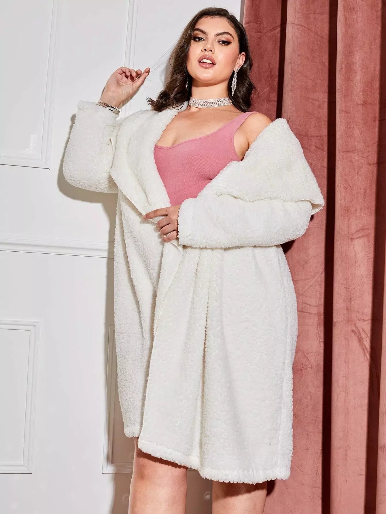 Plus Waterfall Collar Open Front Teddy Coat Without Belt