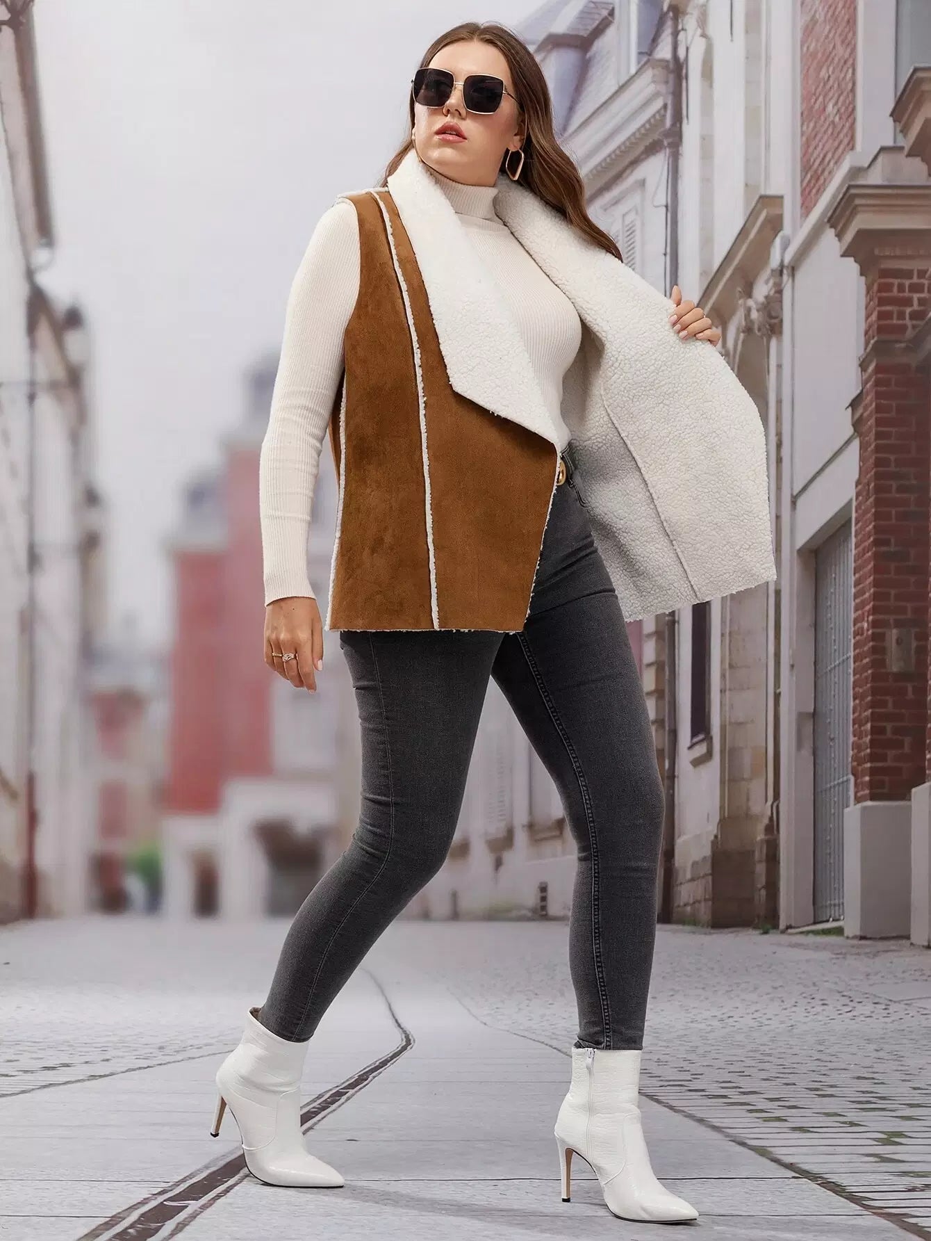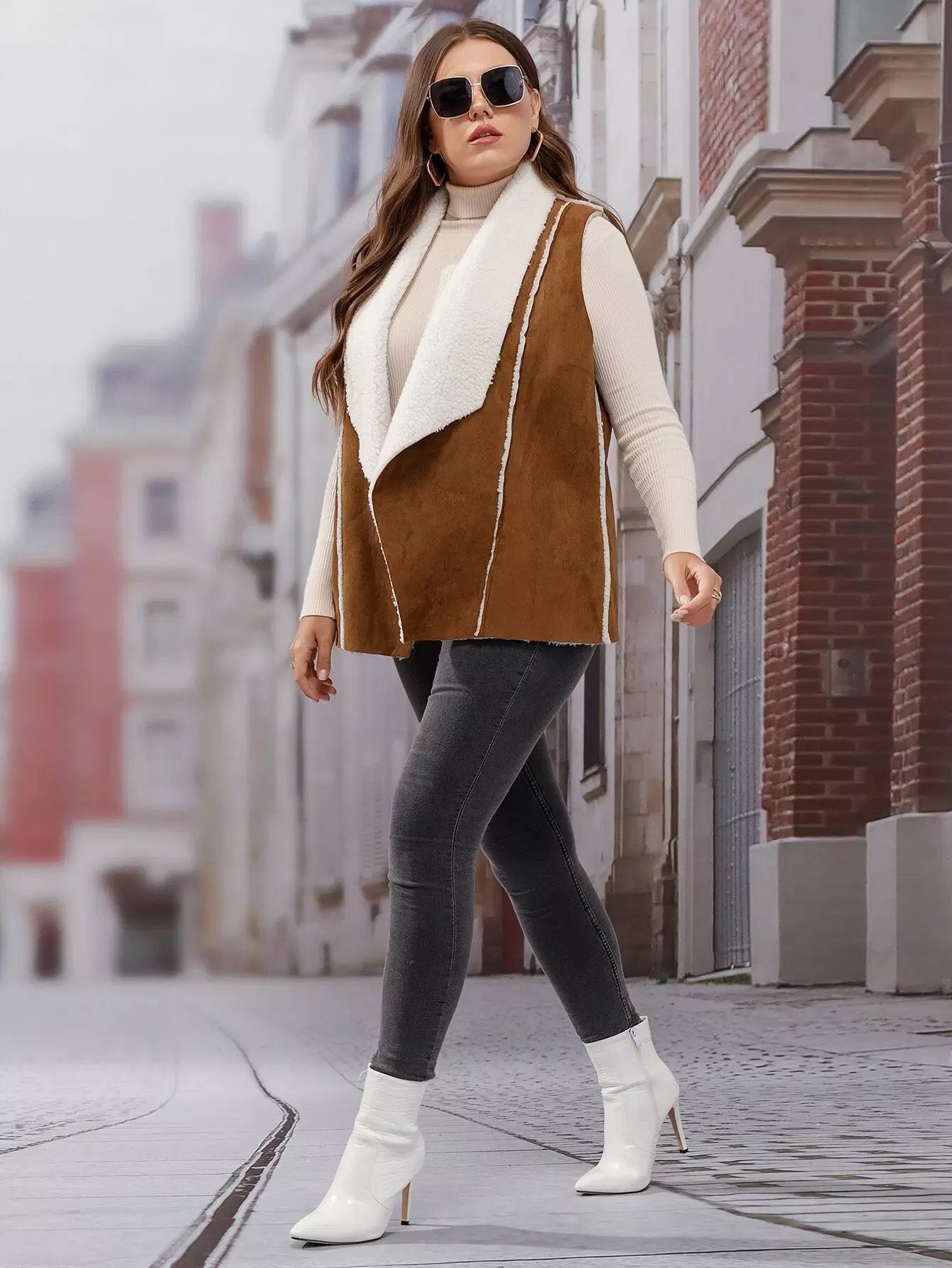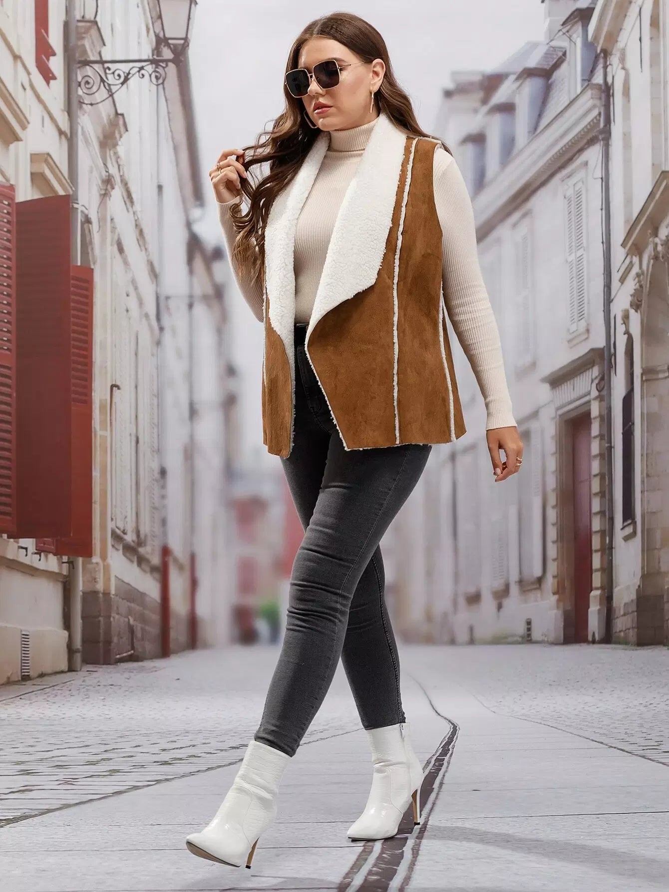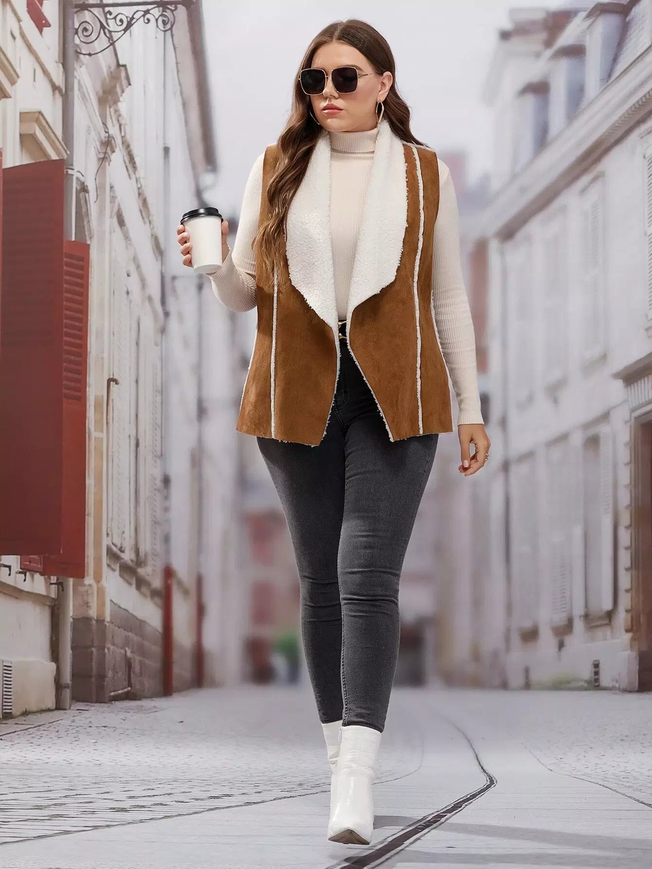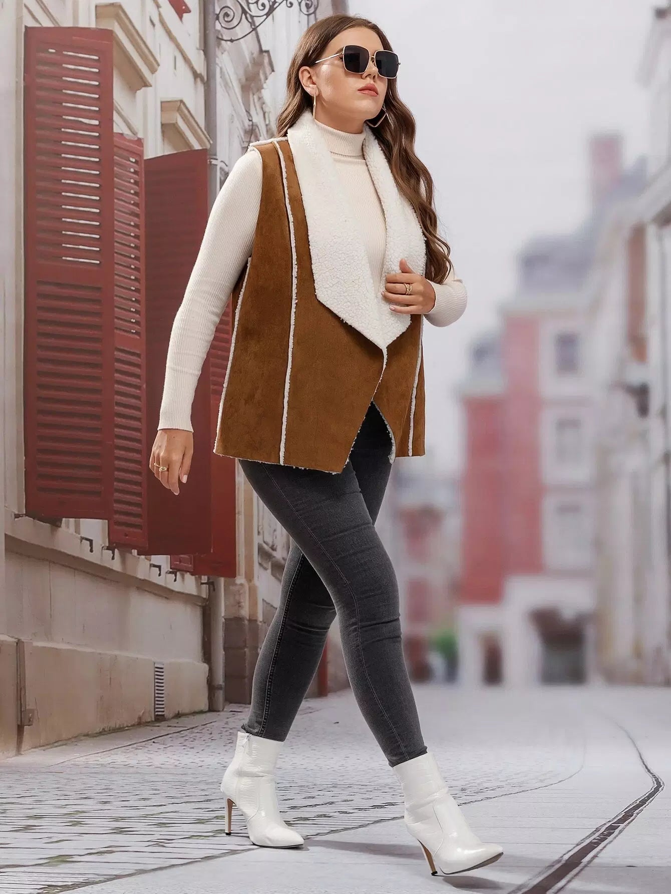 Plus Waterfall Collar Sleeveless Teddy Lined Coat