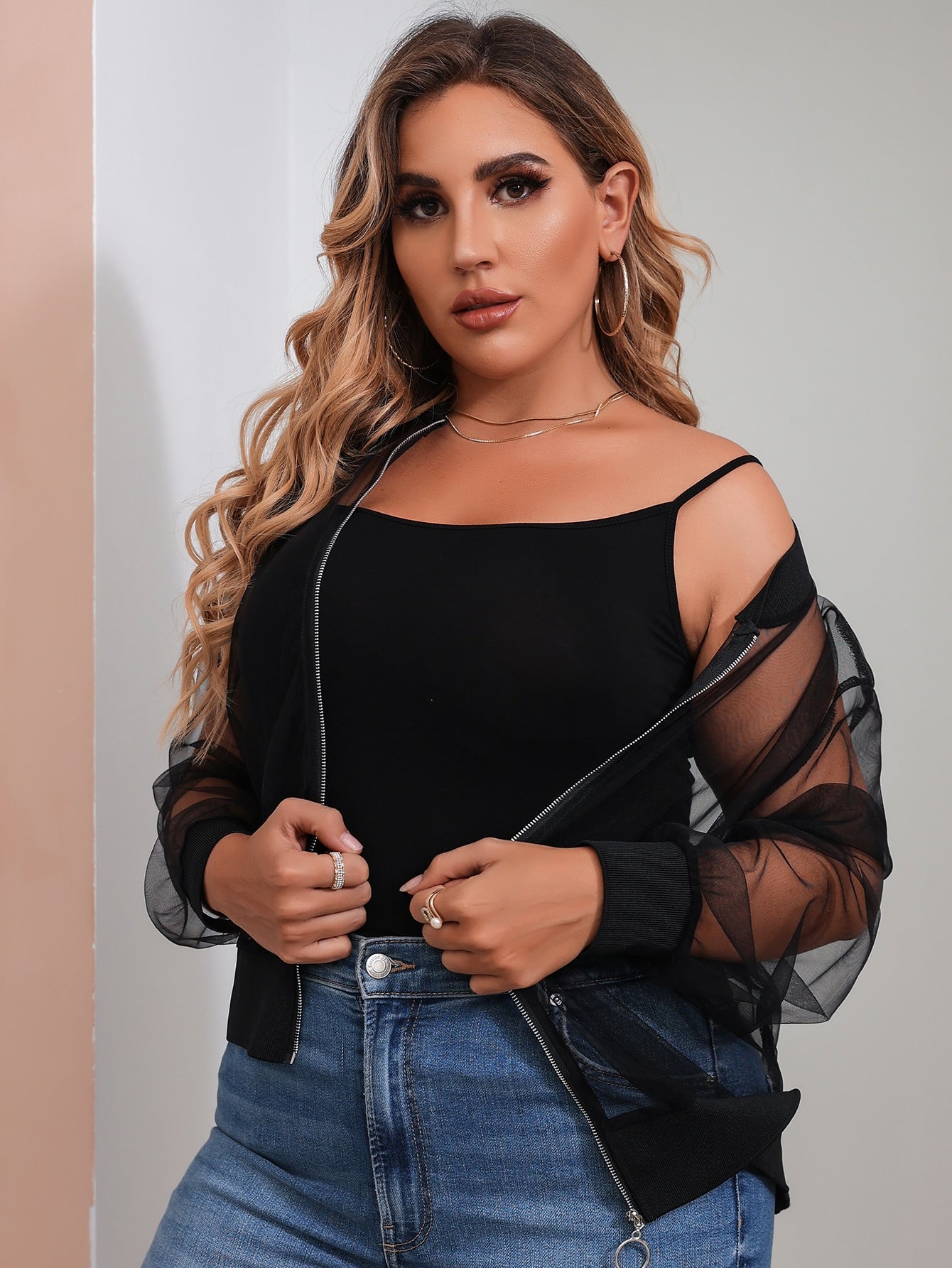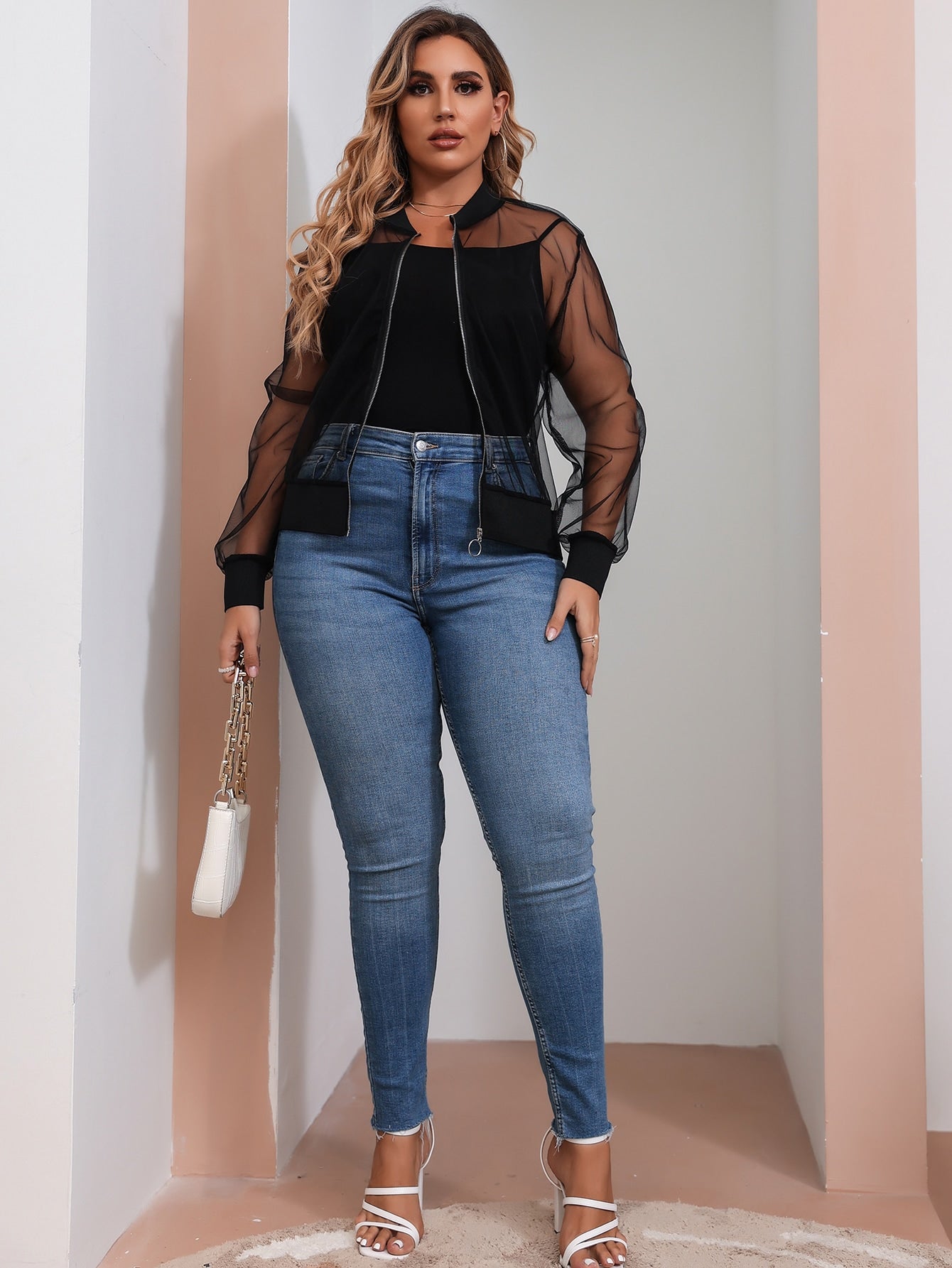 Calvaya Plus Solid Zip Up Mesh Bomber Jacket Fall Winter Cloth For Women Autumn