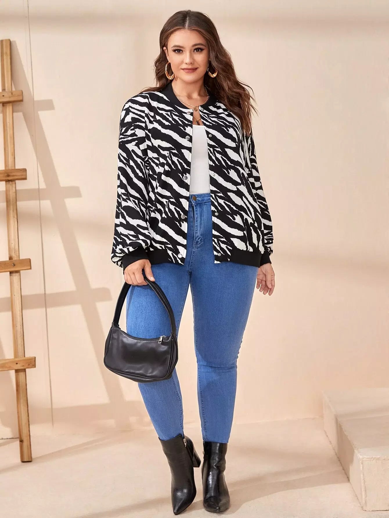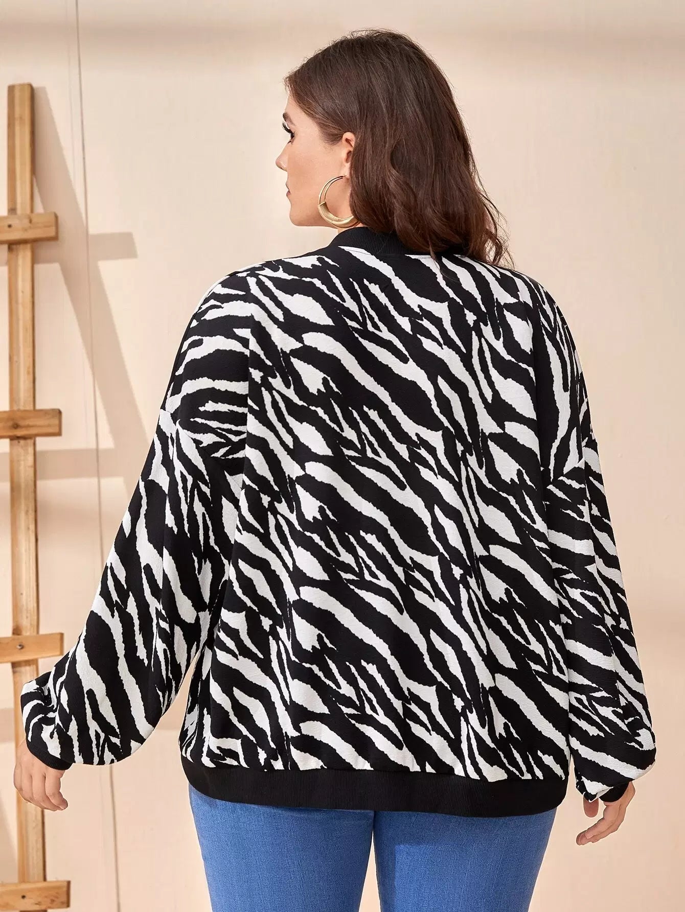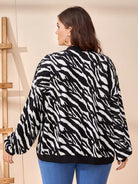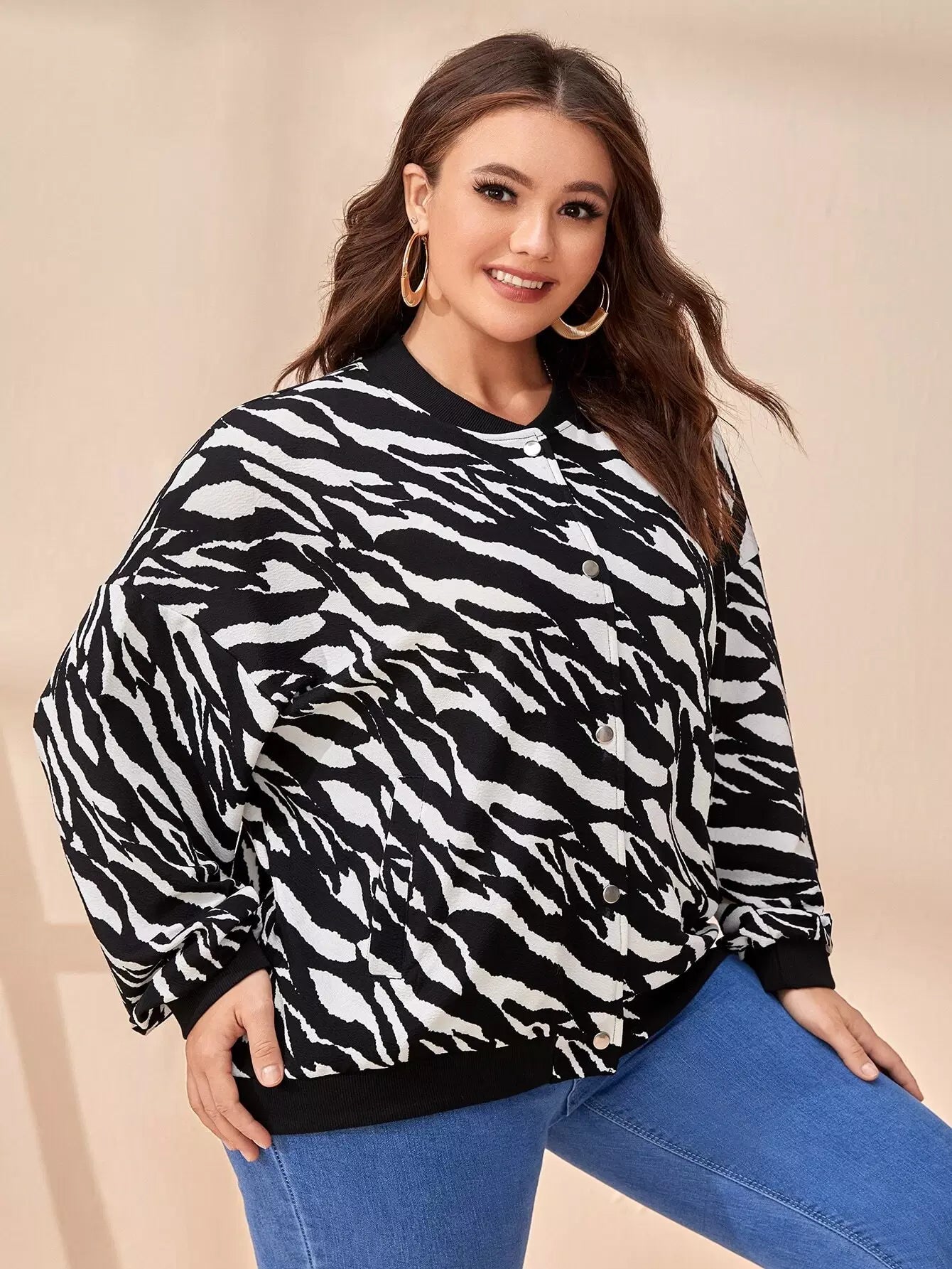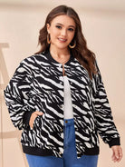 Plus Zebra Striped Slant Pockets Drop Shoulder Bomber Jacket