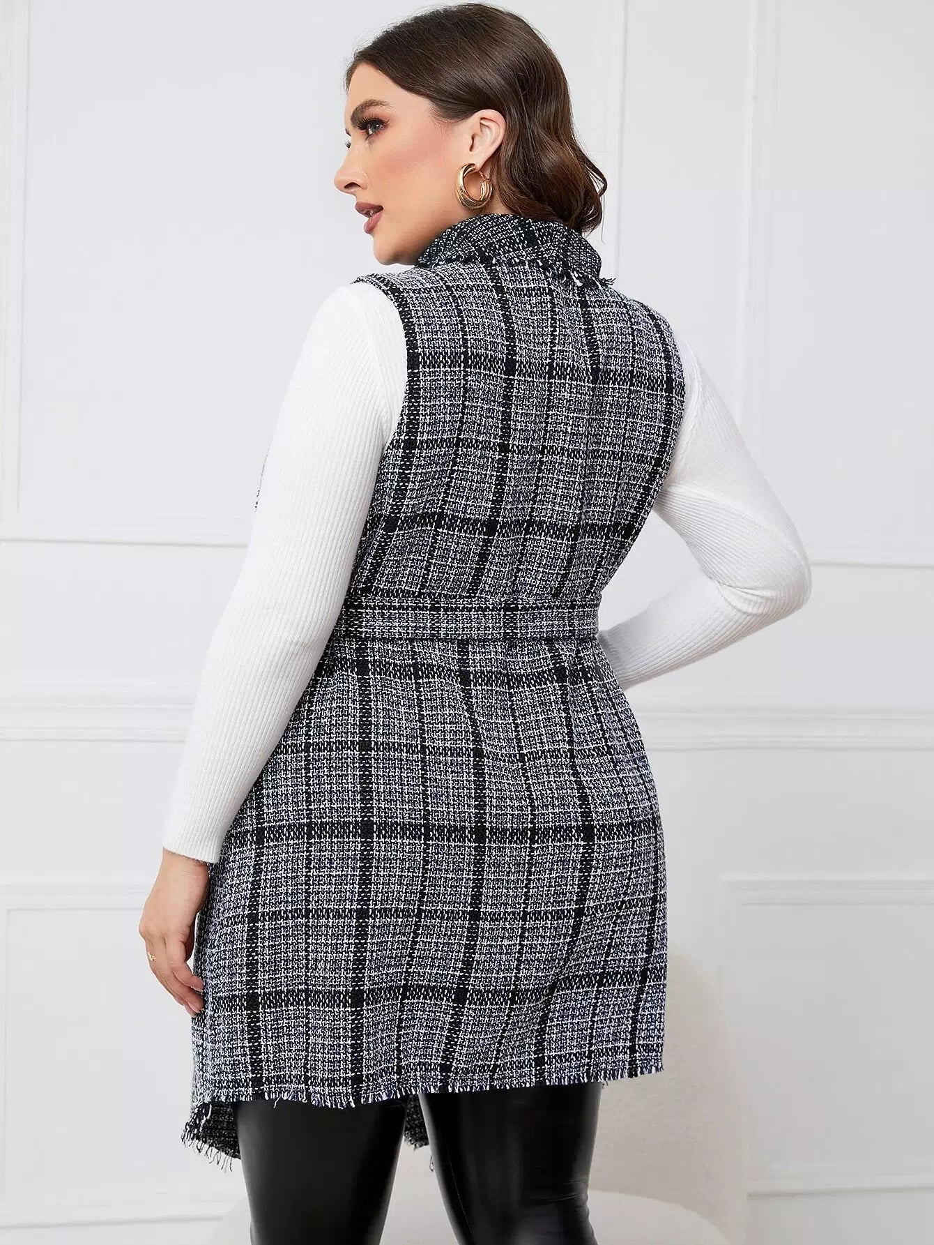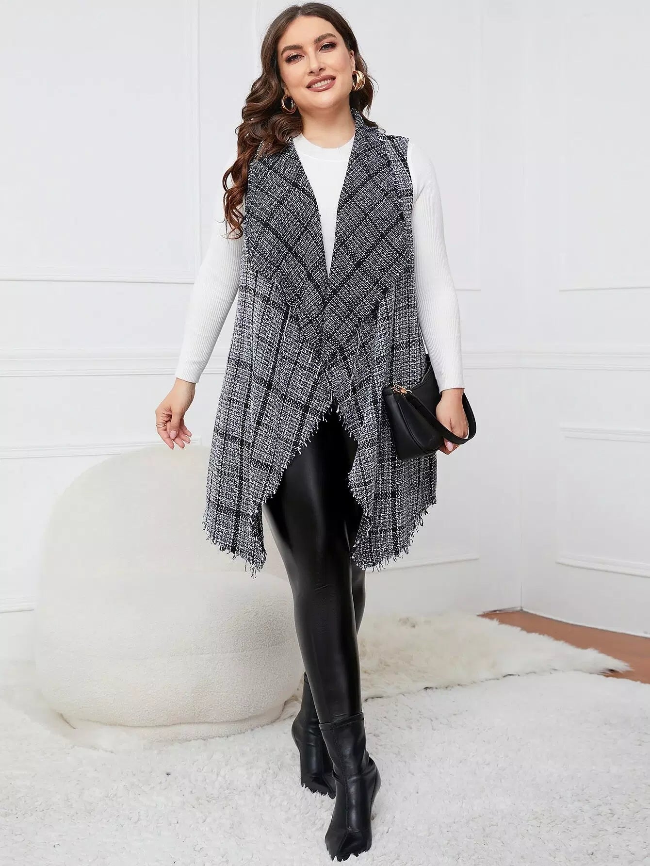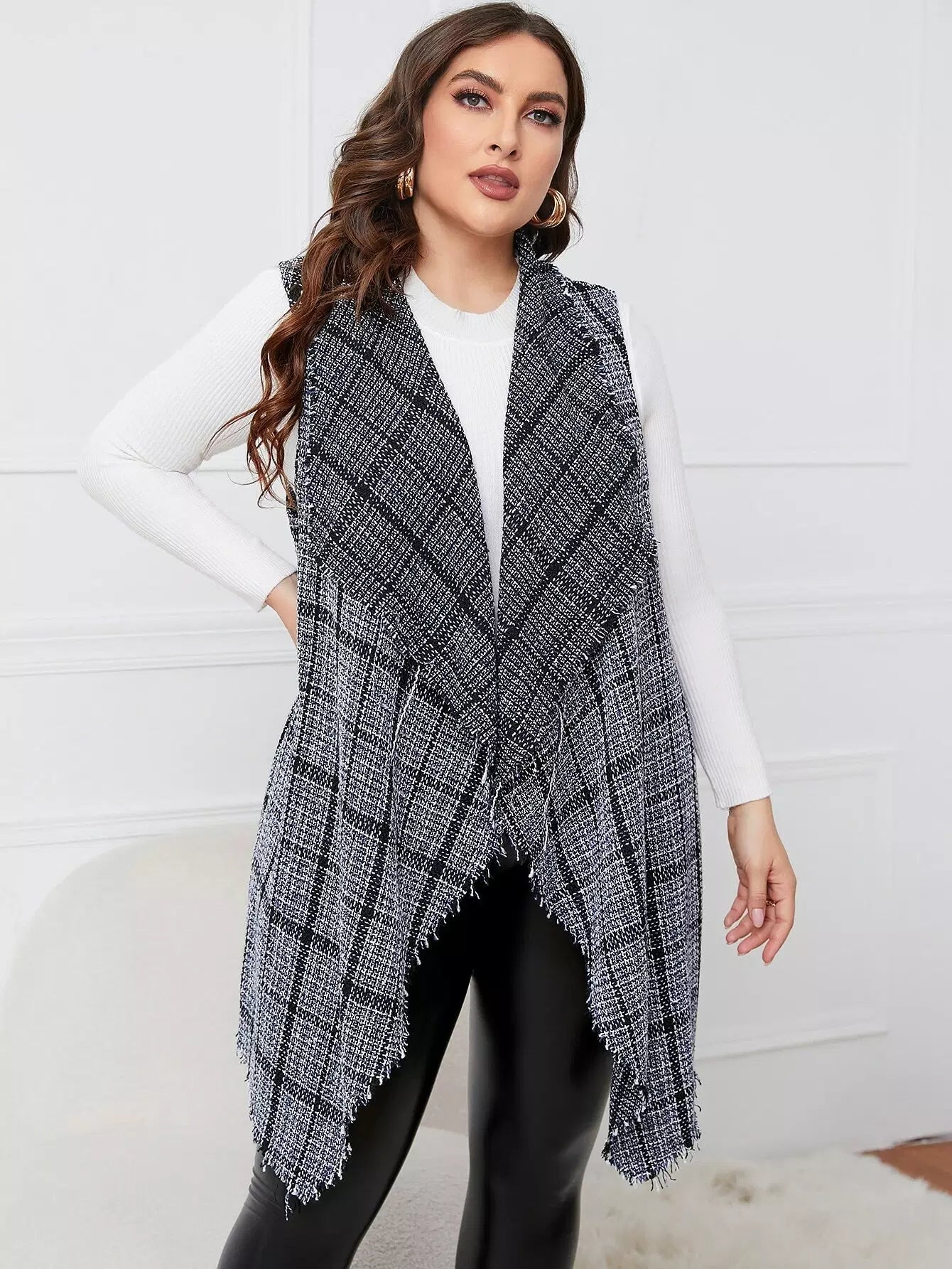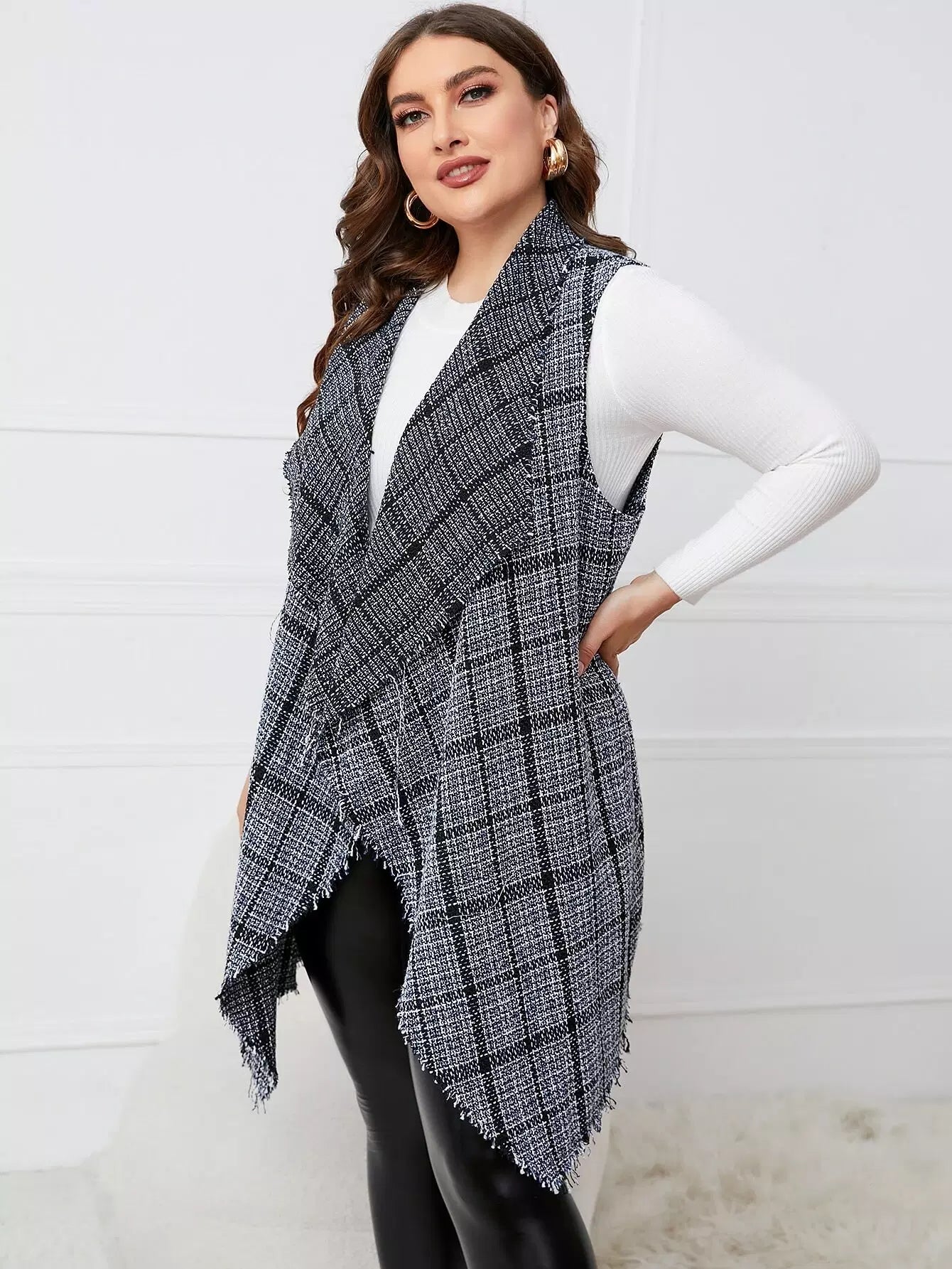 Plus Plaid Waterfall Collar Raw Trim Overcoat