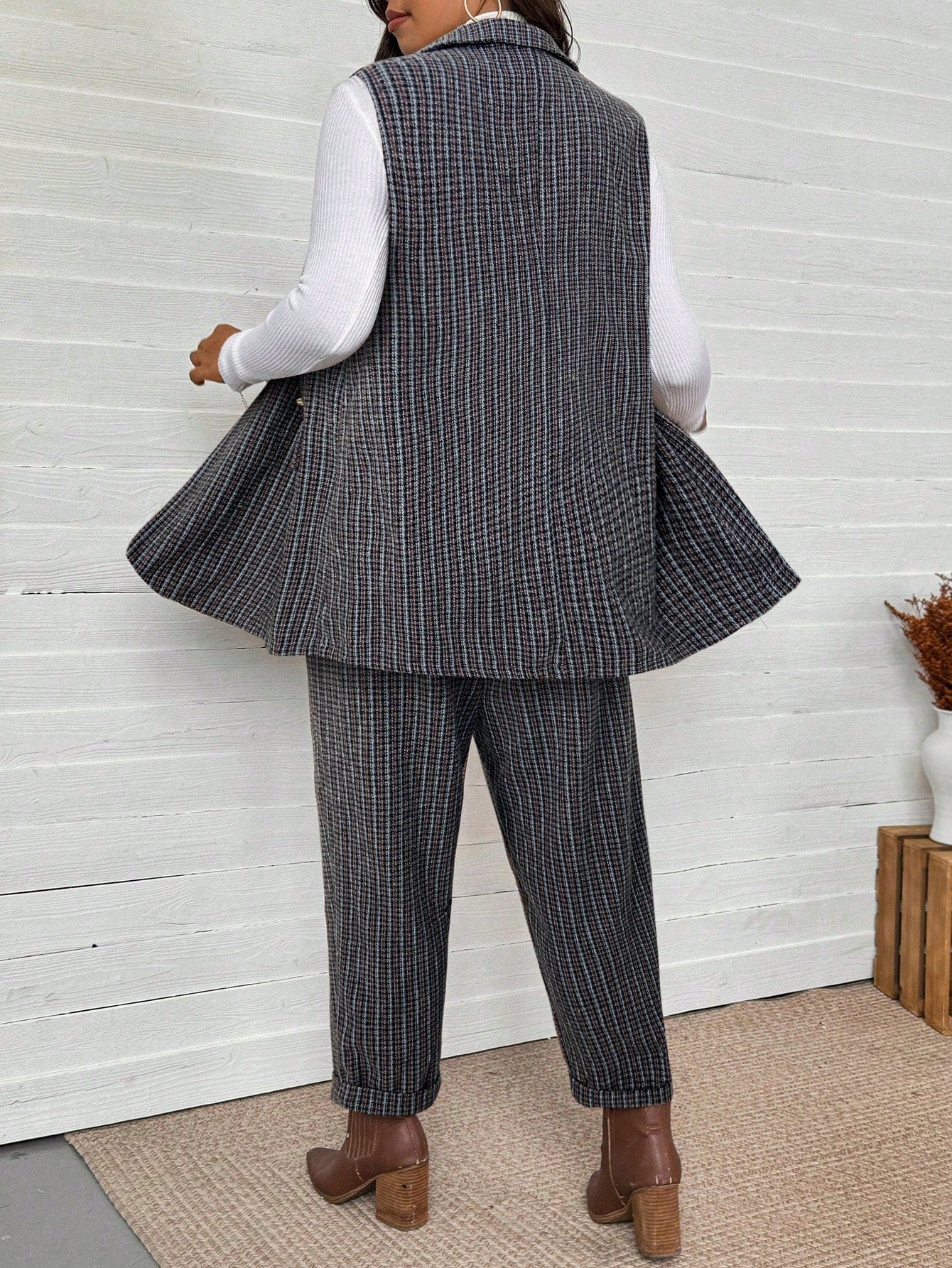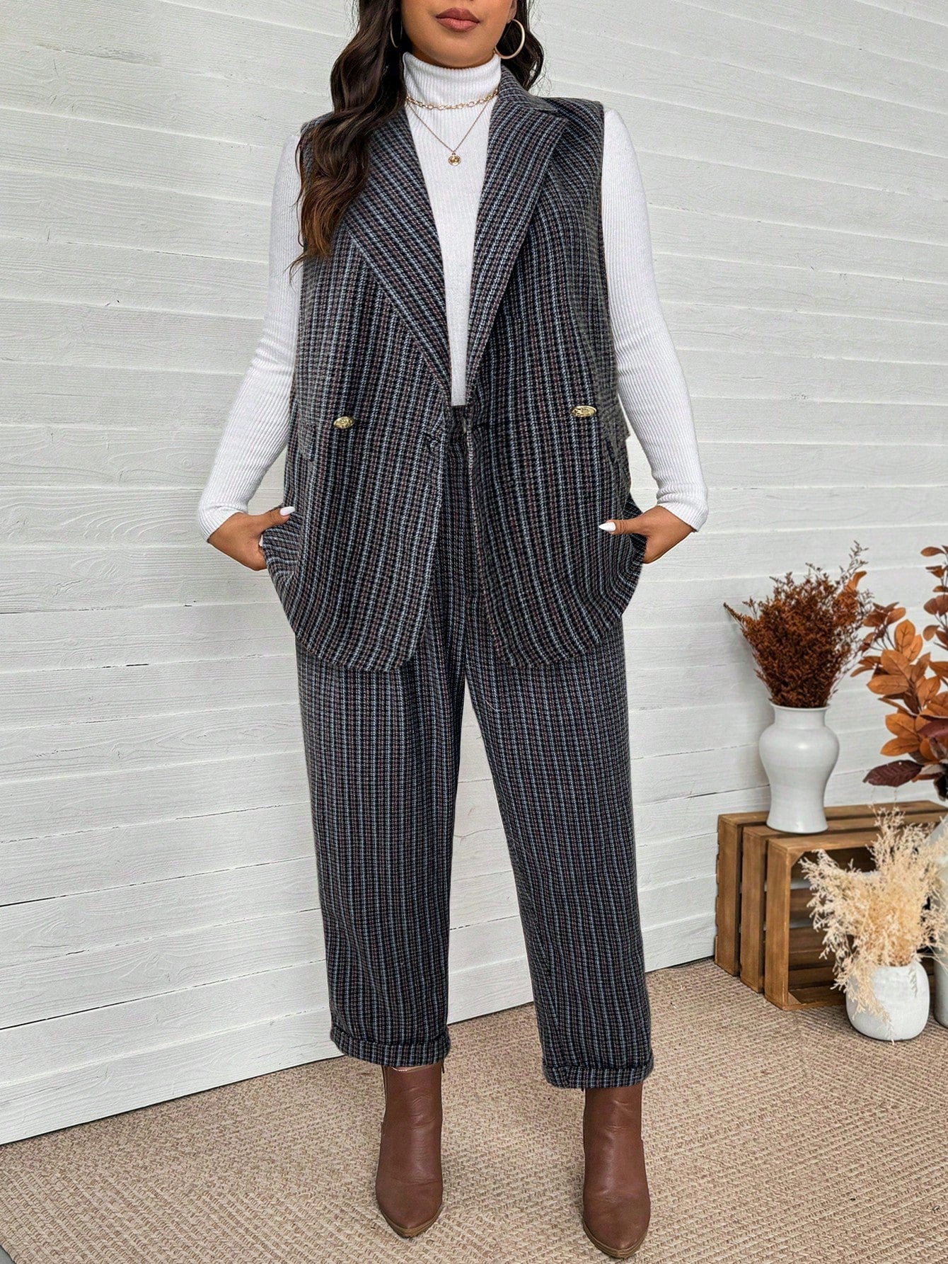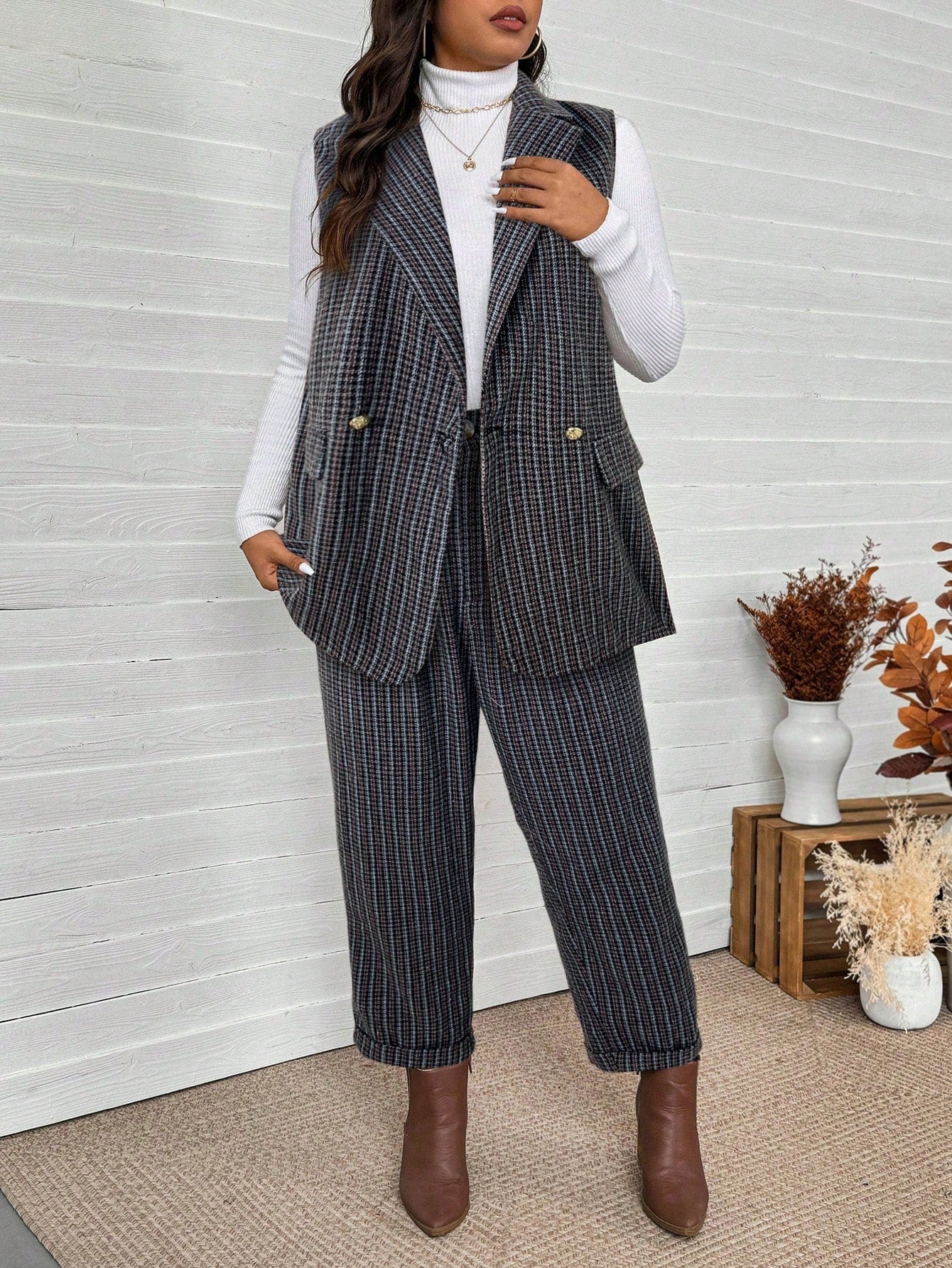 LUNE Plus Size Women Plaid Shirt Collar Double-Breasted Sleeveless Jacket & Pants Casual 2 Pieces Set,