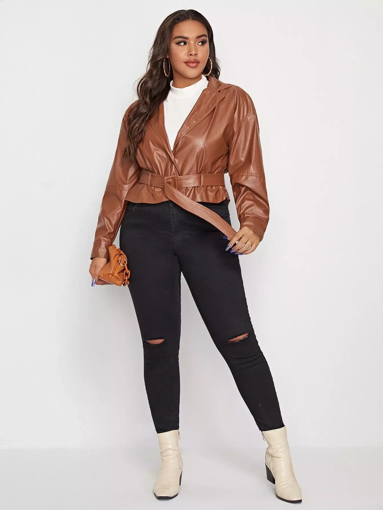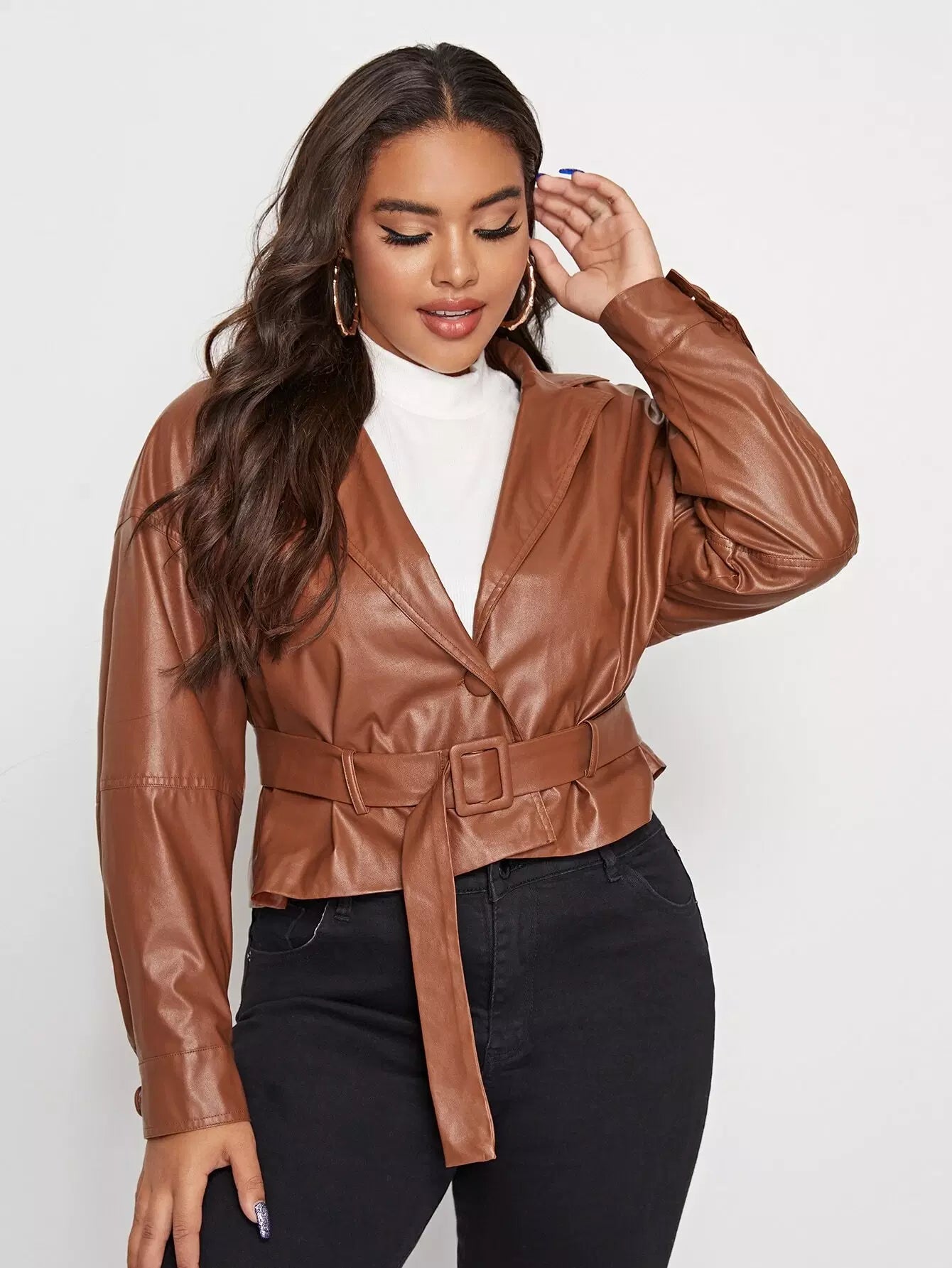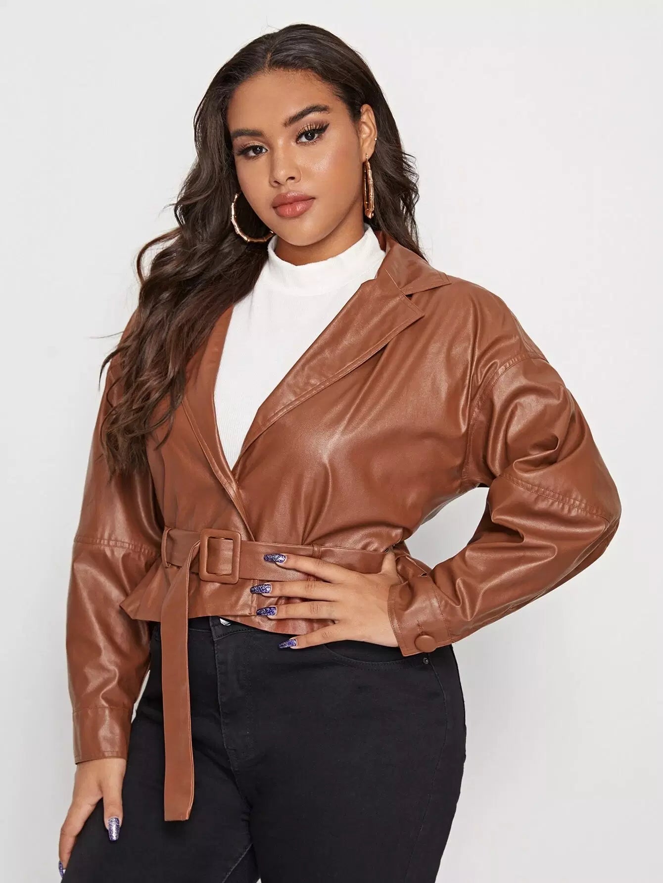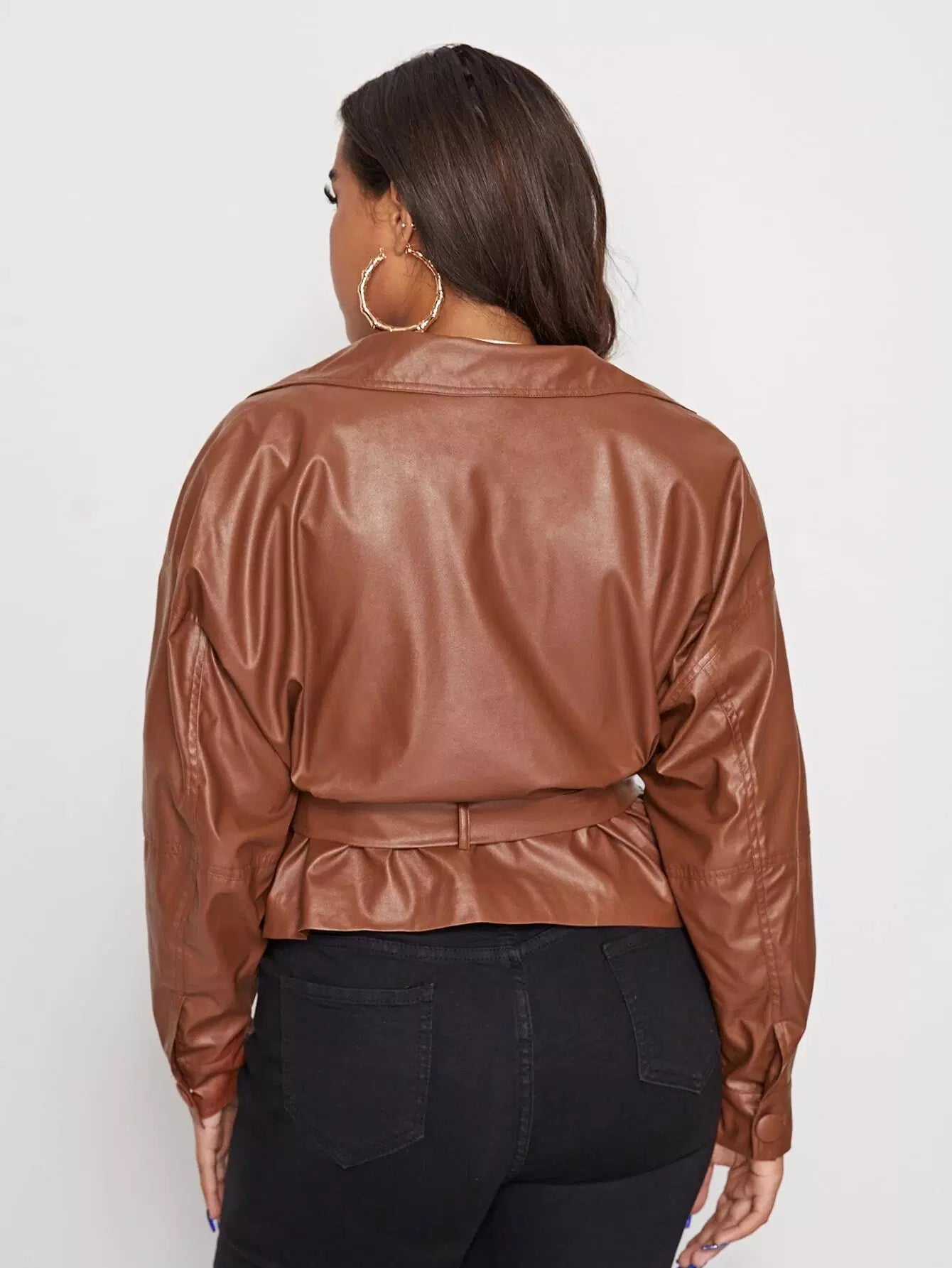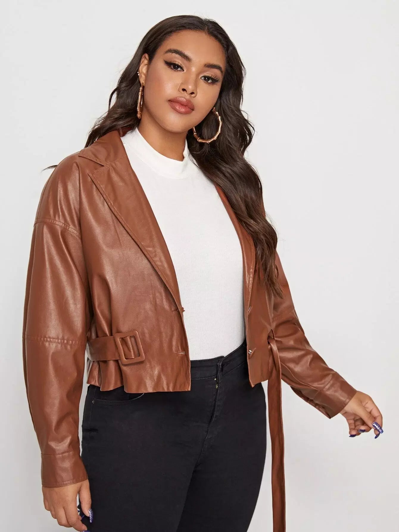 Plus Notched Collar Buckle PU Leather Blazer Without Belt