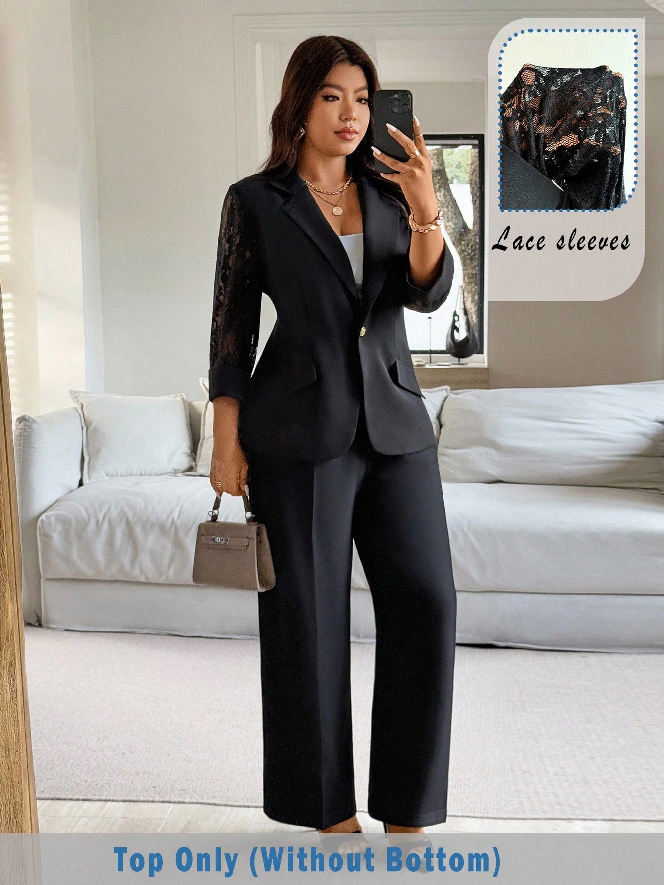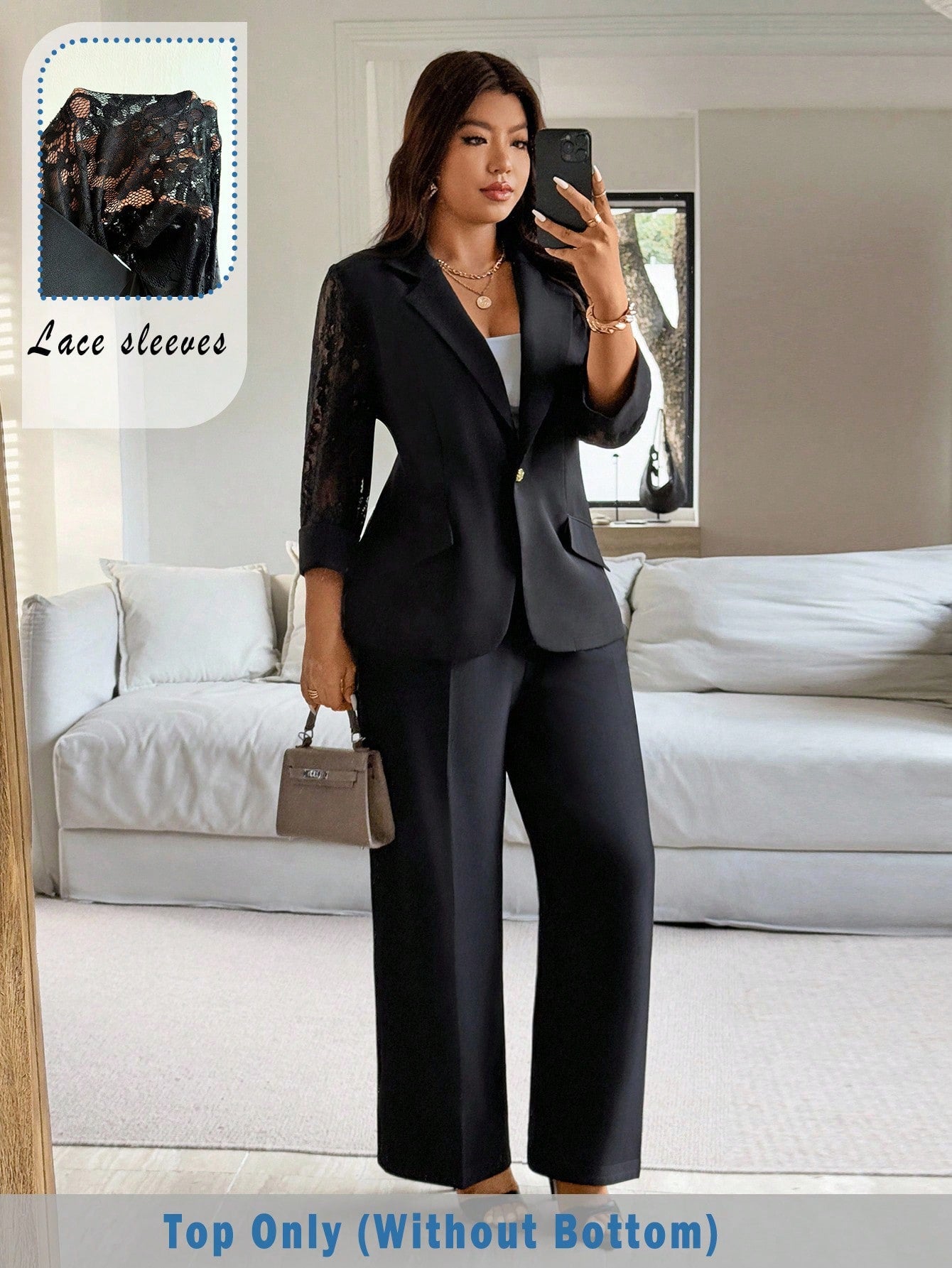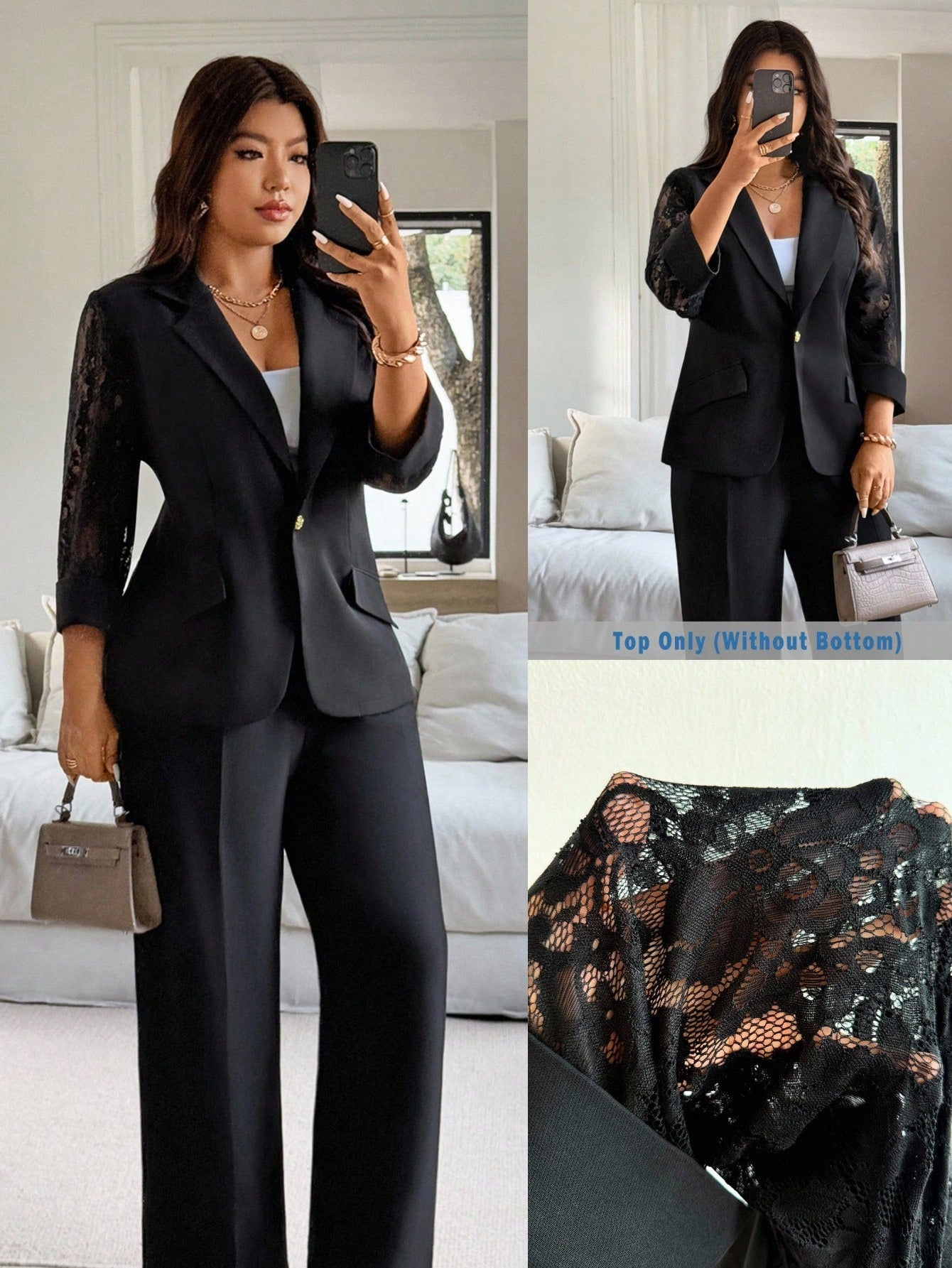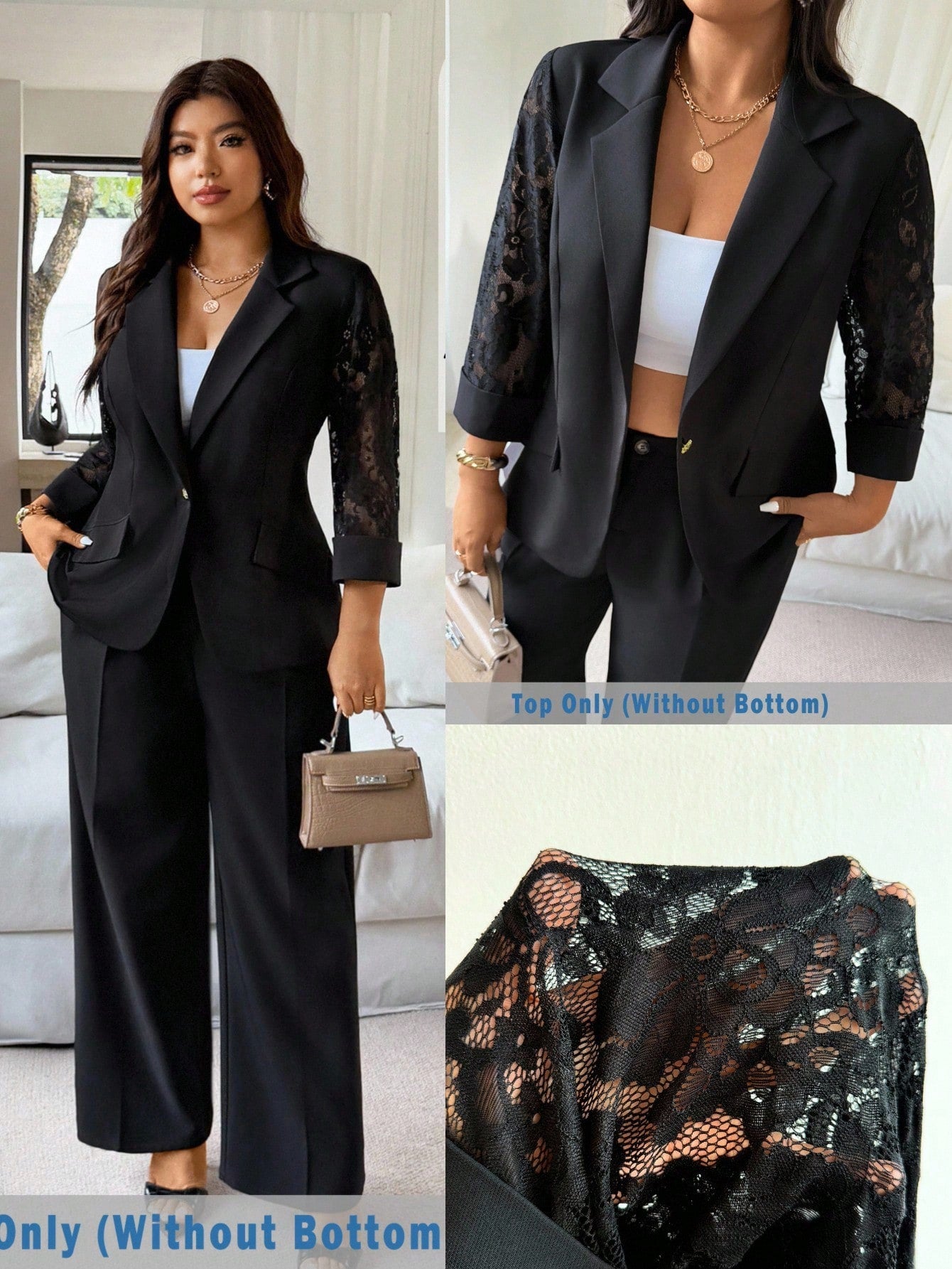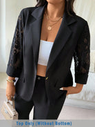 Vionelle Fashionable Casual French Retro Elegant 3/4 Sleeve Office Lace & Mesh Panel Blazer Black Pantsuit