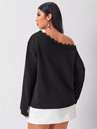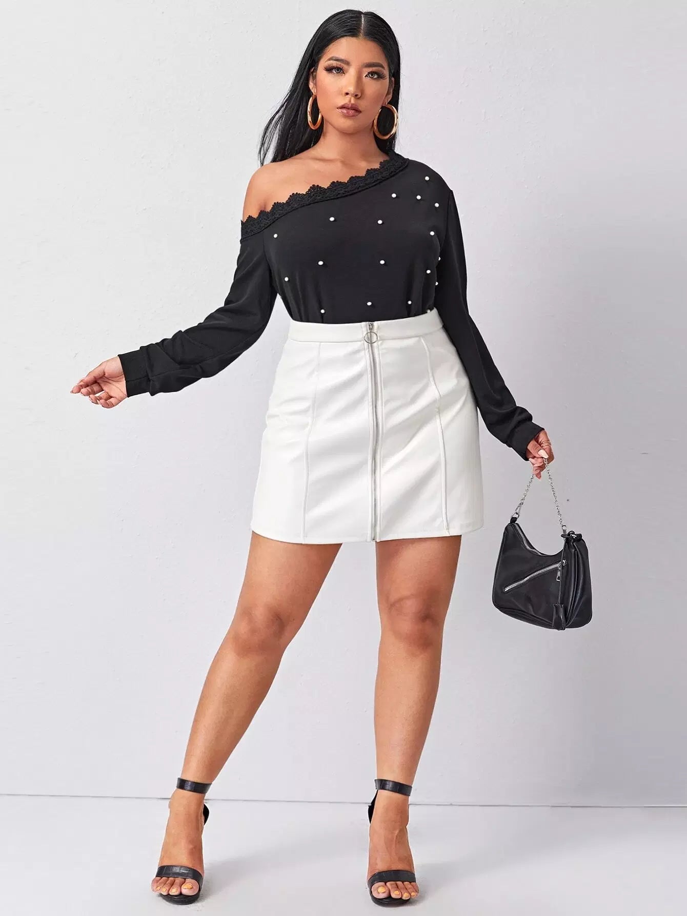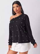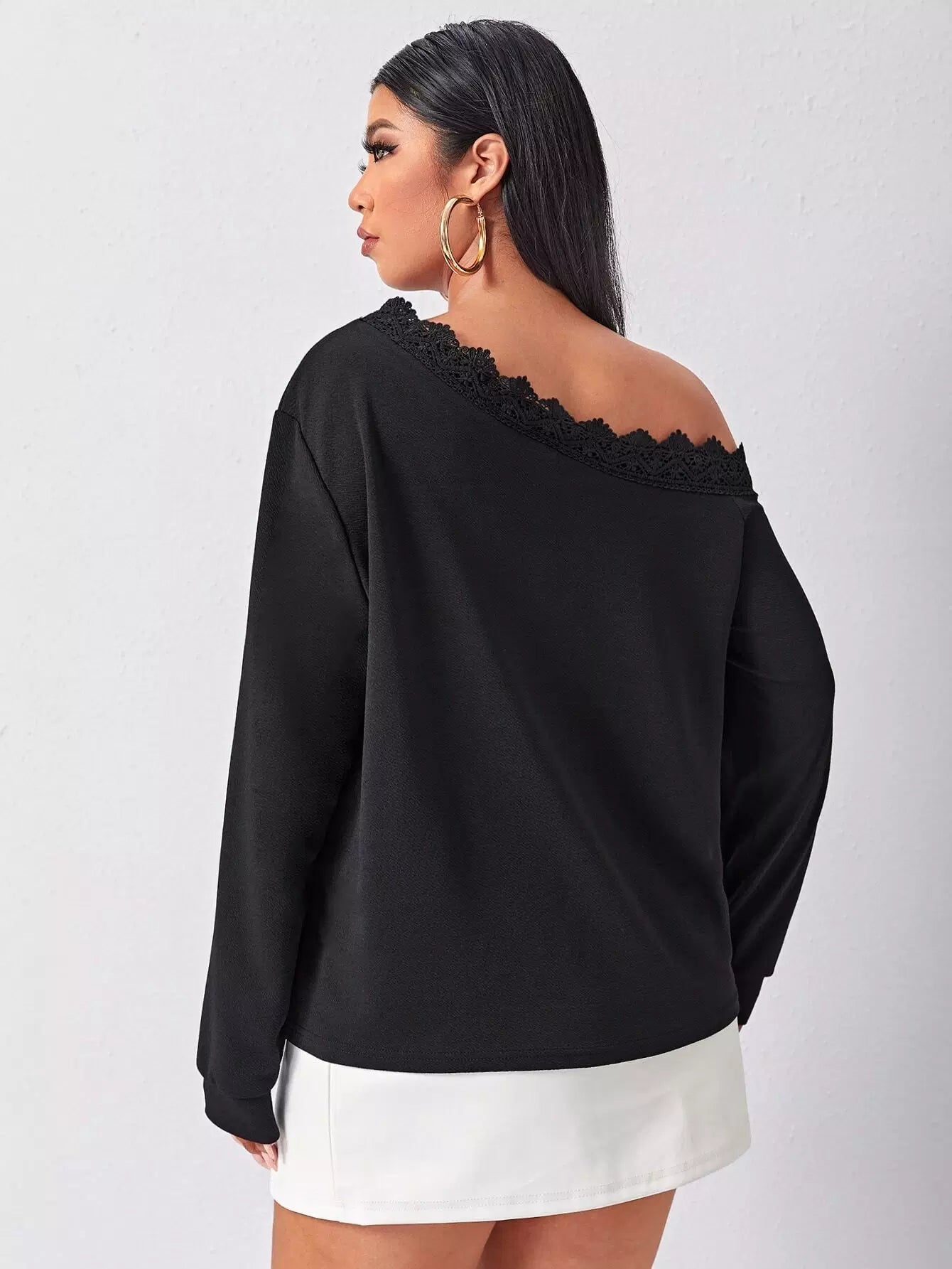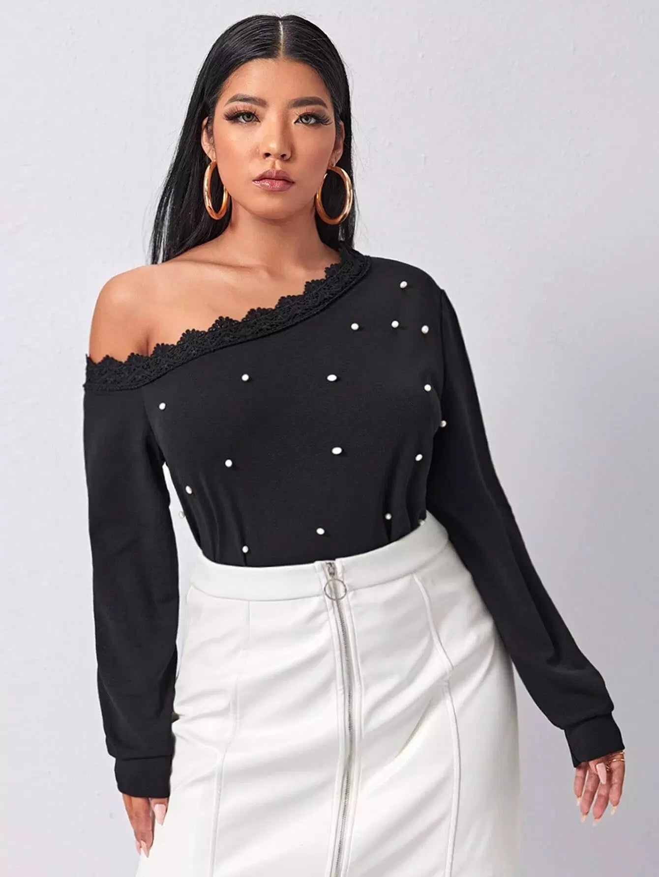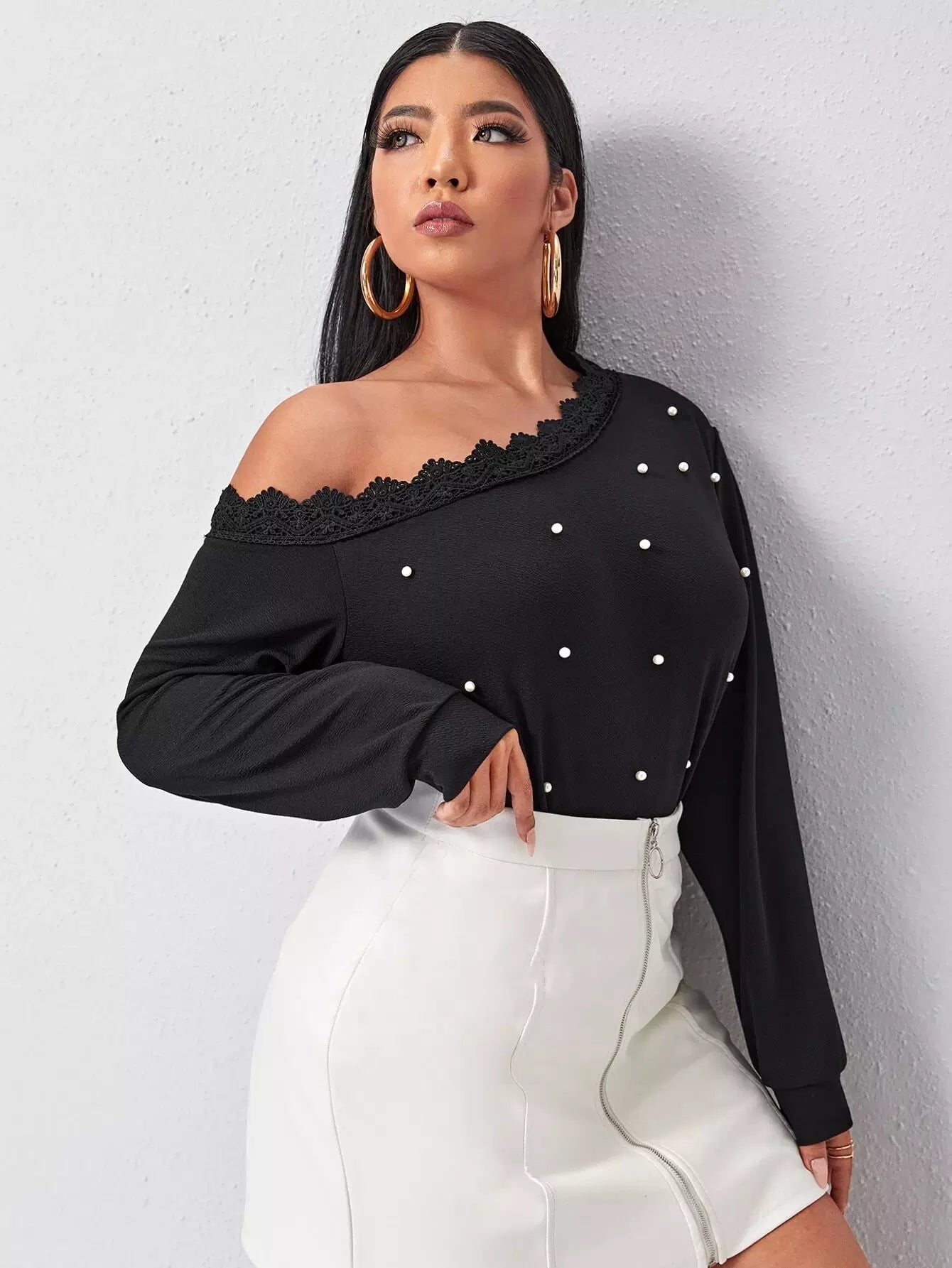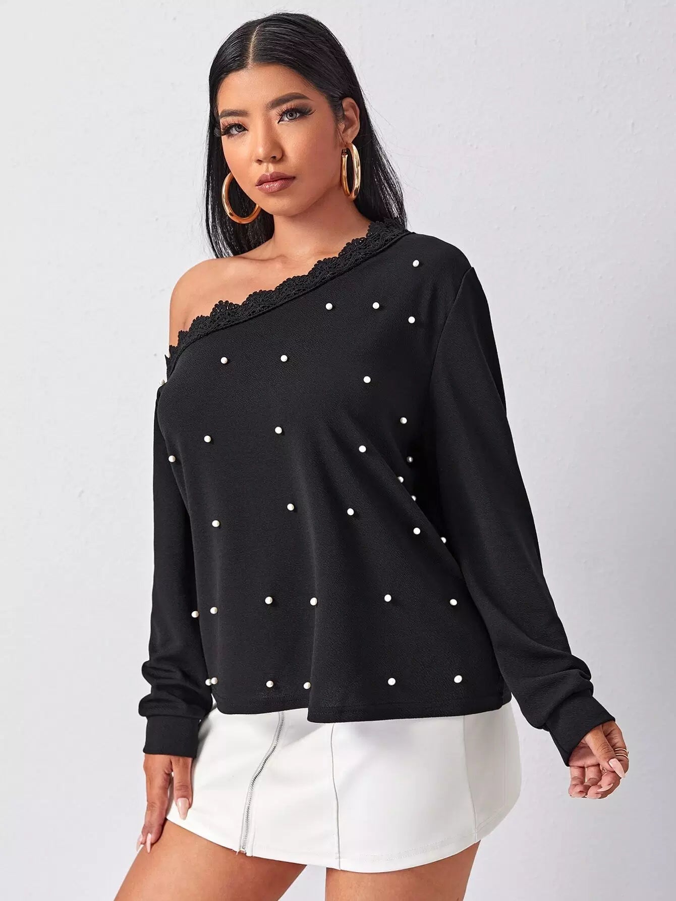 Plus Contrast Lace Pearls Asymmetrical Neck Sweatshirt