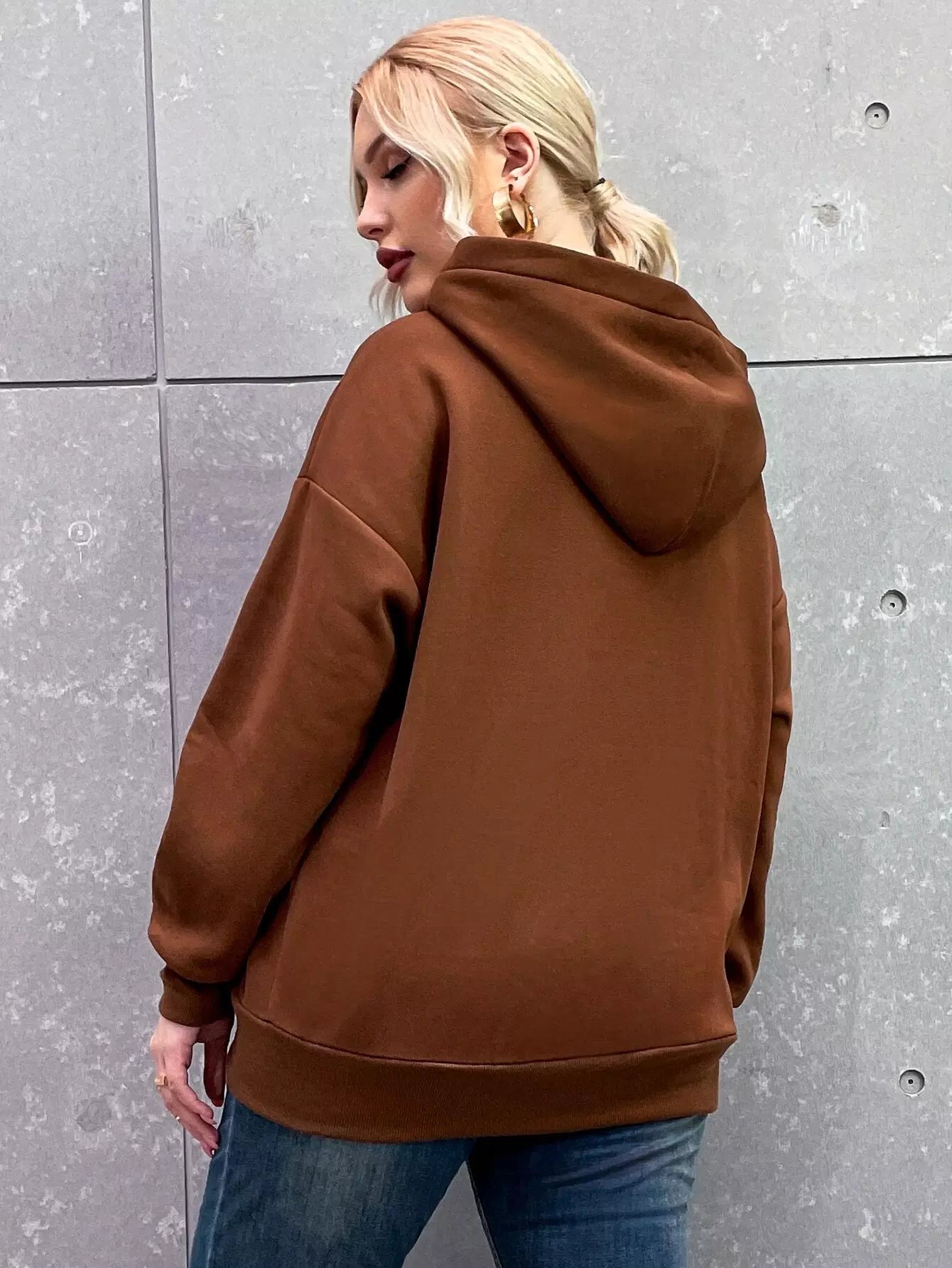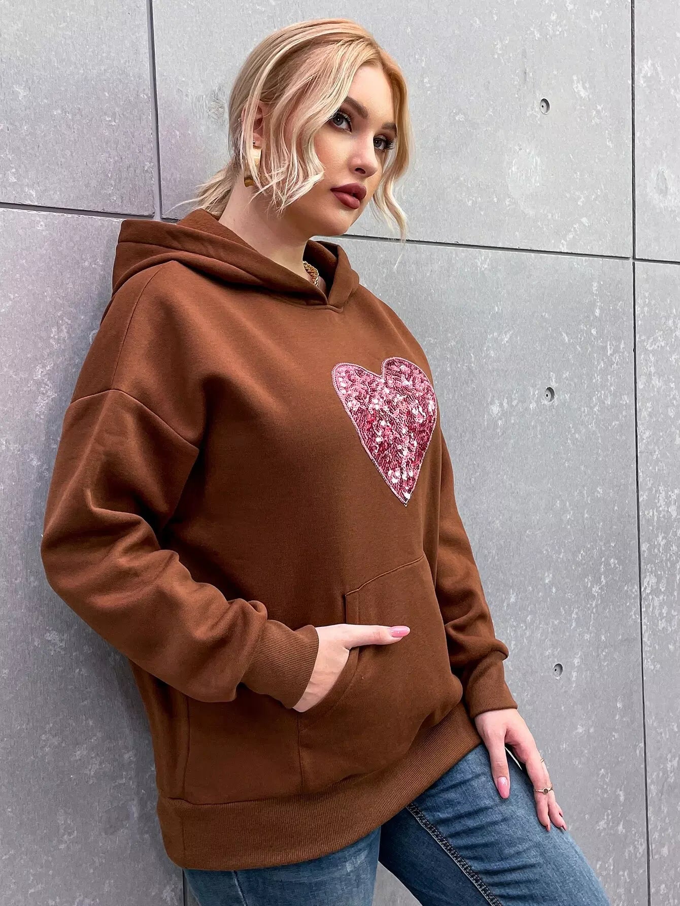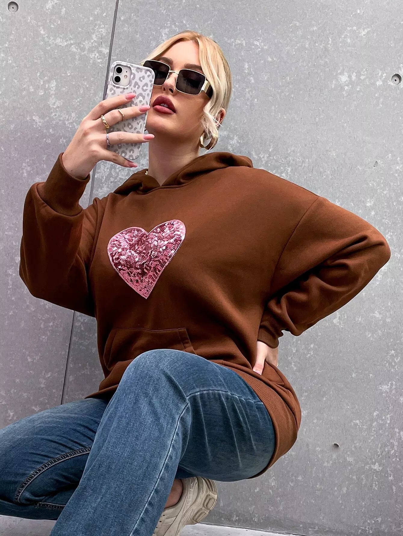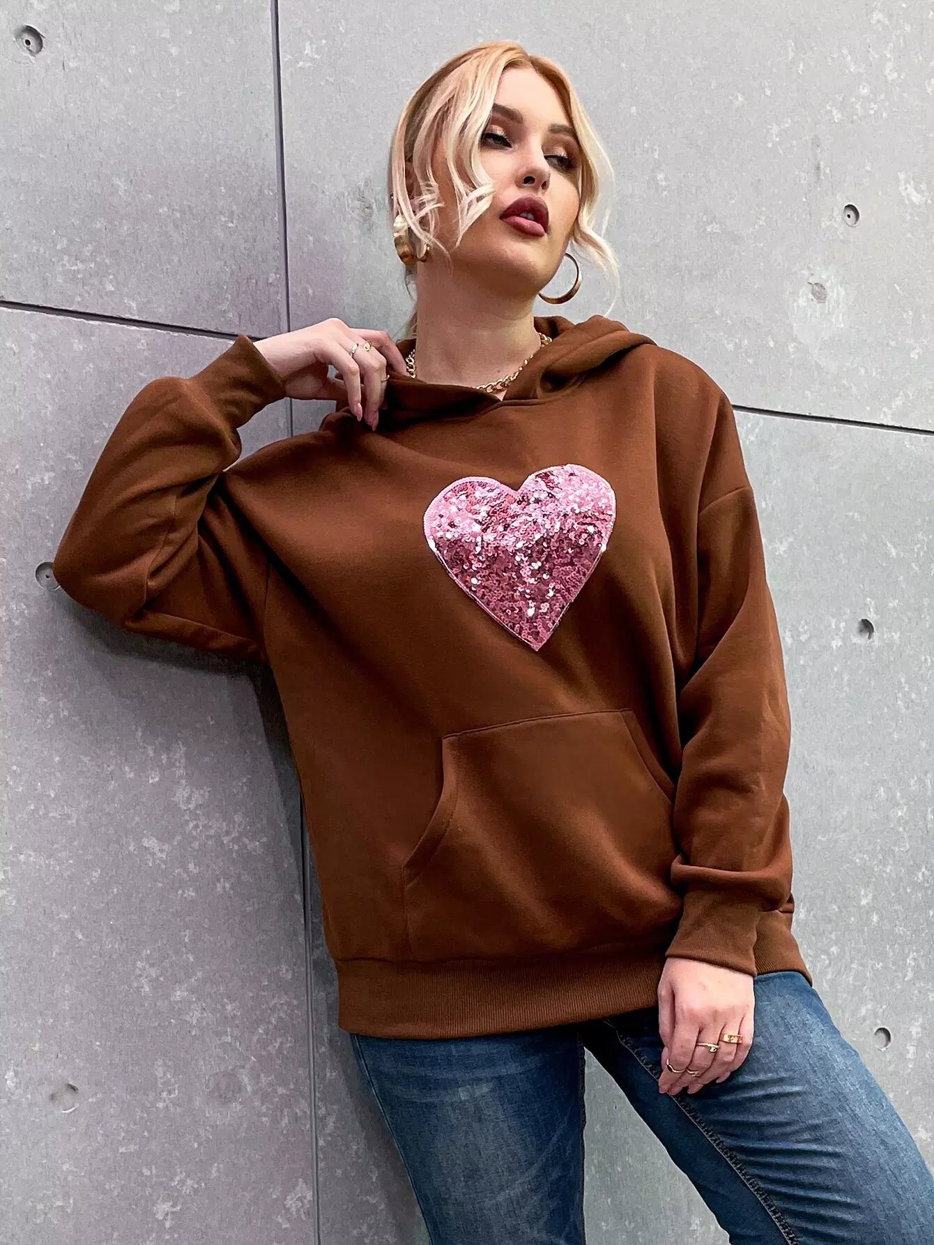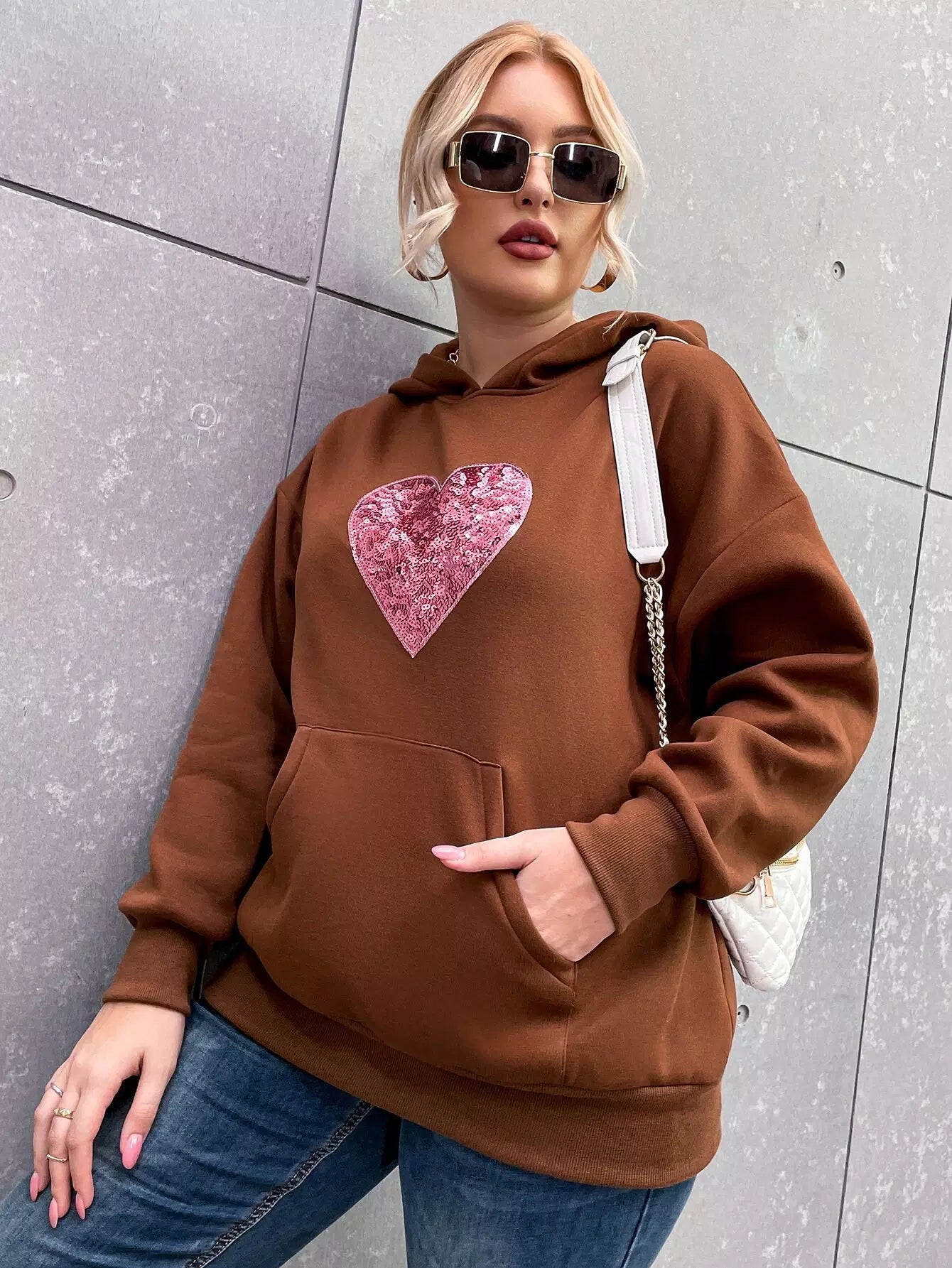 Plus Drop Shoulder Heart Print Kangaroo Pocket Sweatshirt