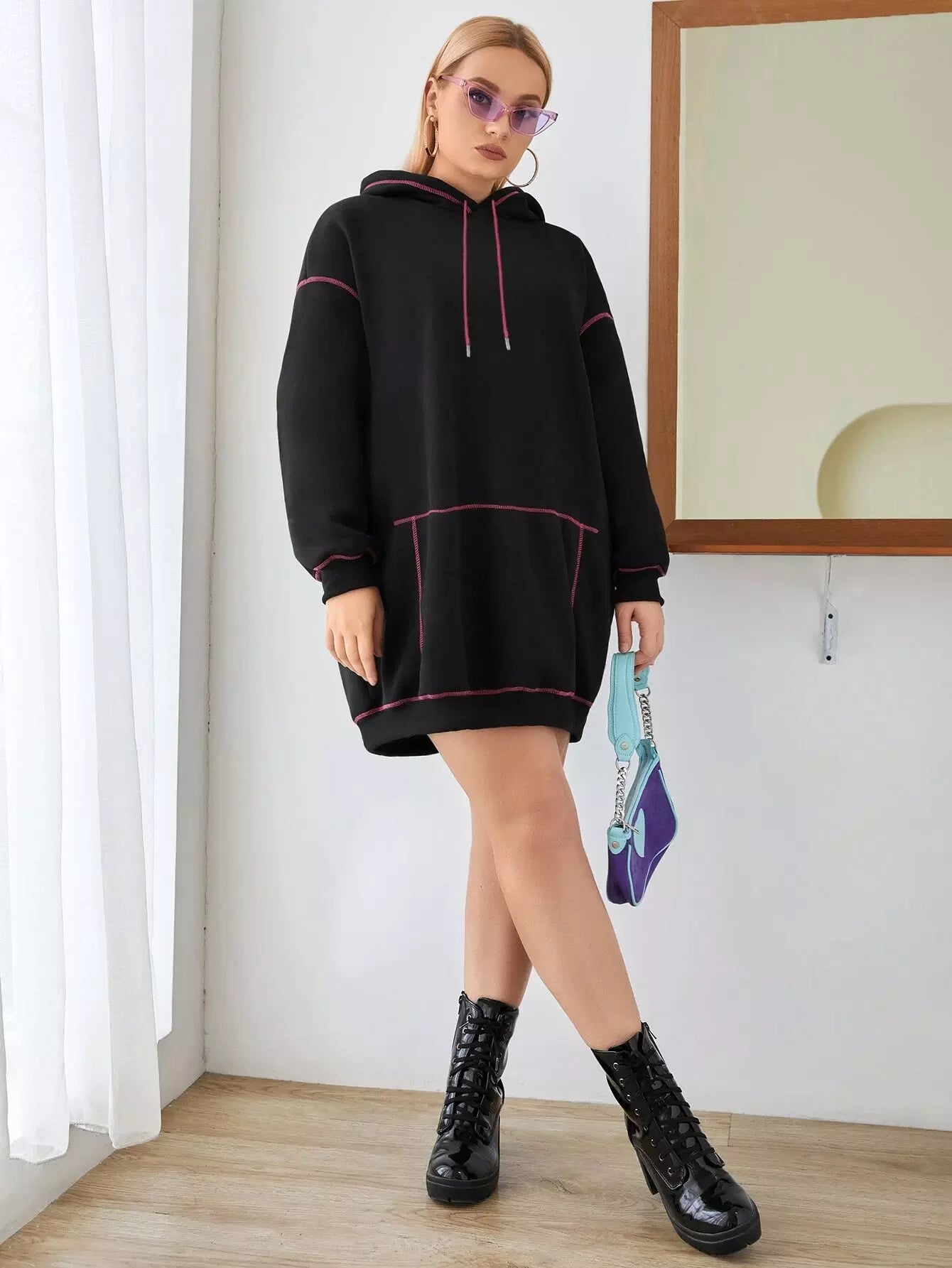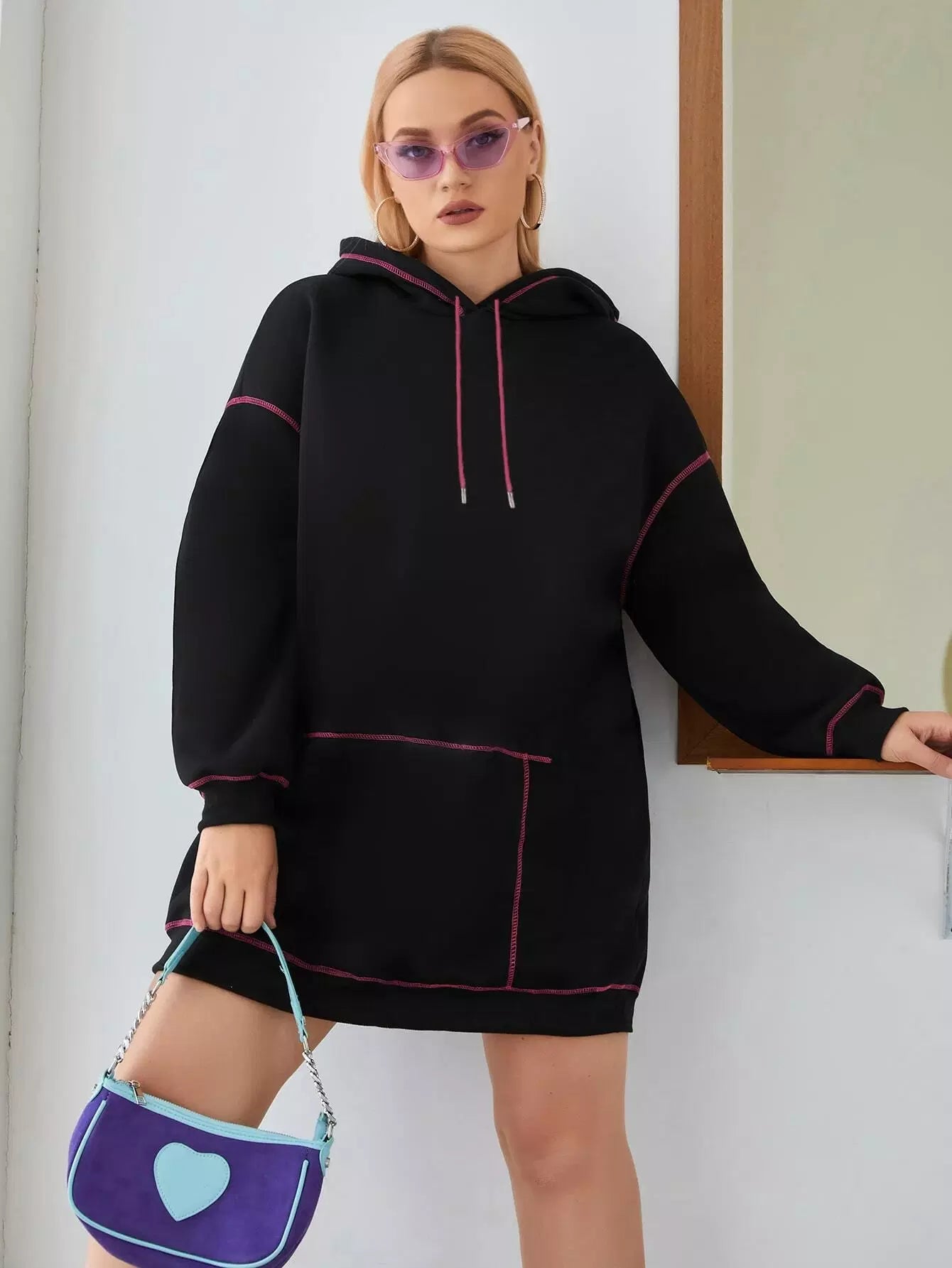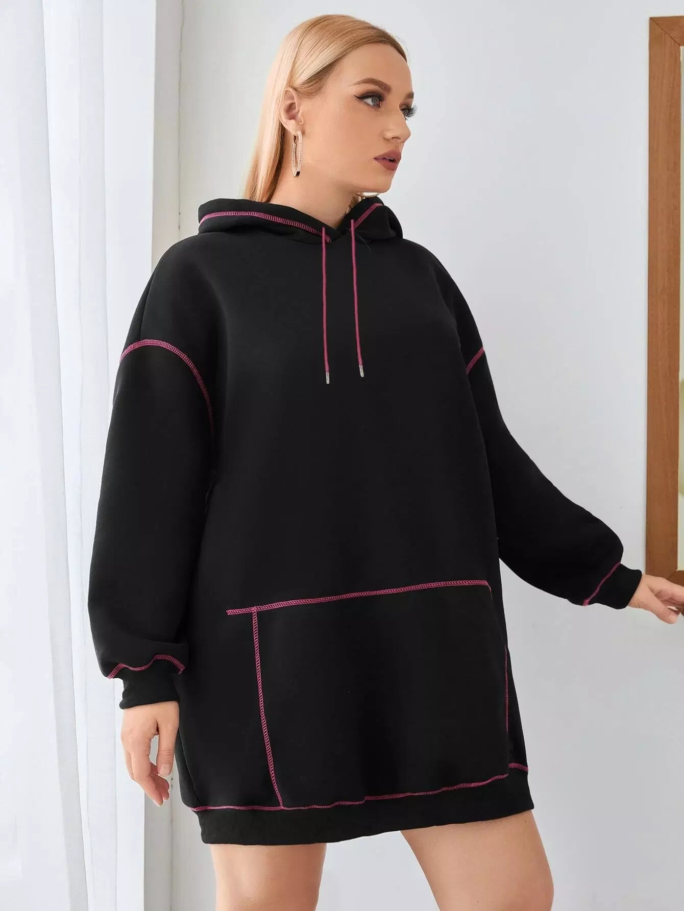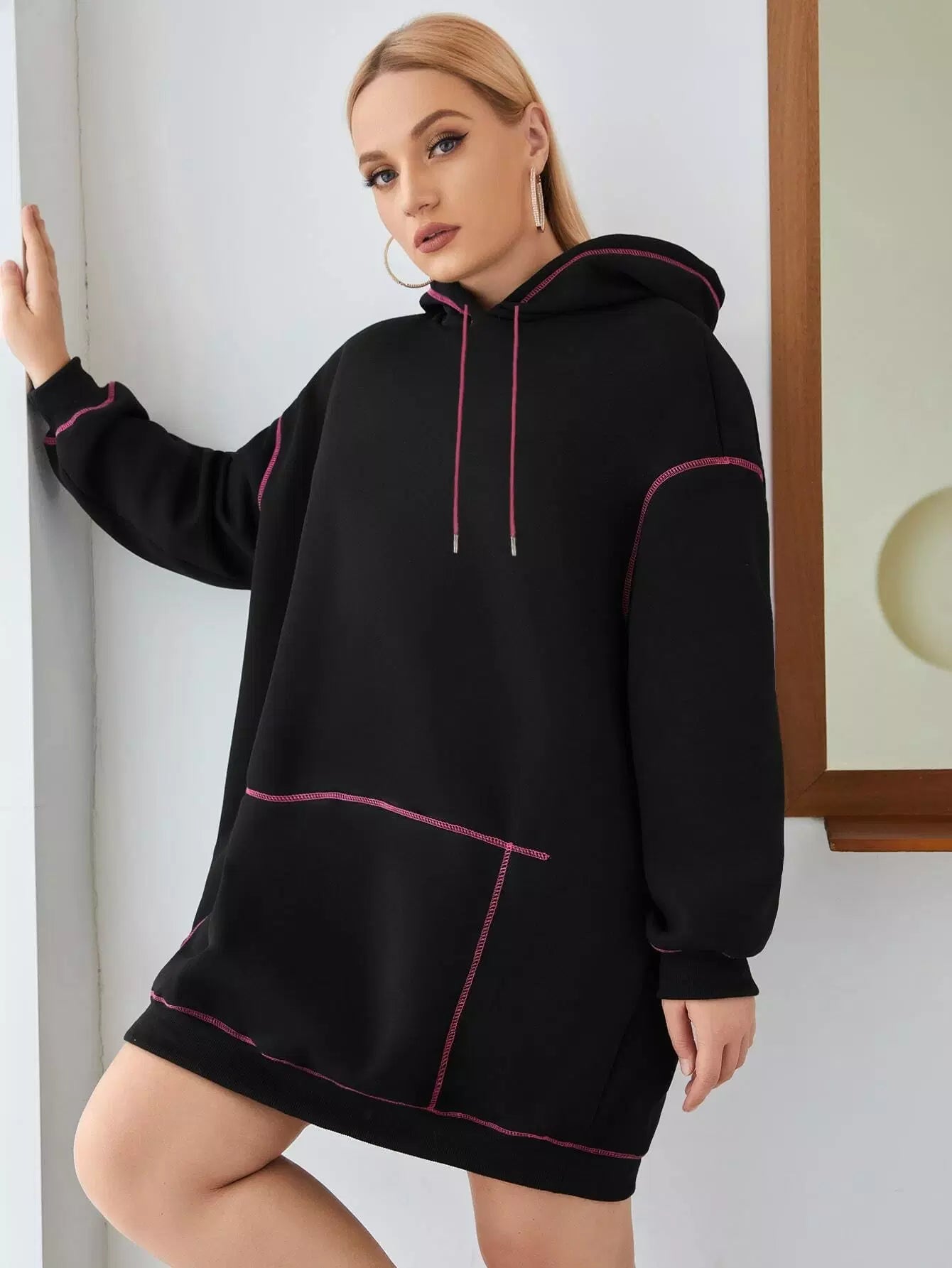 Plus Stitching Trim Drawstring Hoodie