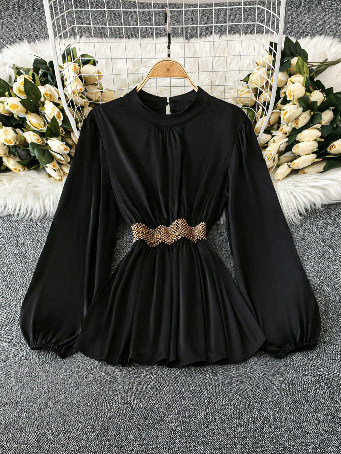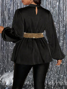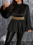 Allurite Plus Size Women Long Sleeve Ruched Peter Pan Collar Patchwork Hem Poplin Shirt Peplum Top Fall