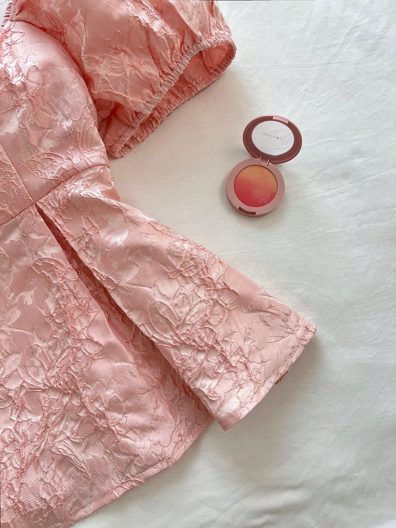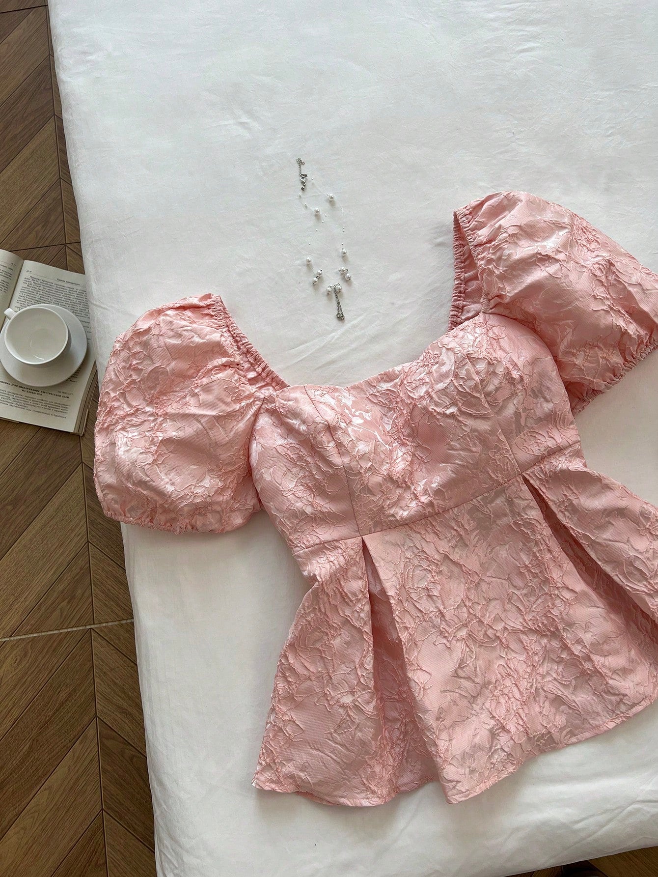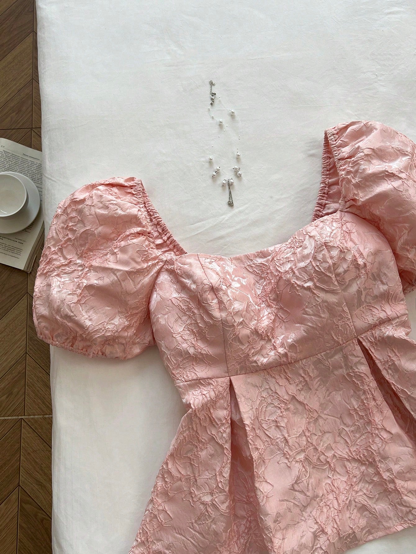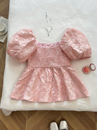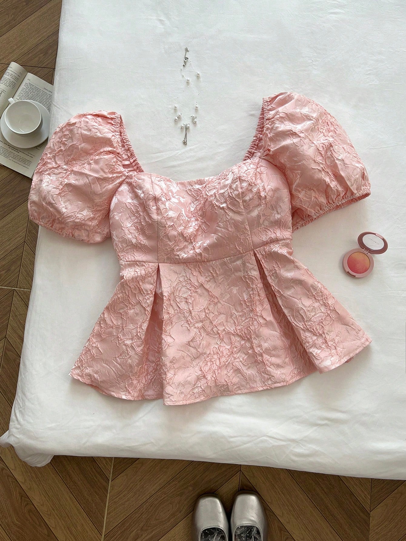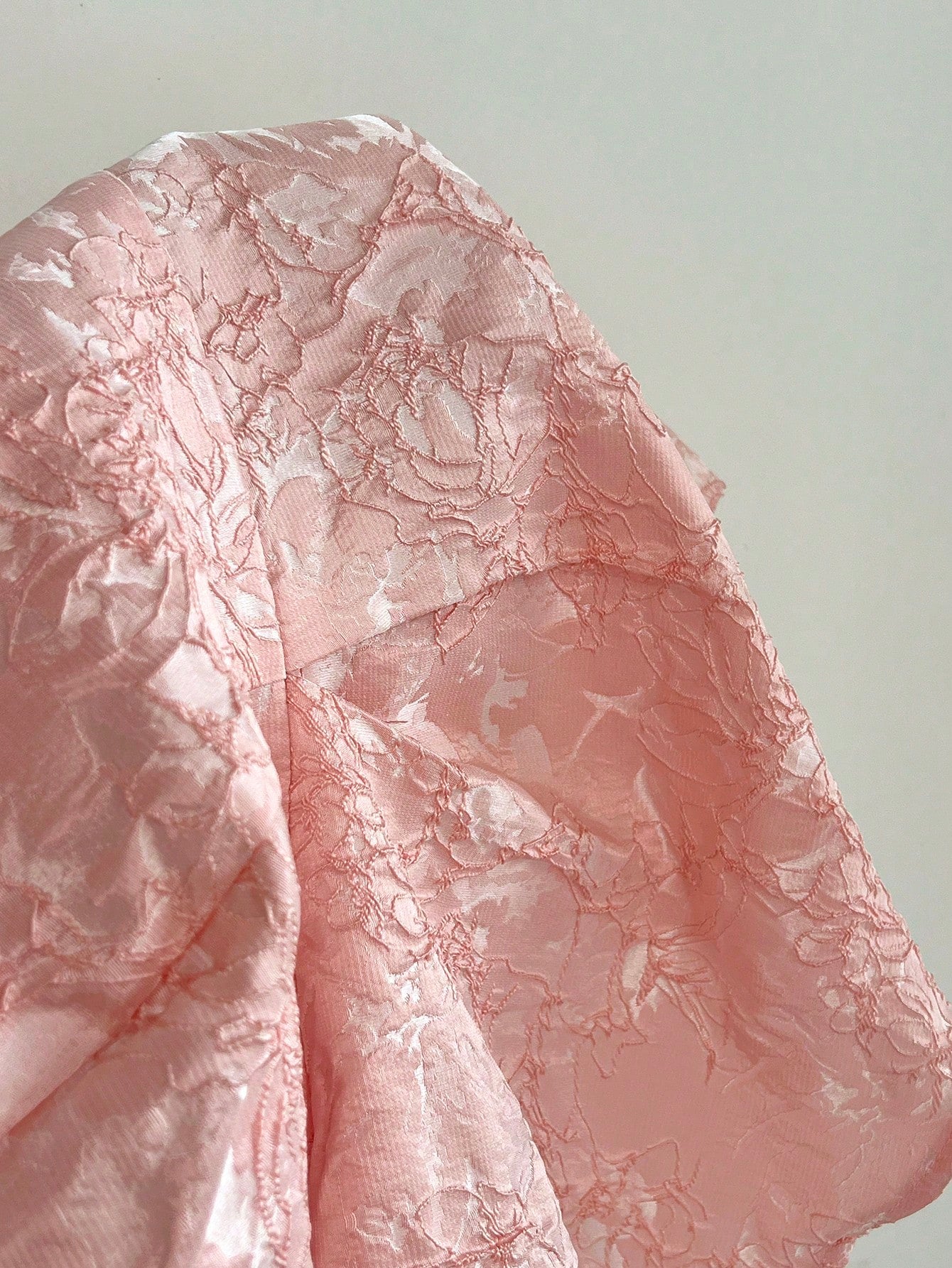Flirla Plus Size Women Puff Sleeve Casual Jacquard Fabric Shirt, Pink, Vacation Style