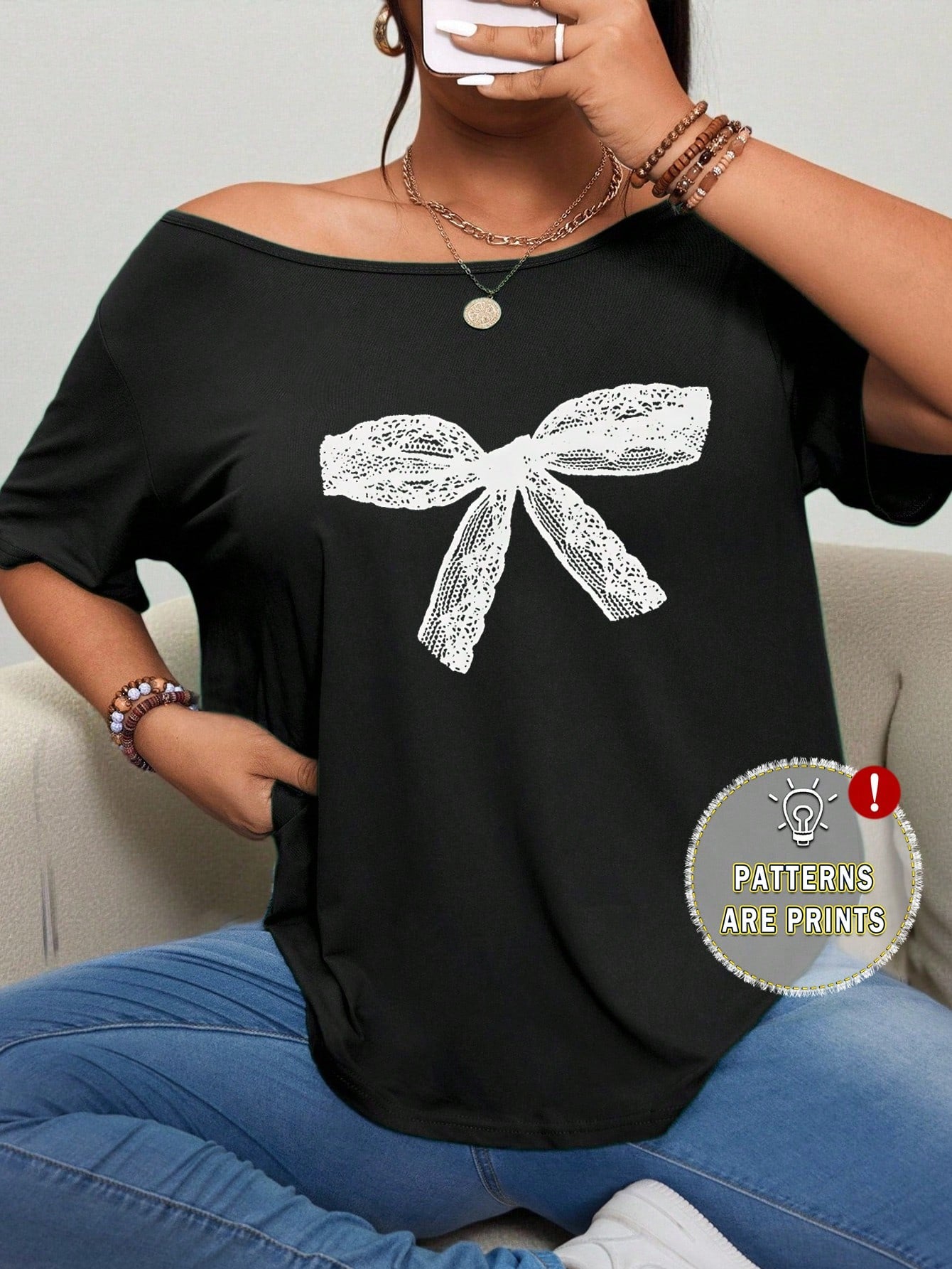 Flirla Plus Size Women's Casual Asymmetrical Neck T-Shirt With Bowknot & Lace Design Graphic Tees Women Tops