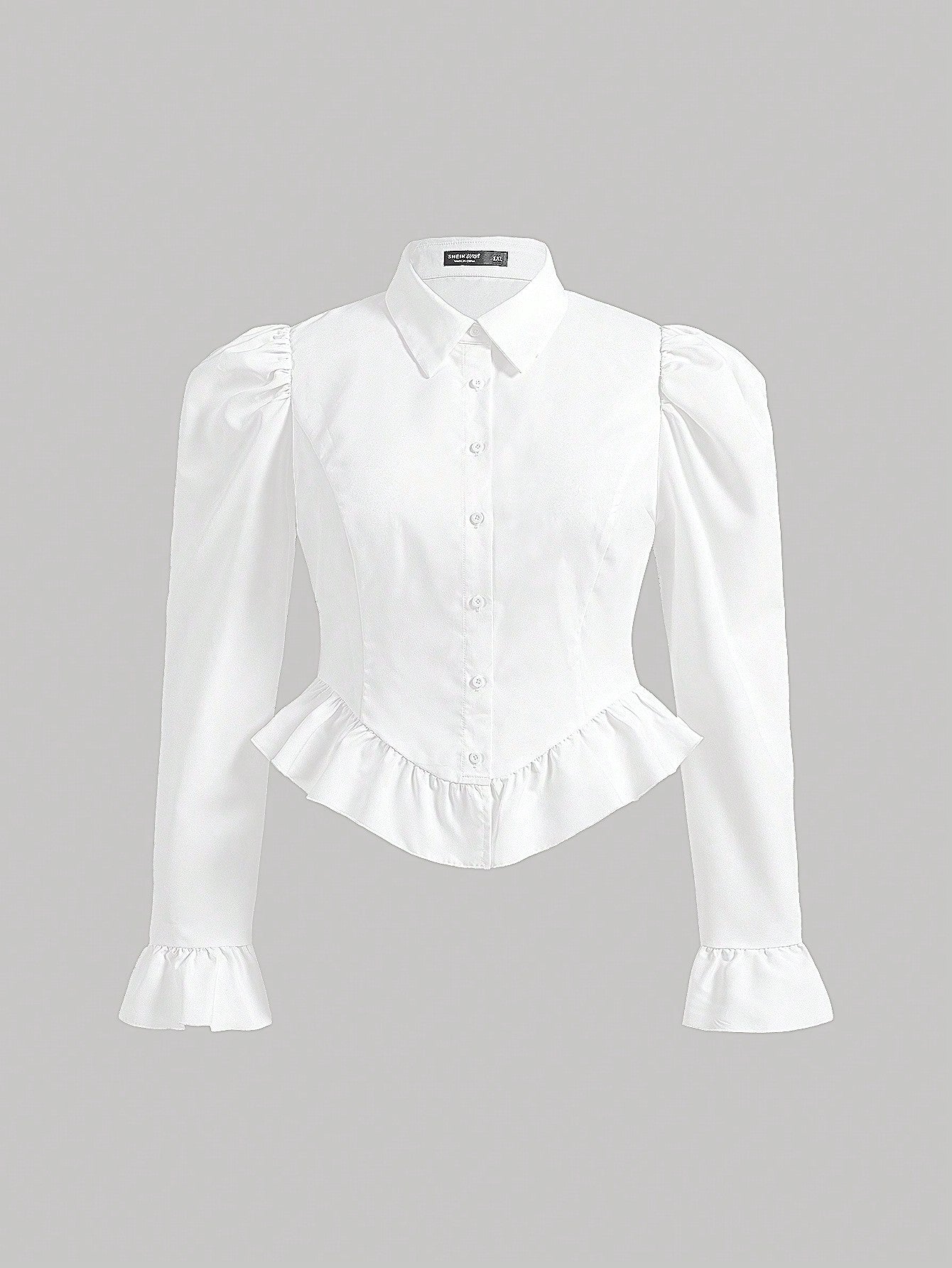 MOD White V-Neck Ruffled Hemline Puff Sleeve Shirt With Button Front And Ruffle Sleeves, Plus Size Women's