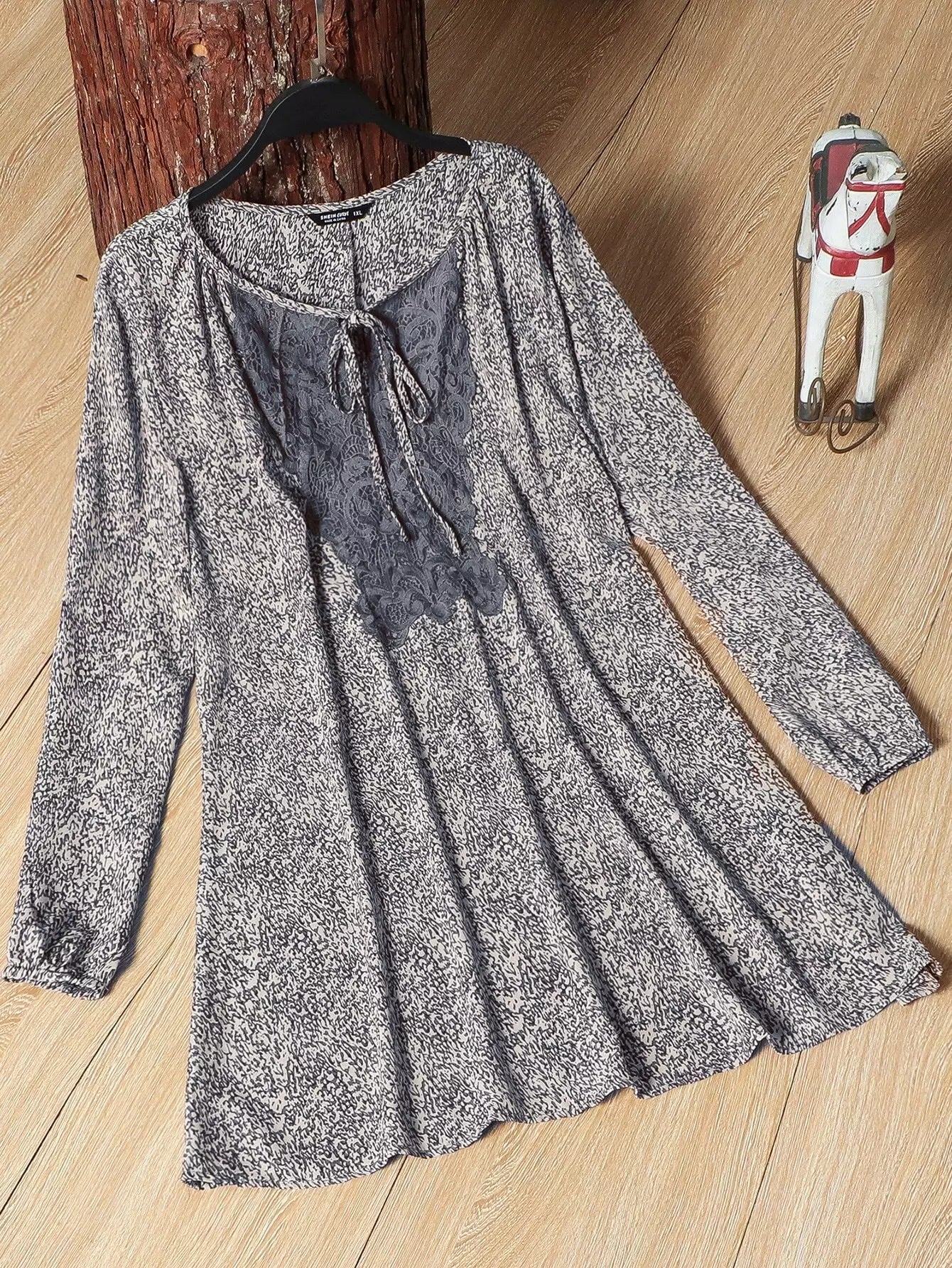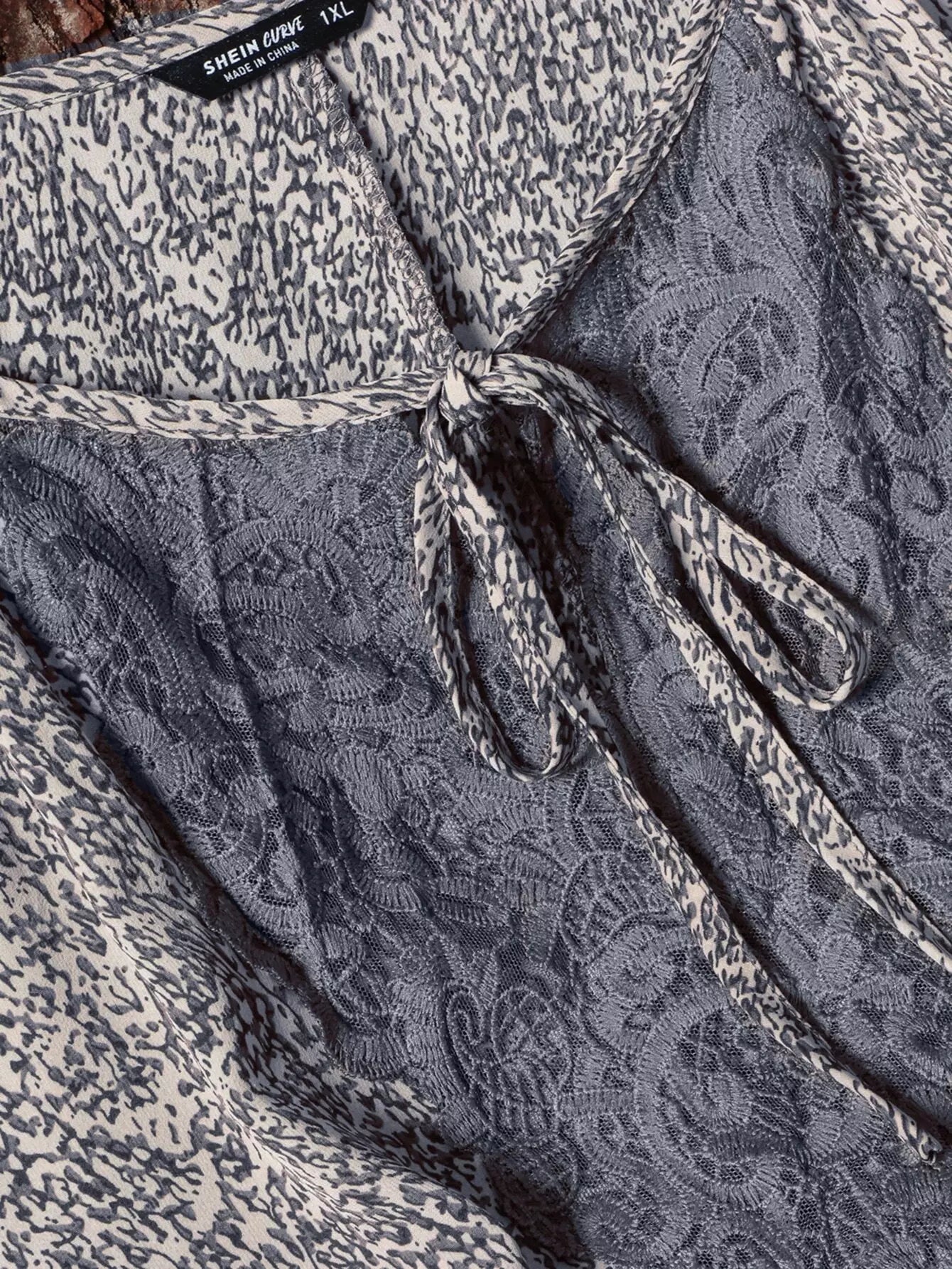Plus All Over Print Tie Neck Contrast Lace Blouse