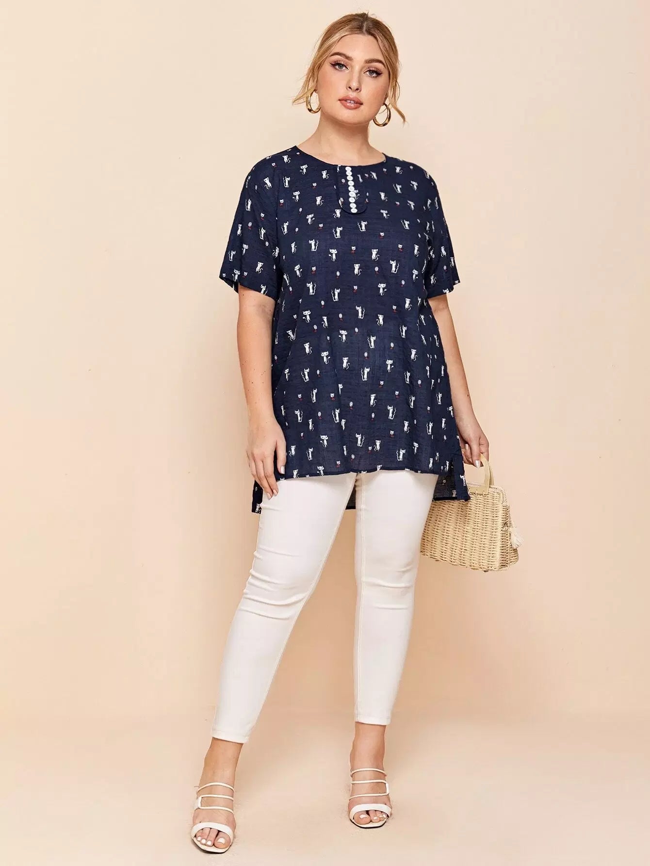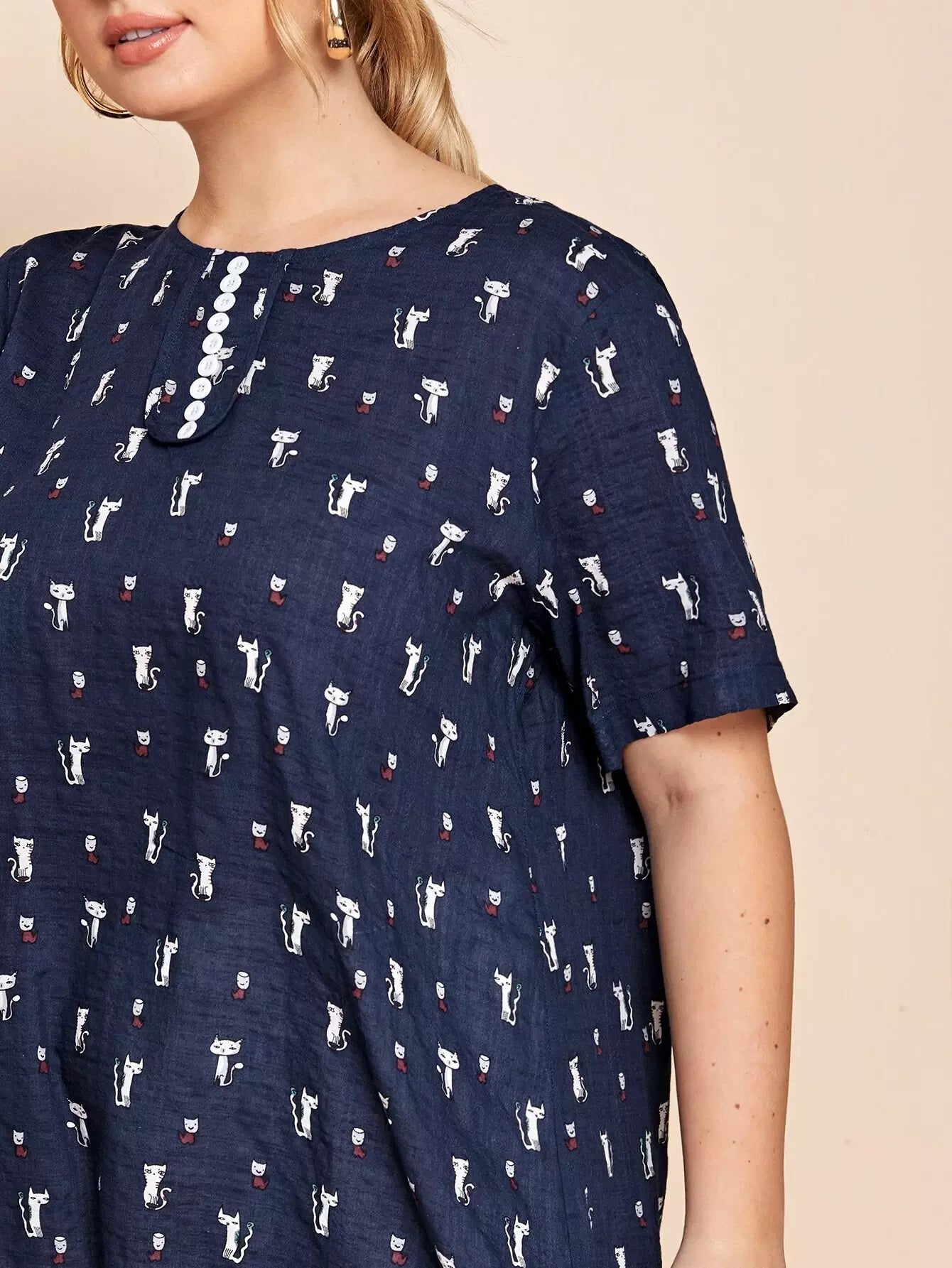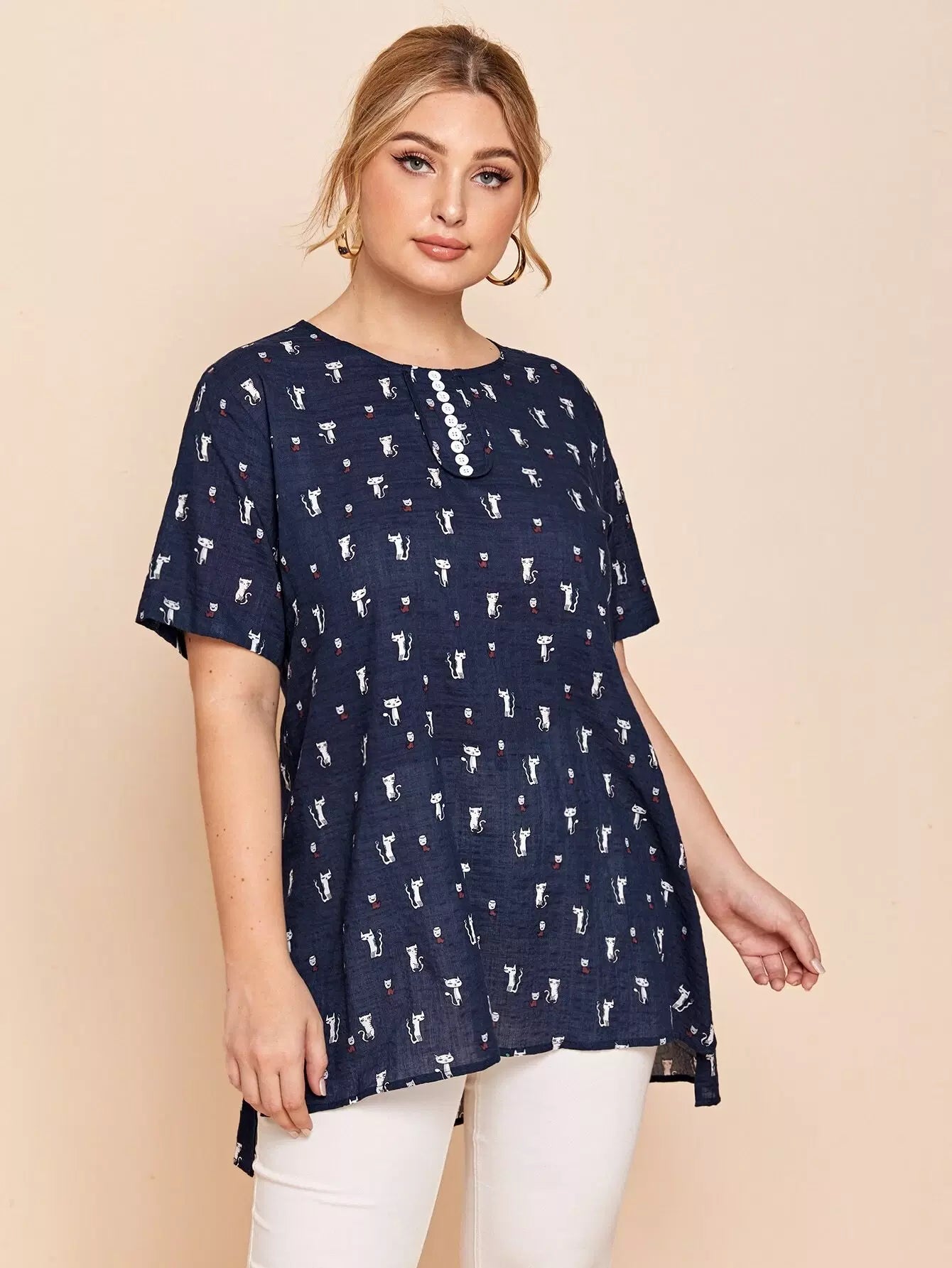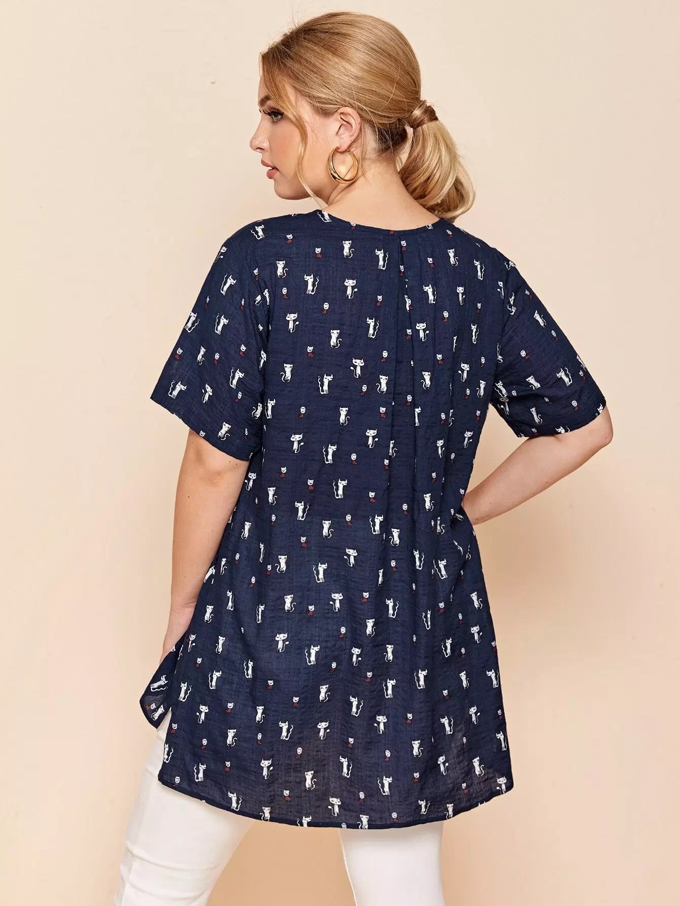 Plus Allover Cartoon Graphic Button Tunic Blouse
