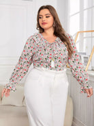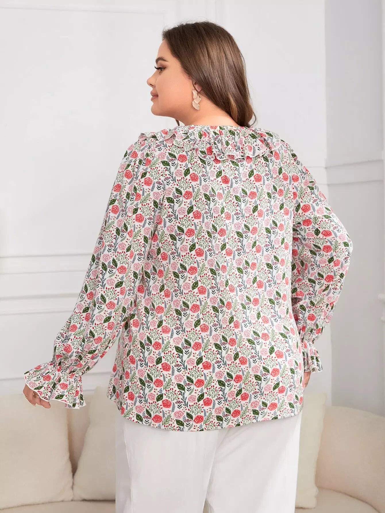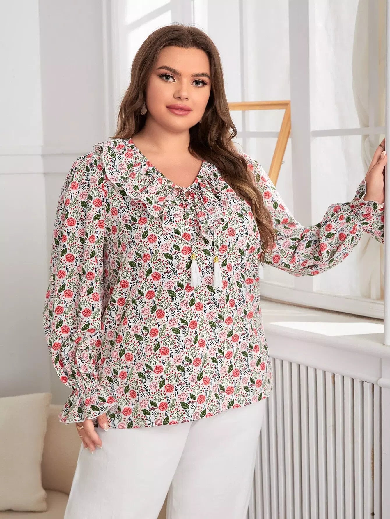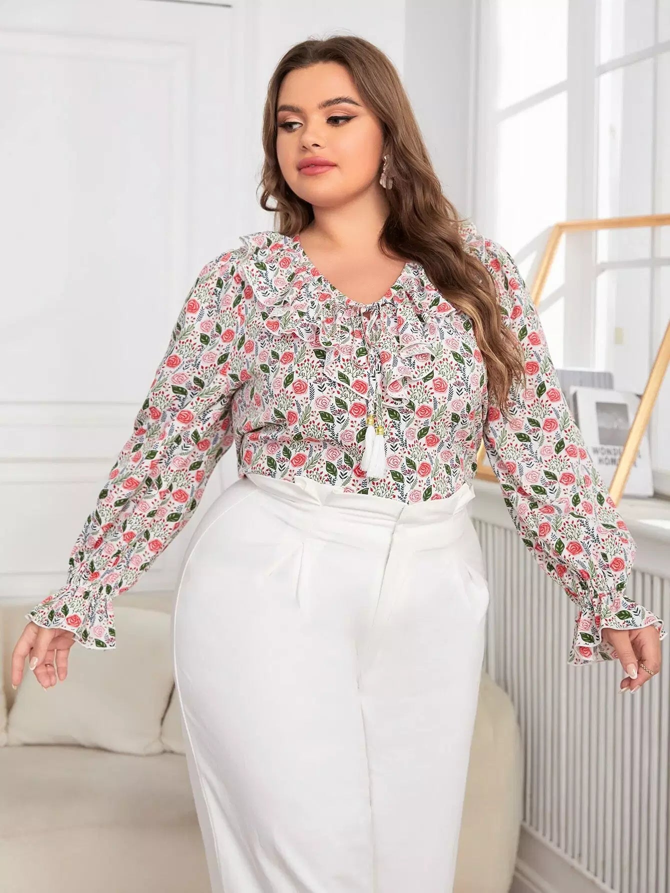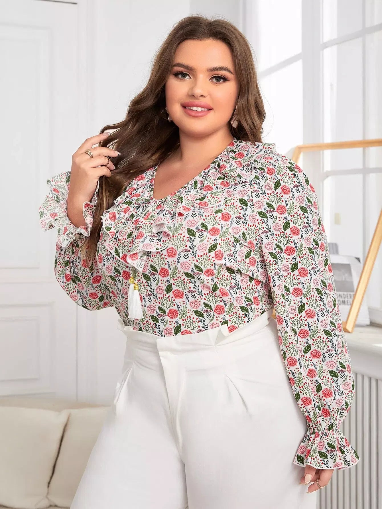 Plus Allover Floral Print Tassel Tie Ruffle Trim Flounce Sleeve Blouse