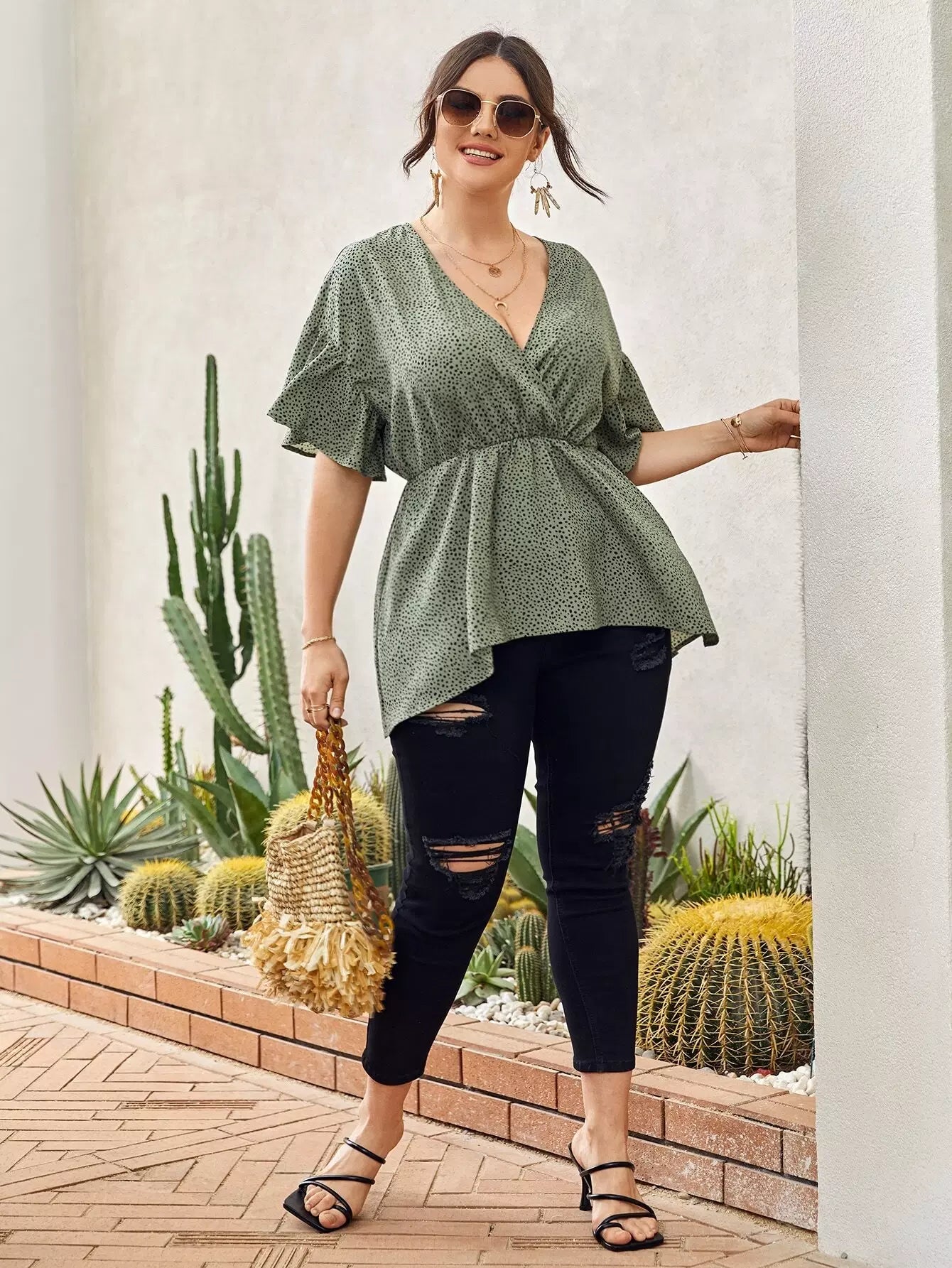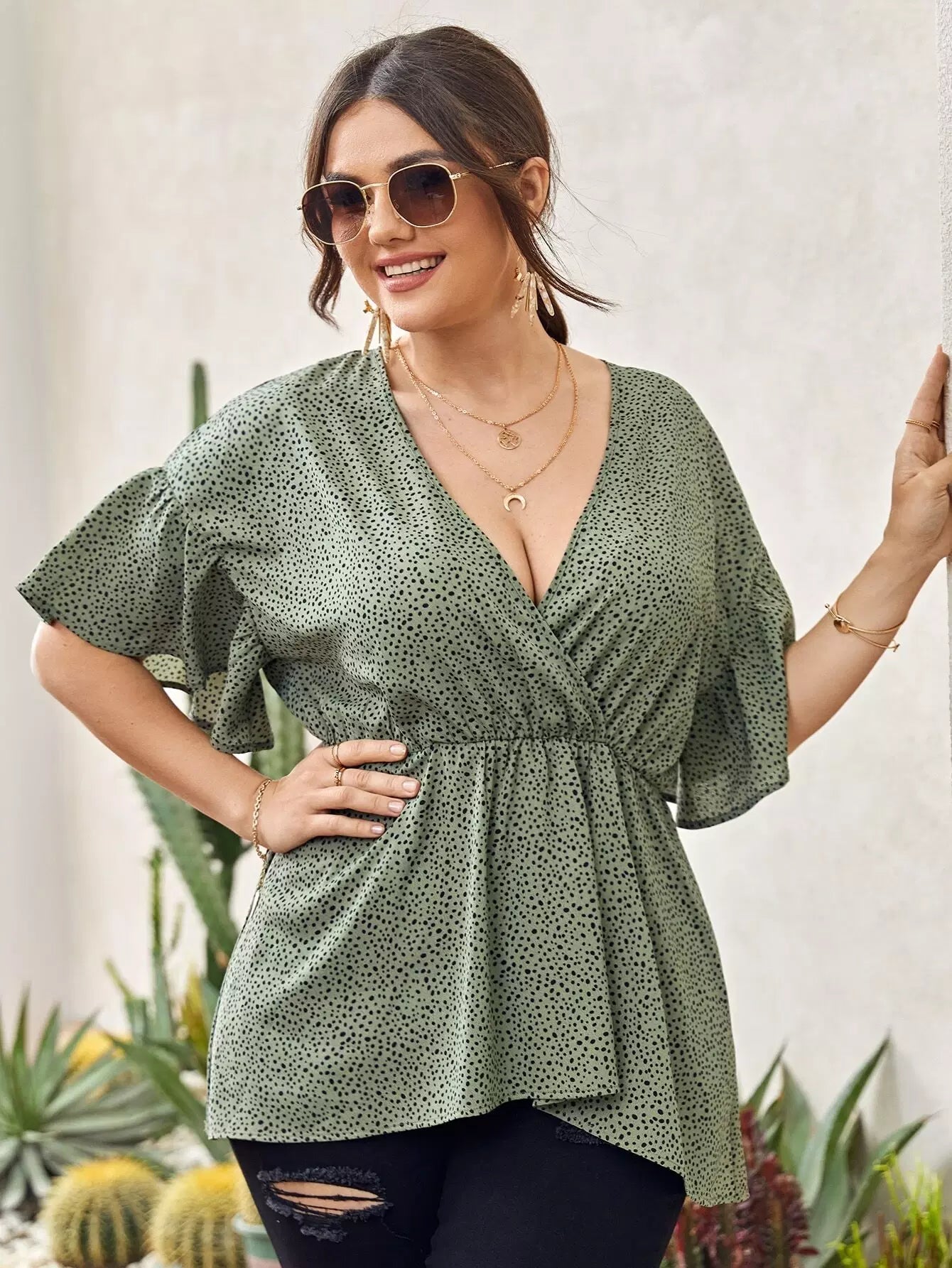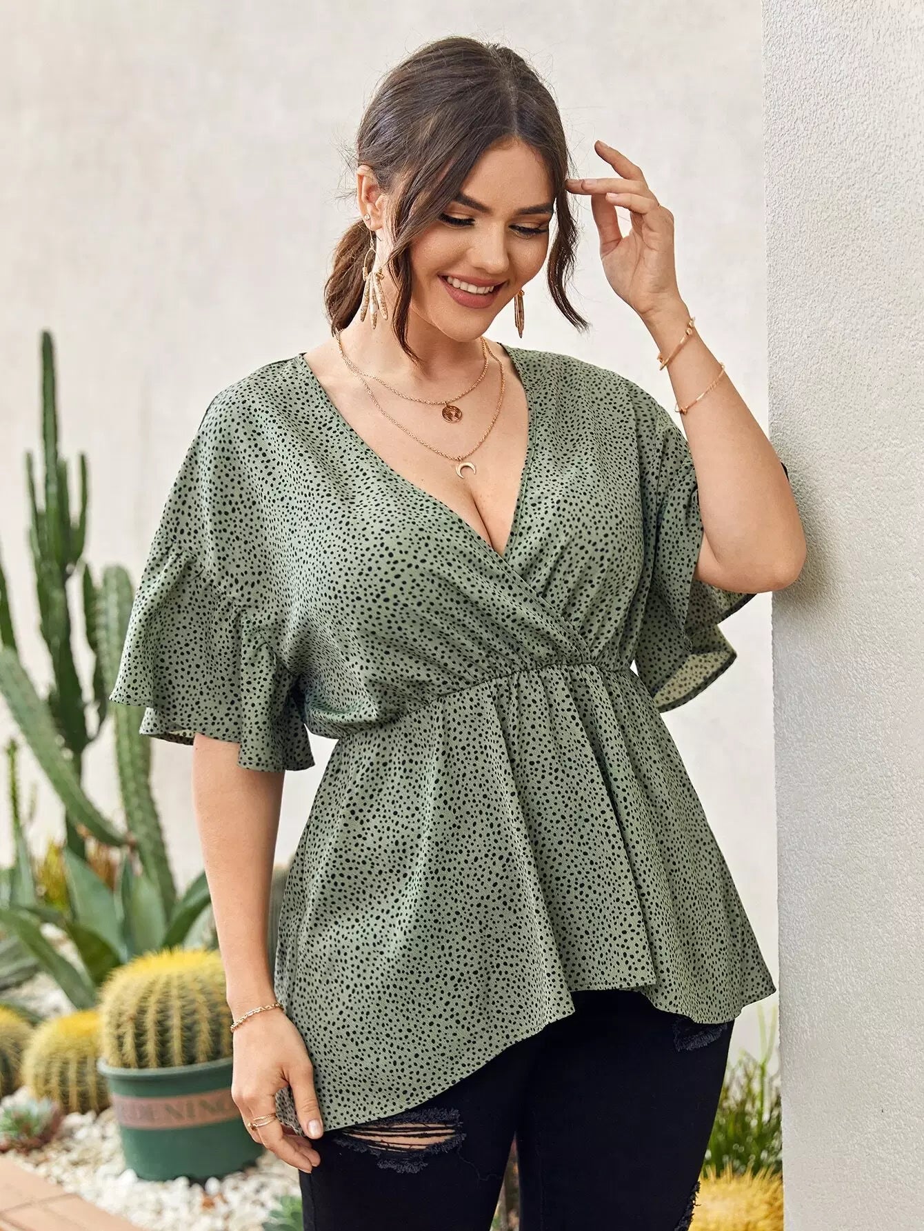 Plus Allover Print Surplice Front Peplum Blouse