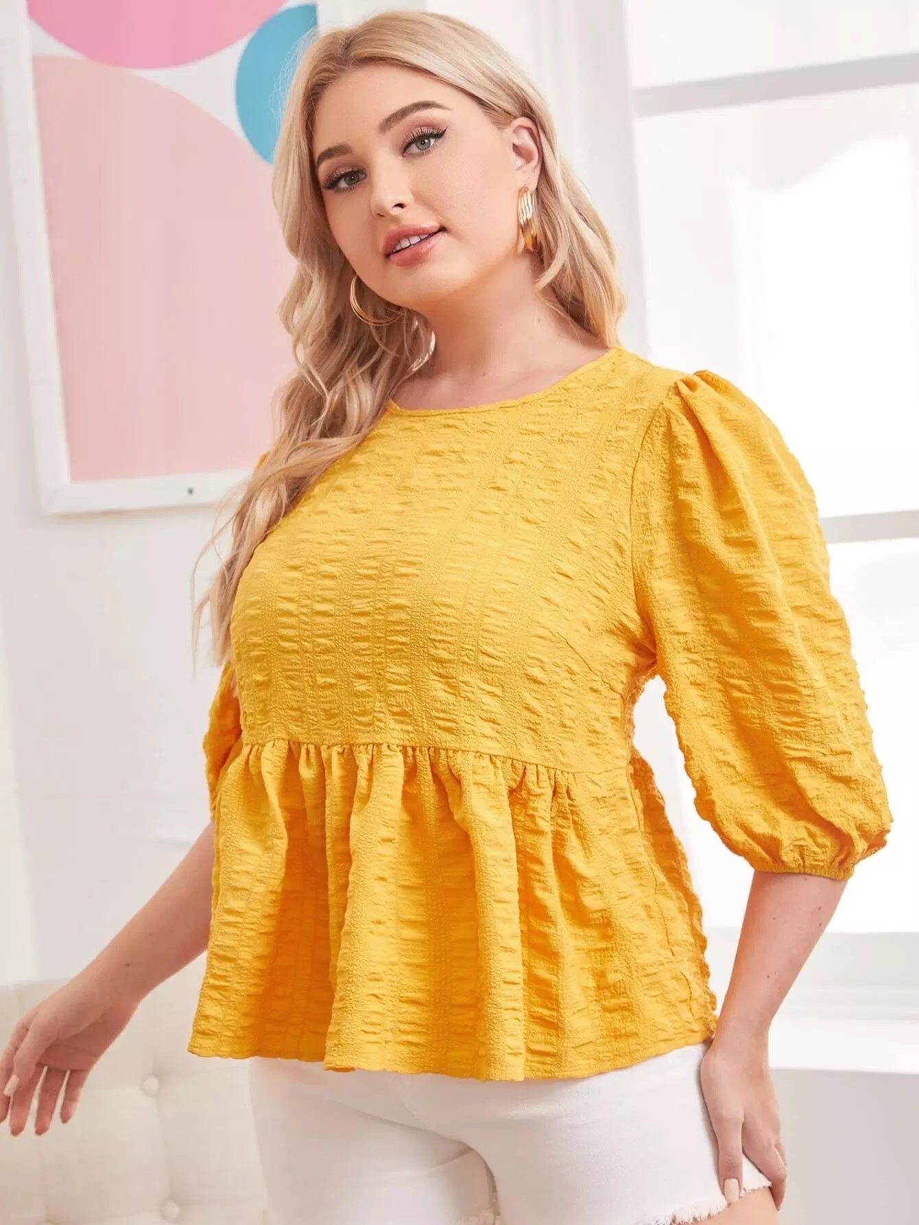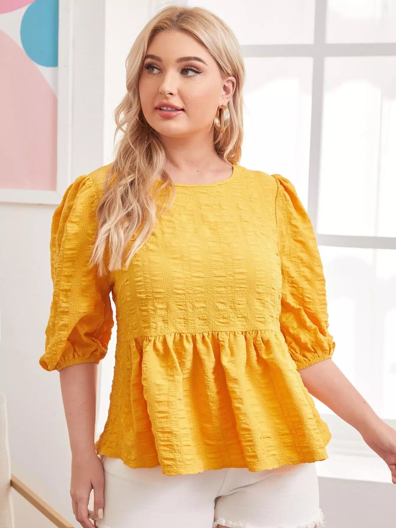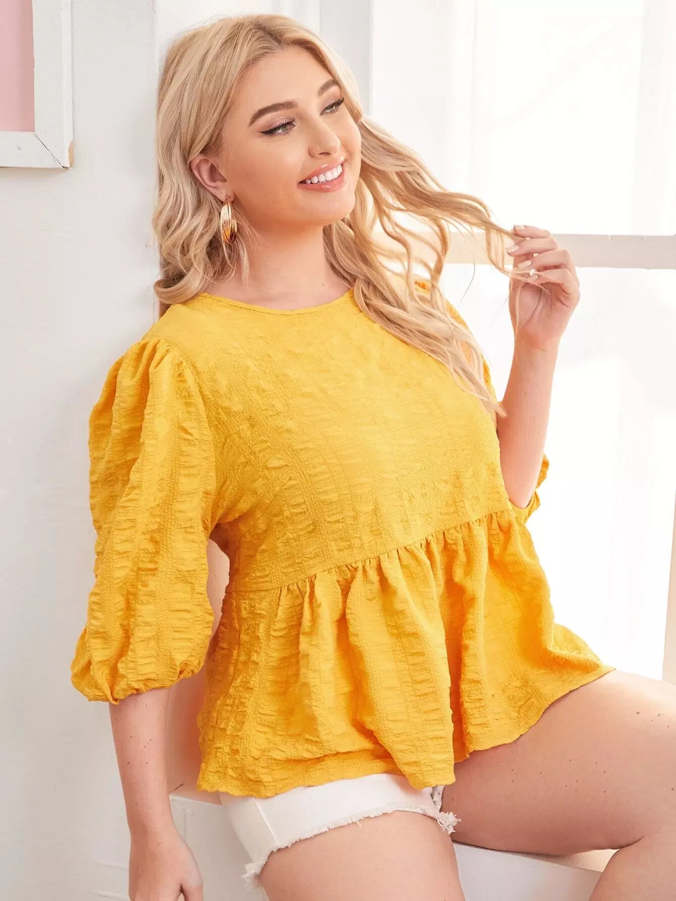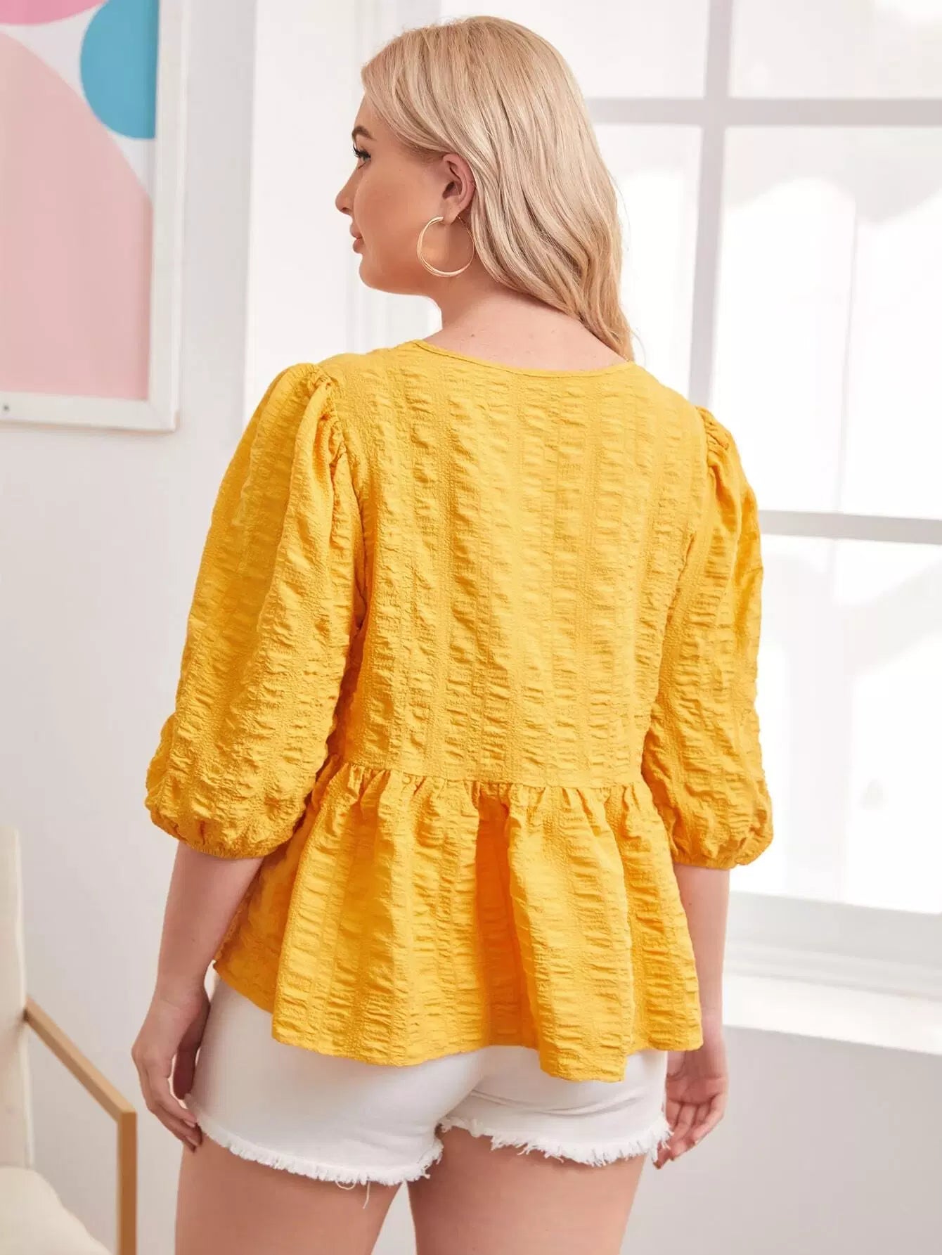 Plus Appliques Puff Sleeve Ruffle Hem Top