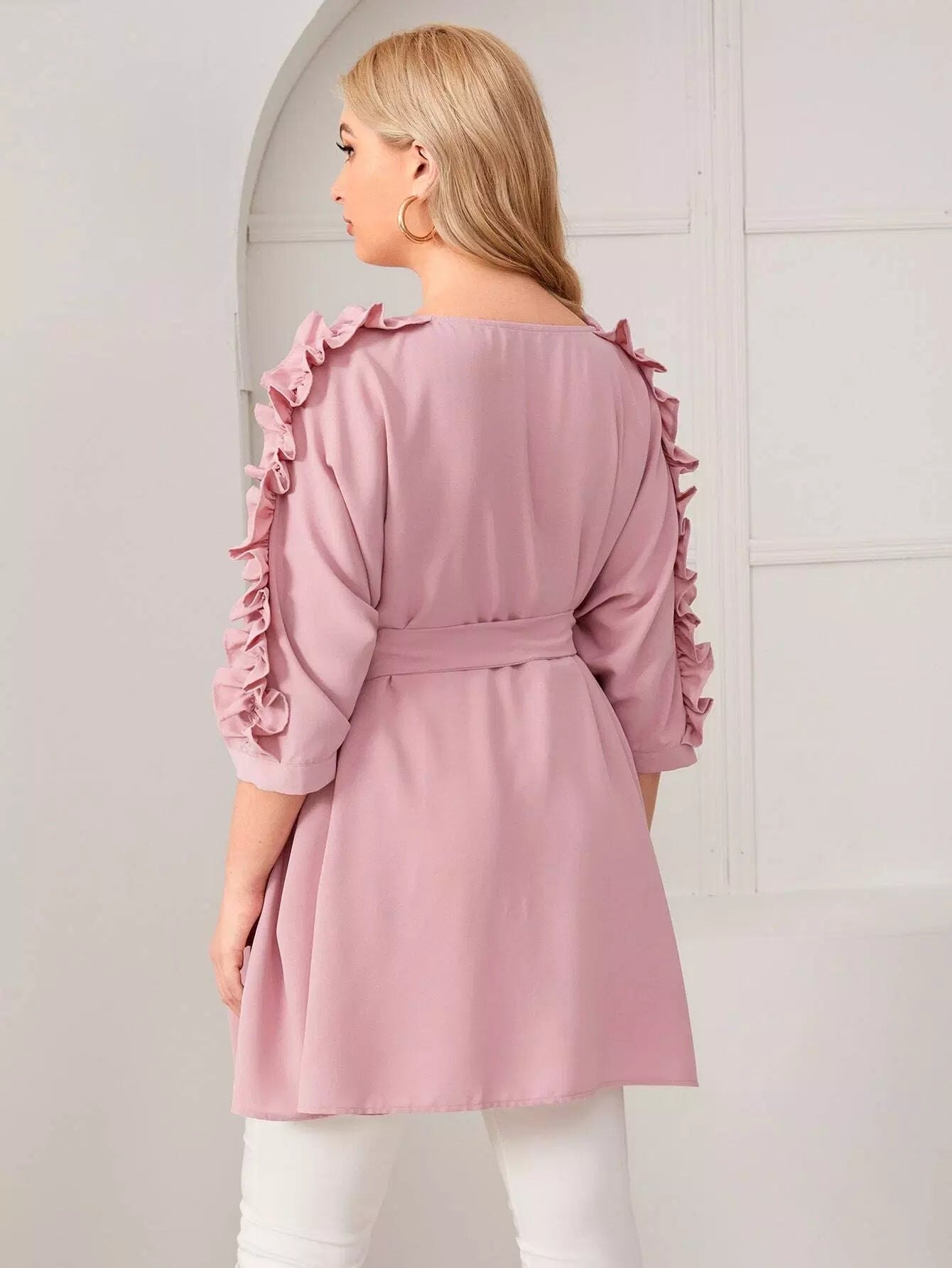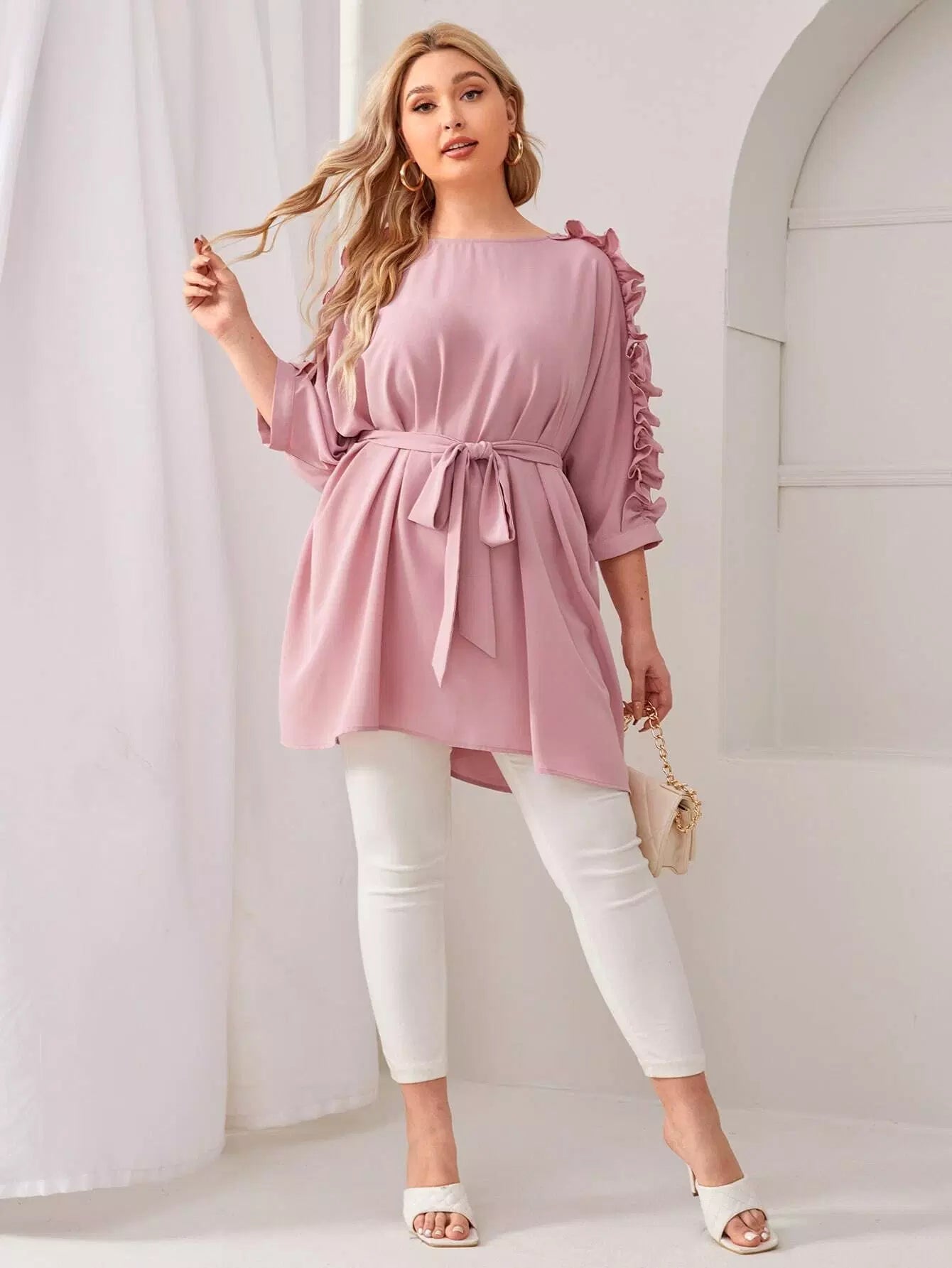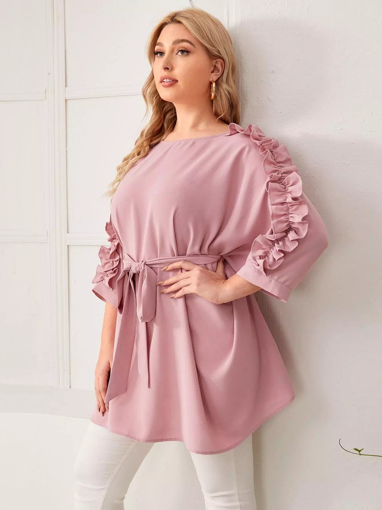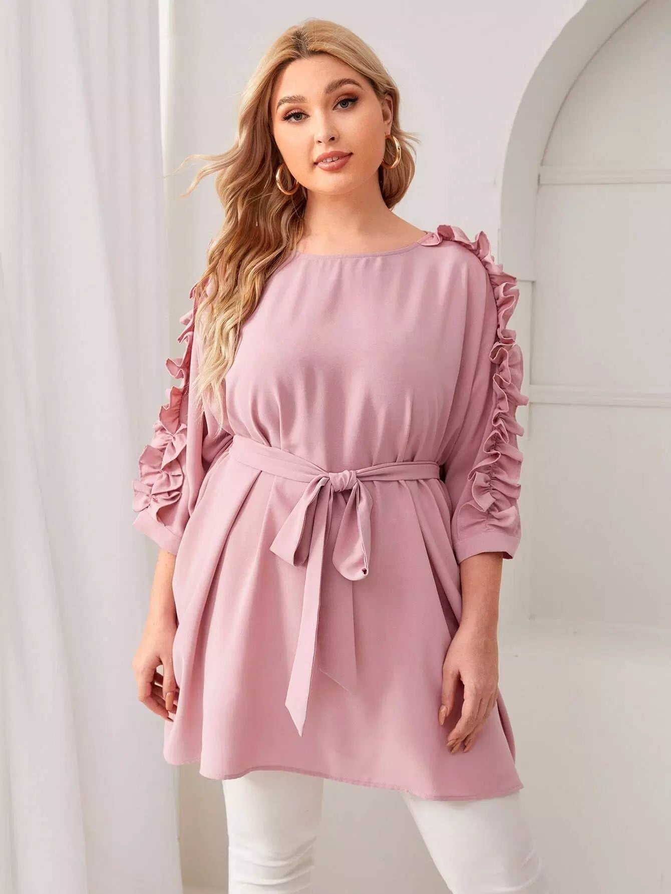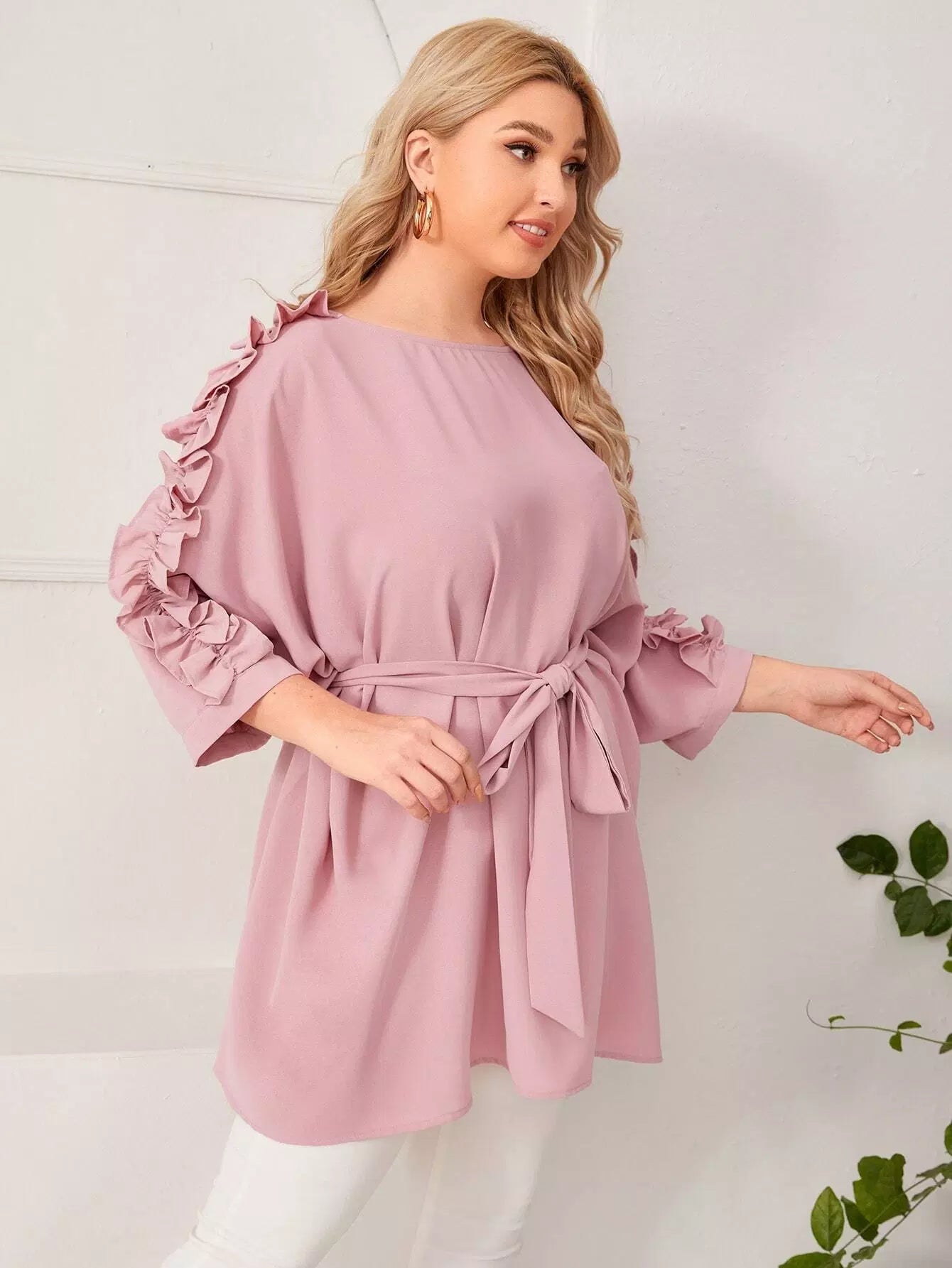 Plus Batwing Sleeve Ruffle Detail Top Without Belt