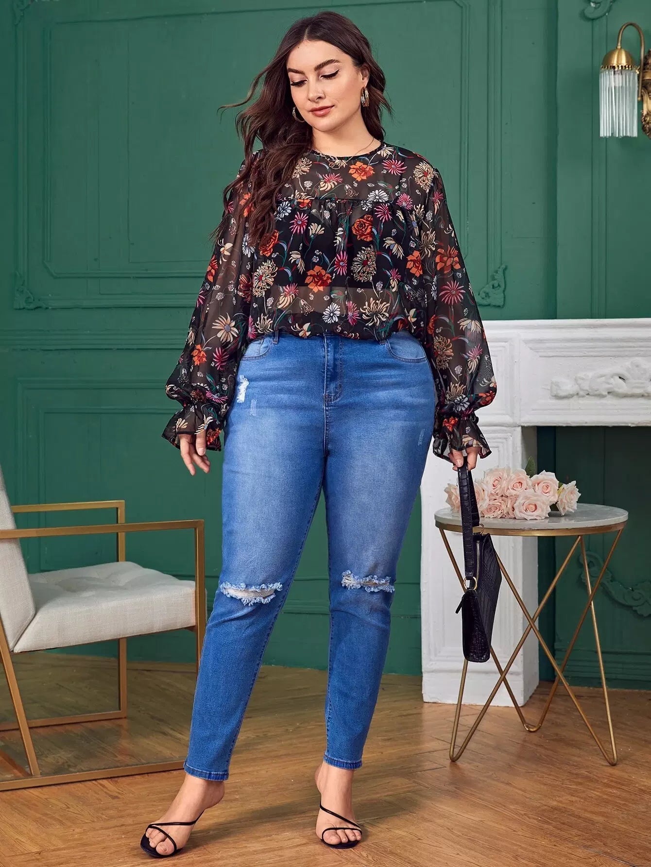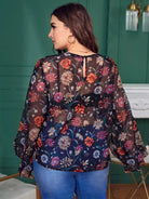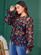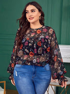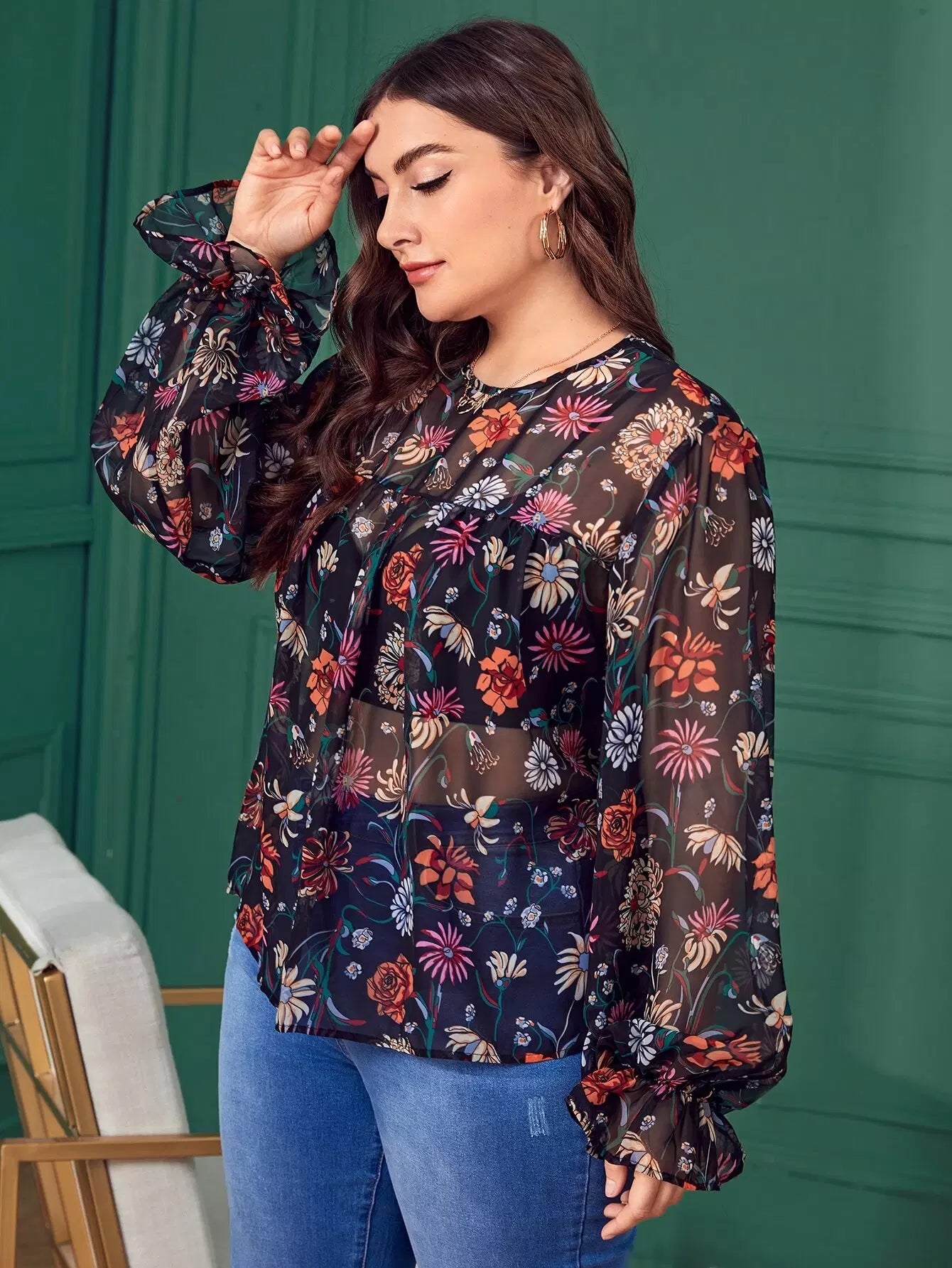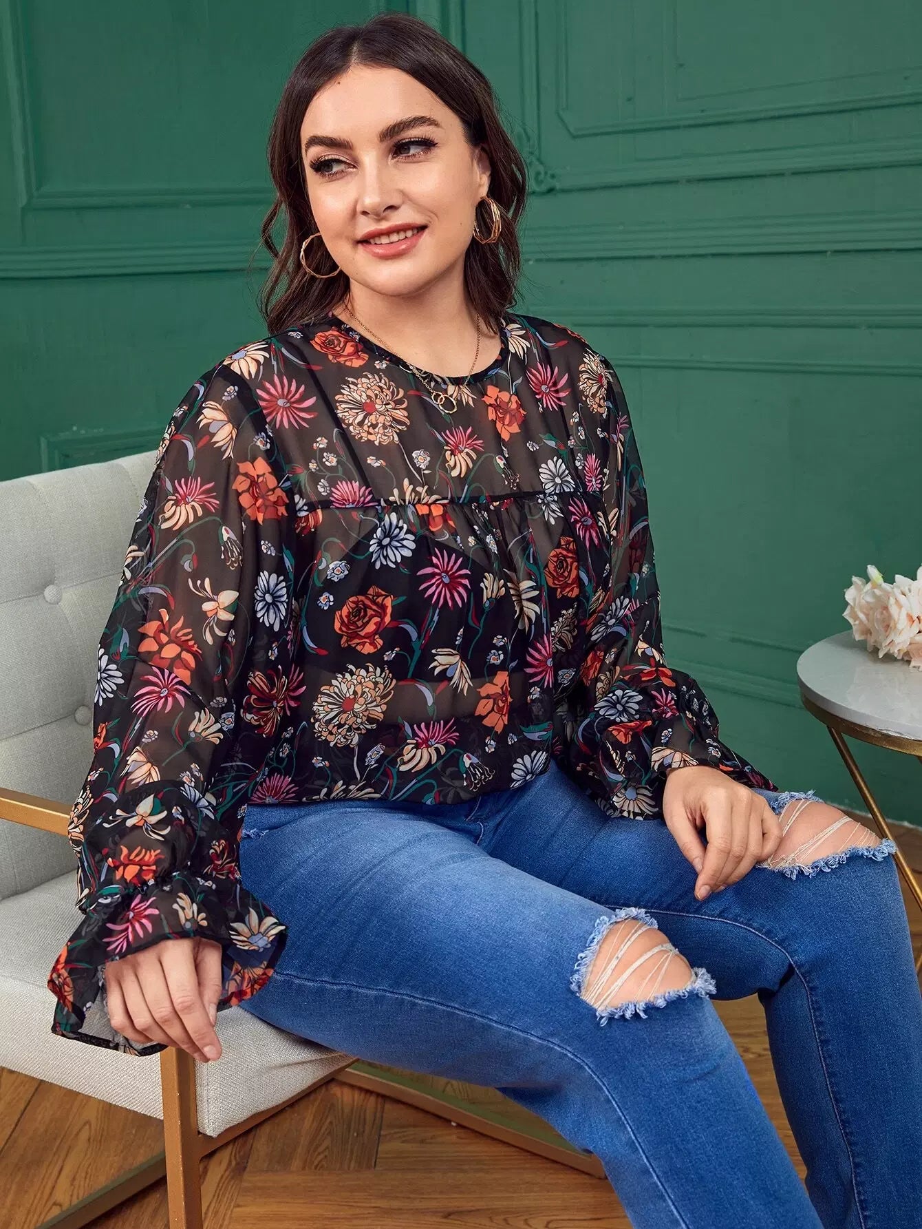 Plus Bell Sleeve Allover Floral Sheer Organza Top Without Bra
