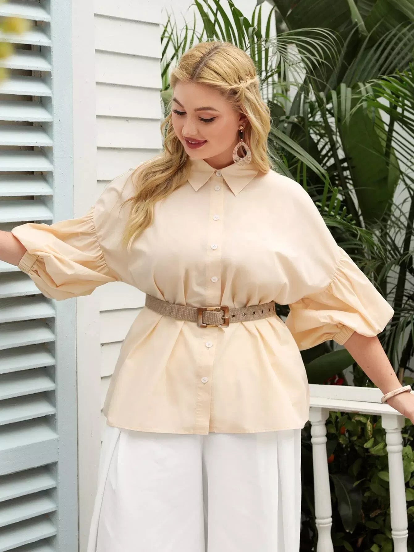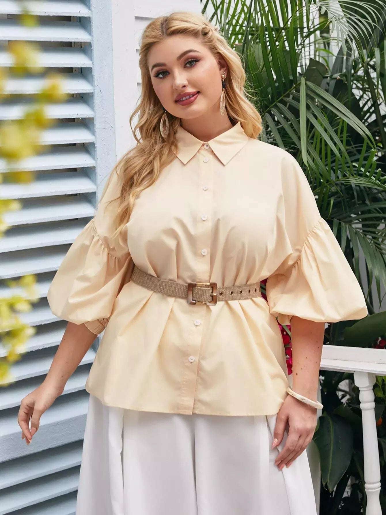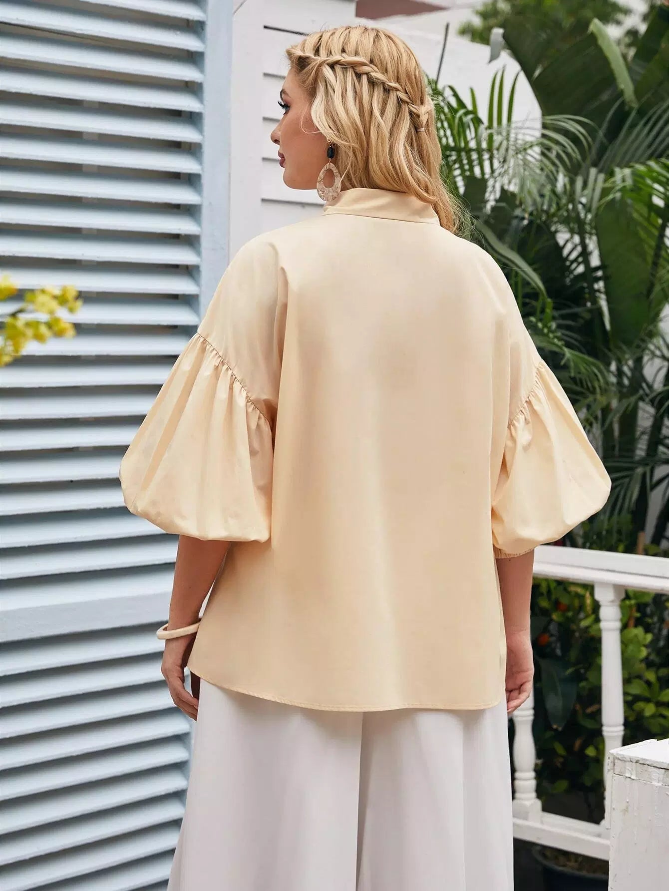 Plus Bishop Sleeve Solid Blouse Without Belt
