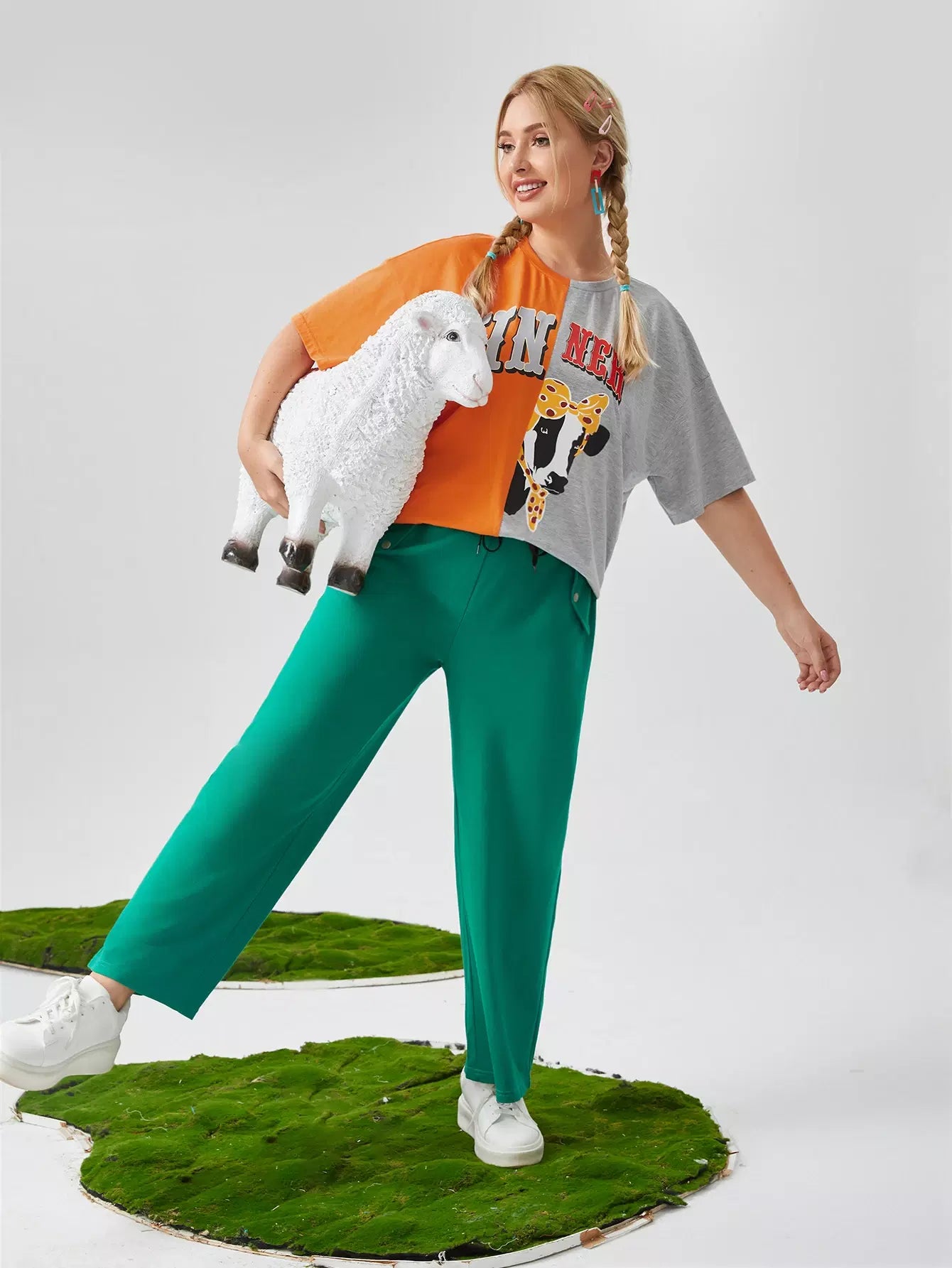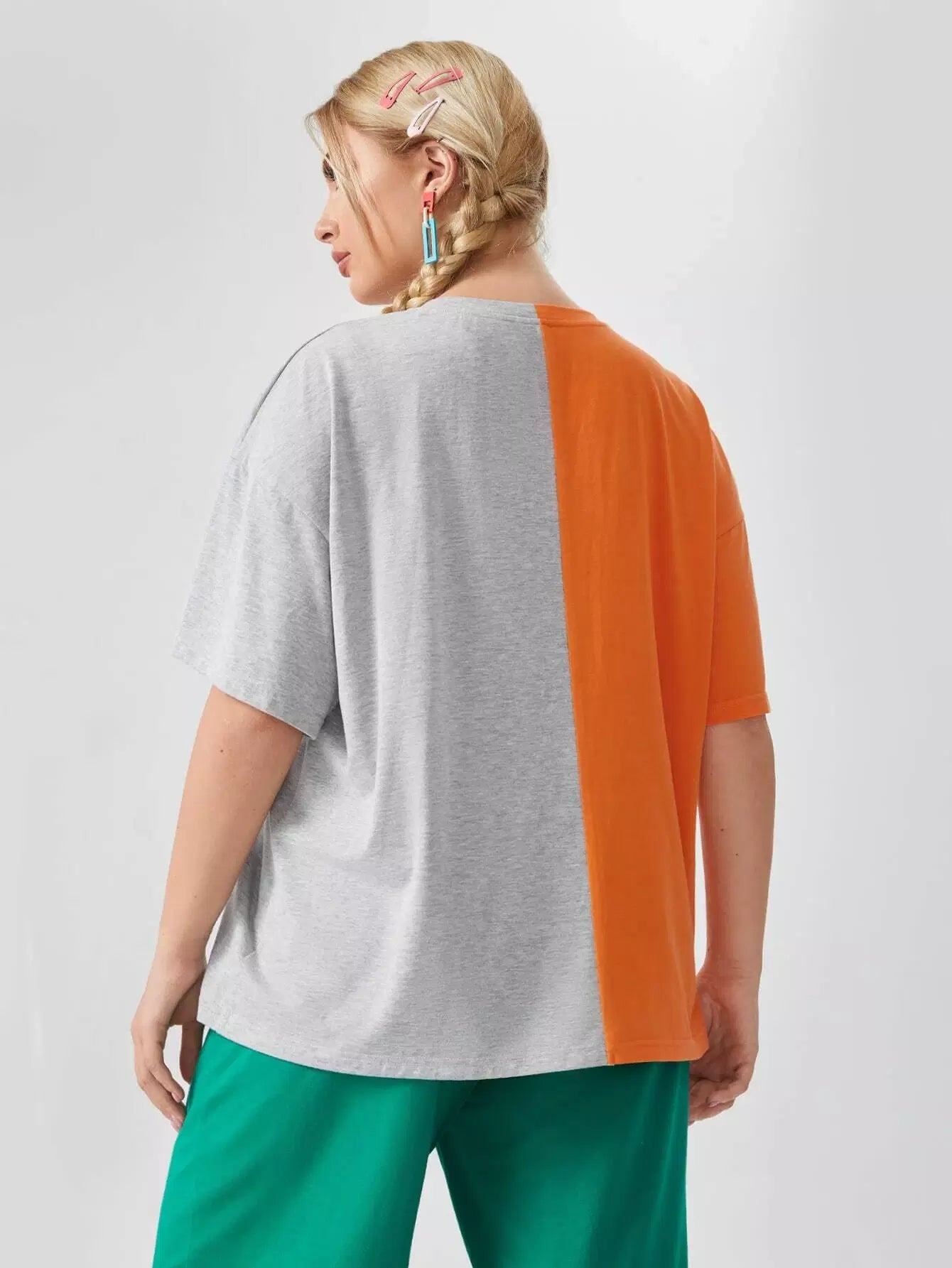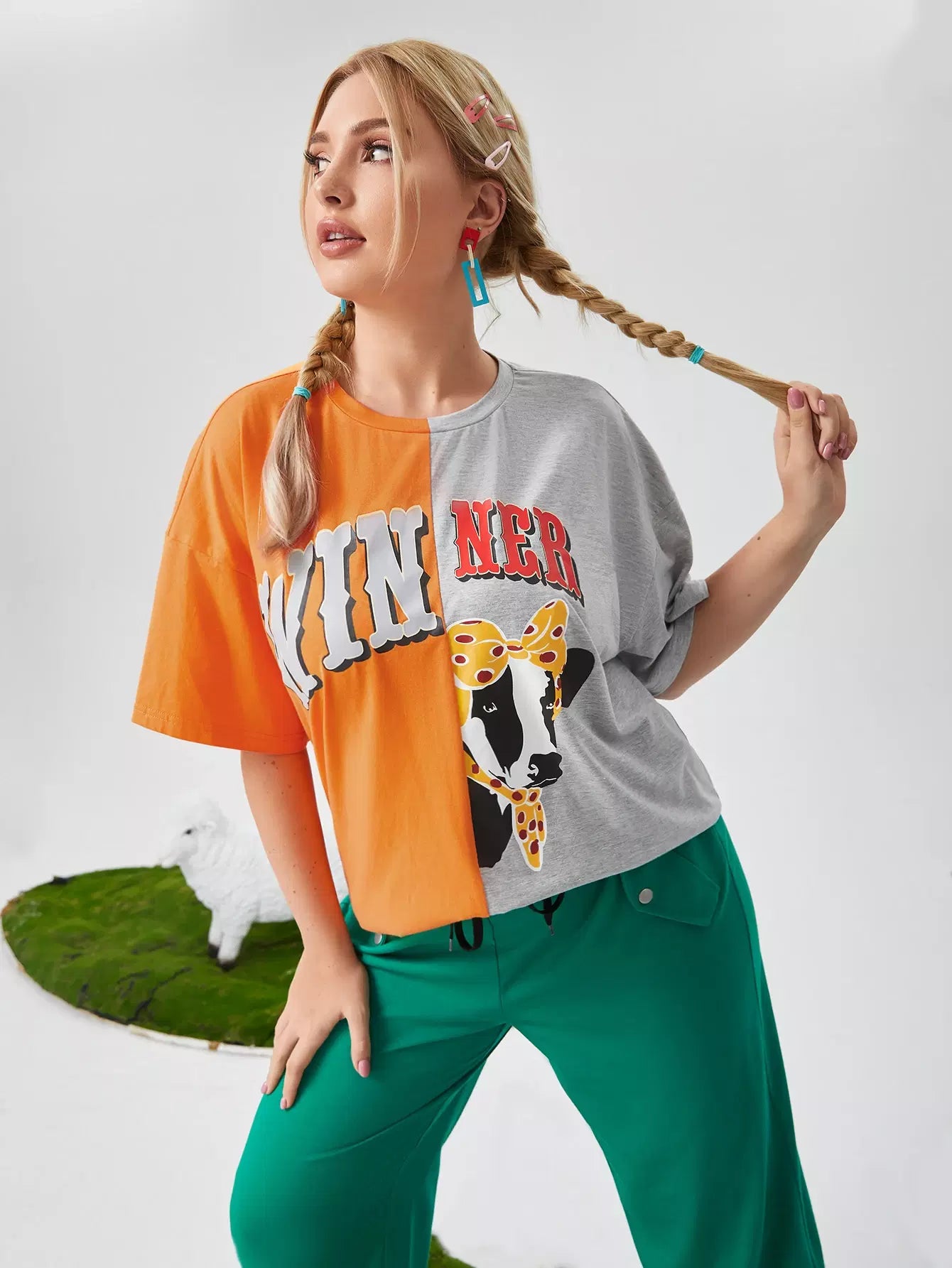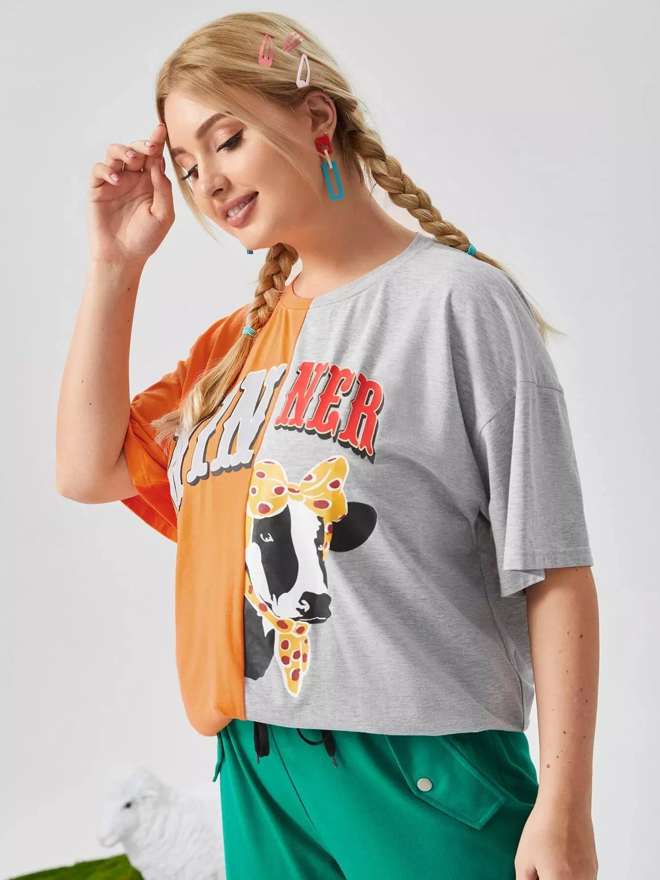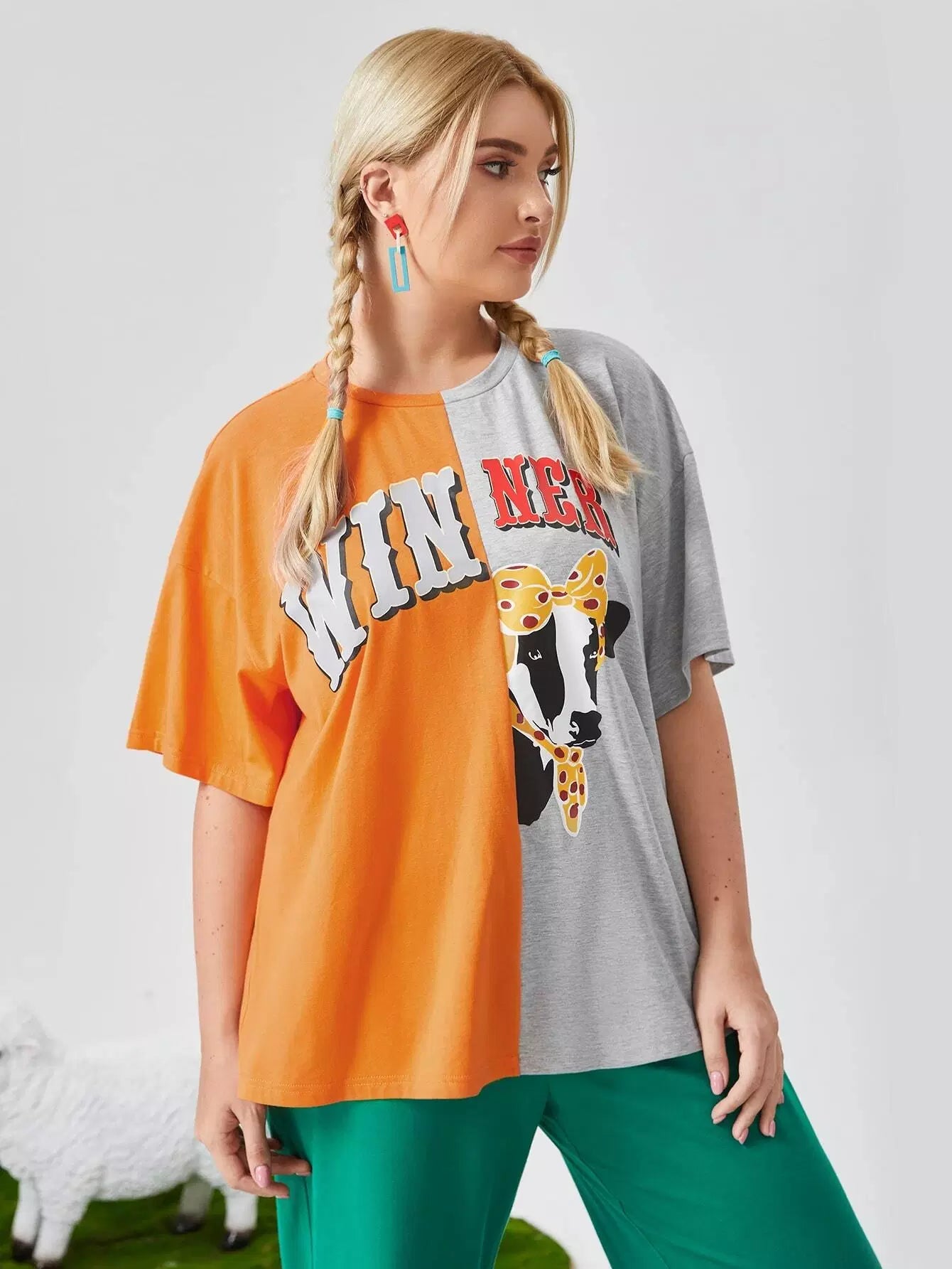 Plus Cartoon & Letter Print Drop Shoulder Tee