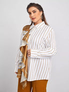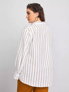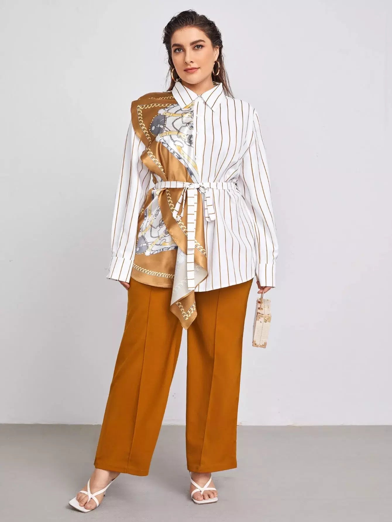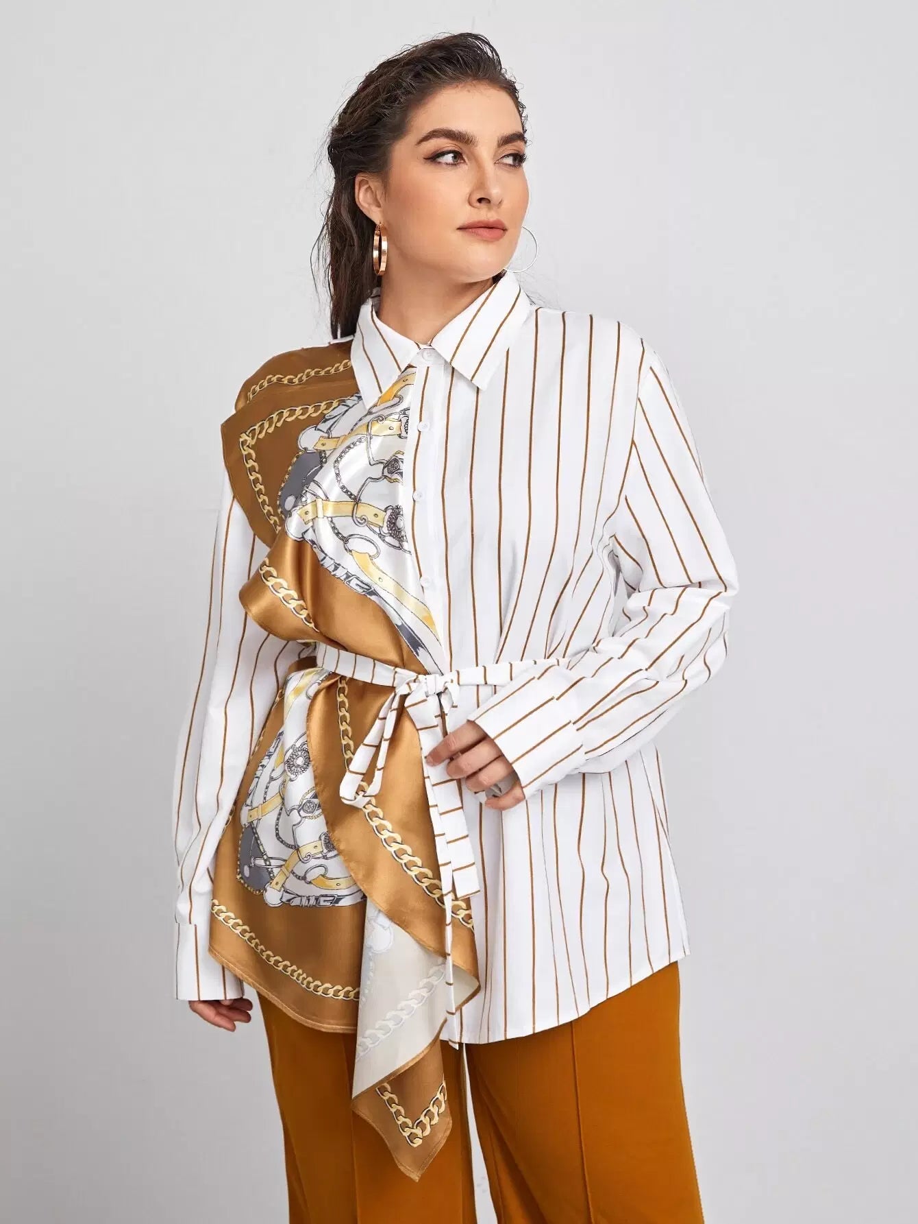 Plus Chain Print Ruffle Striped Blouse Without Belt